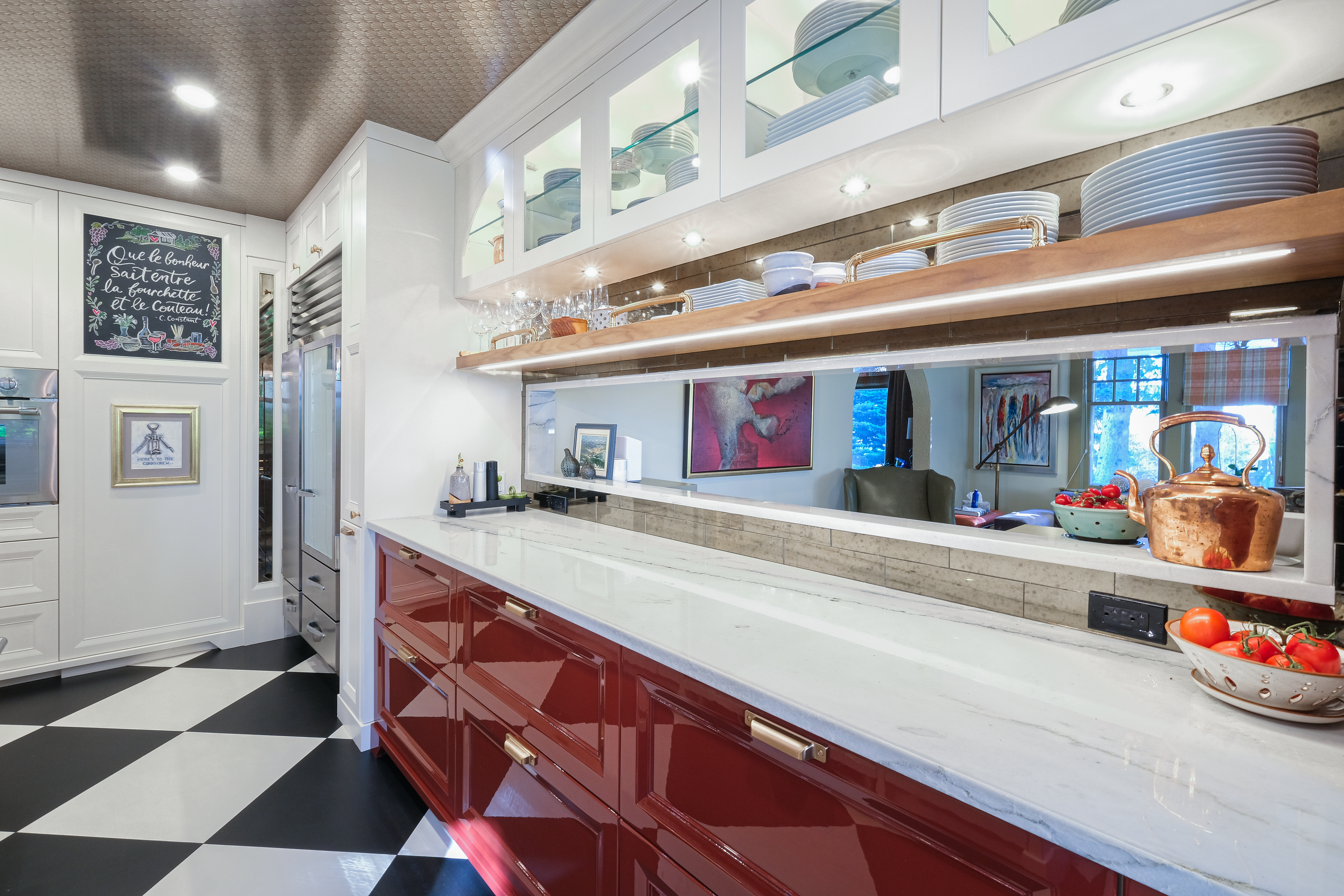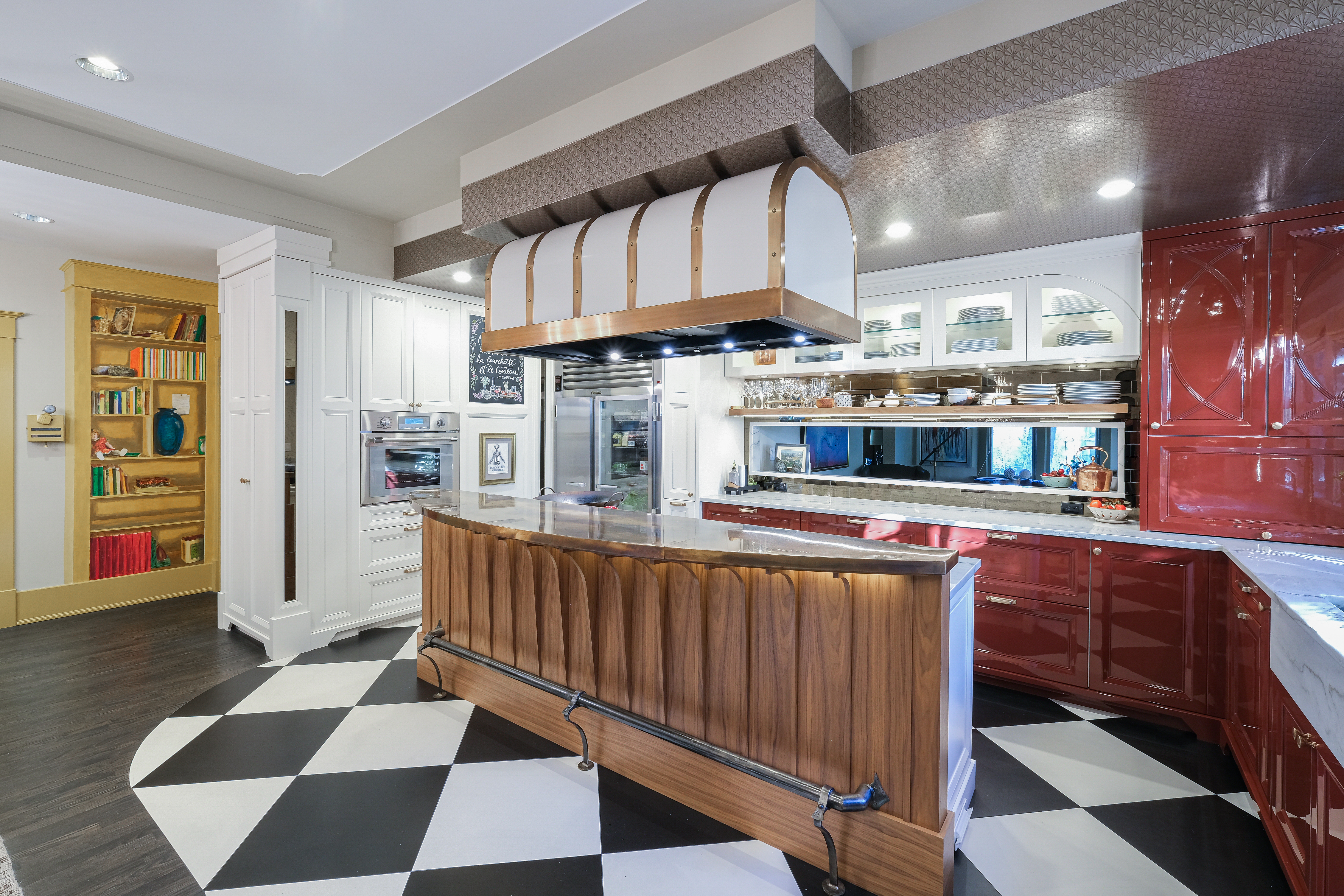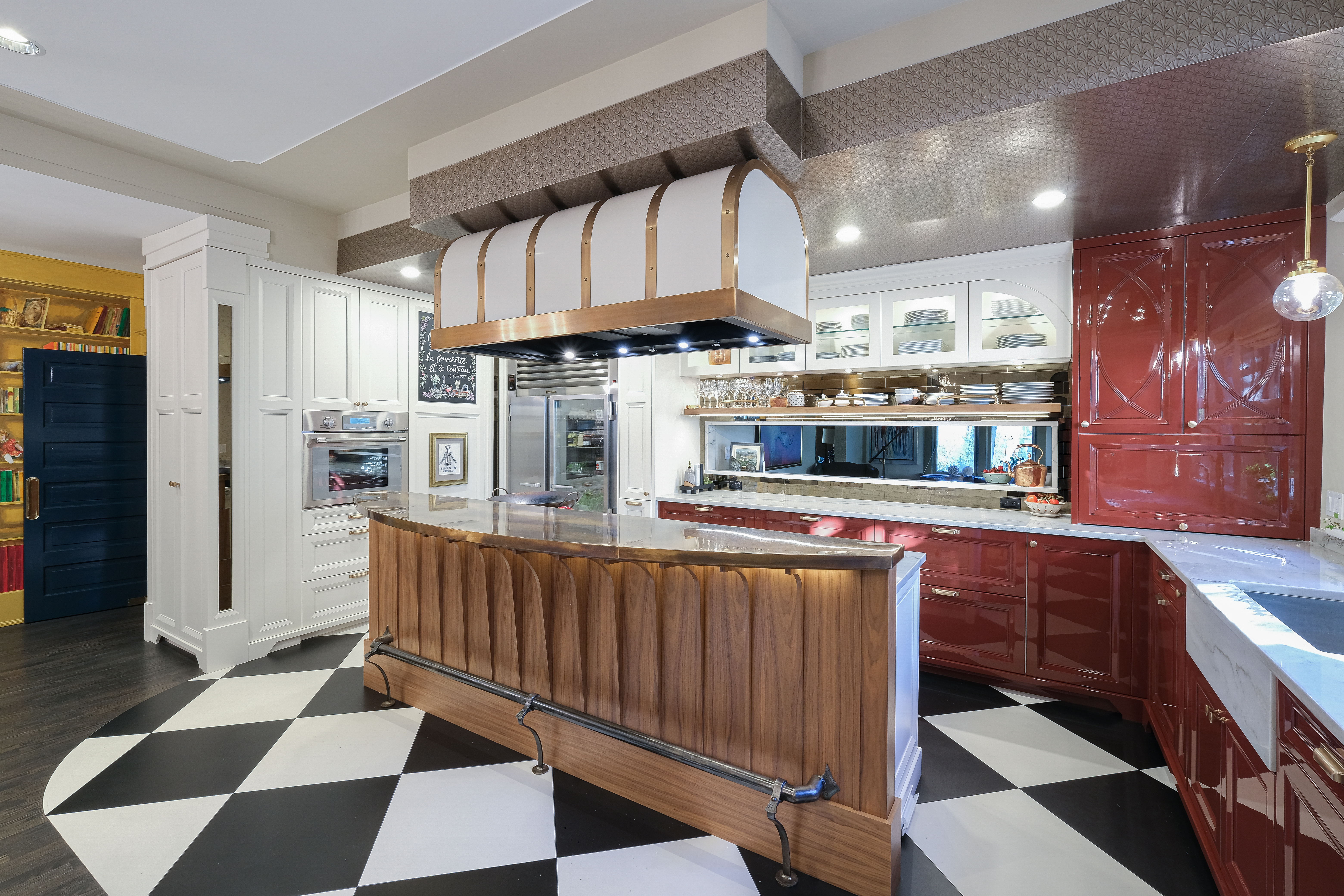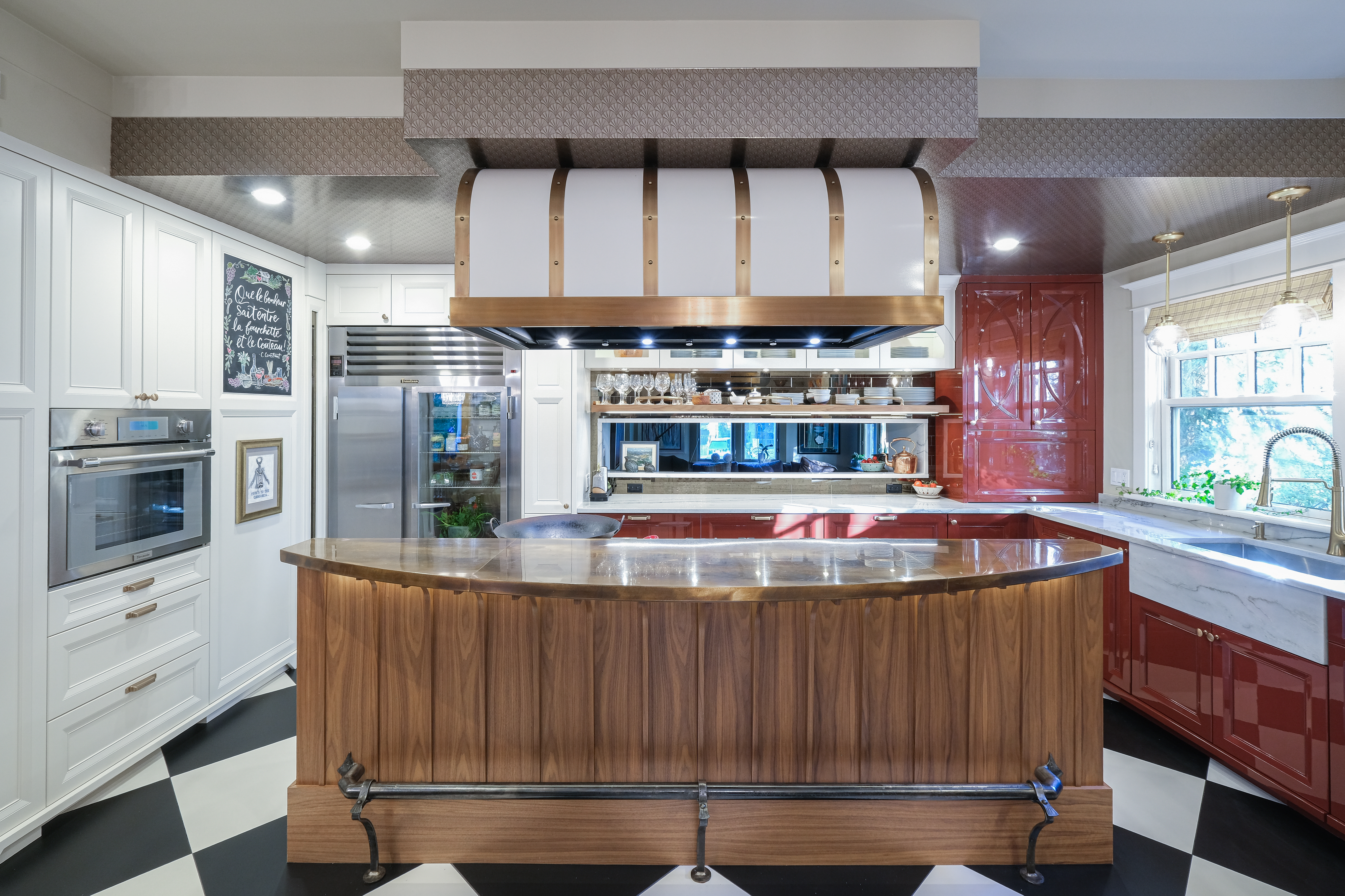 This French Bistro Kitchen blends bold personality with timeless European charm, bringing together high-gloss red cabinetry, sculptural custom details, and playful Parisian elements. Designed inside a 100-year-old home, the space balances dramatic colour, soft curves, and refined craftsmanship. From lacquered cabinets and a custom barrel hood to oversized checkered flooring and metallic ceiling wallpaper, every detail adds character while honouring the home’s rich history.