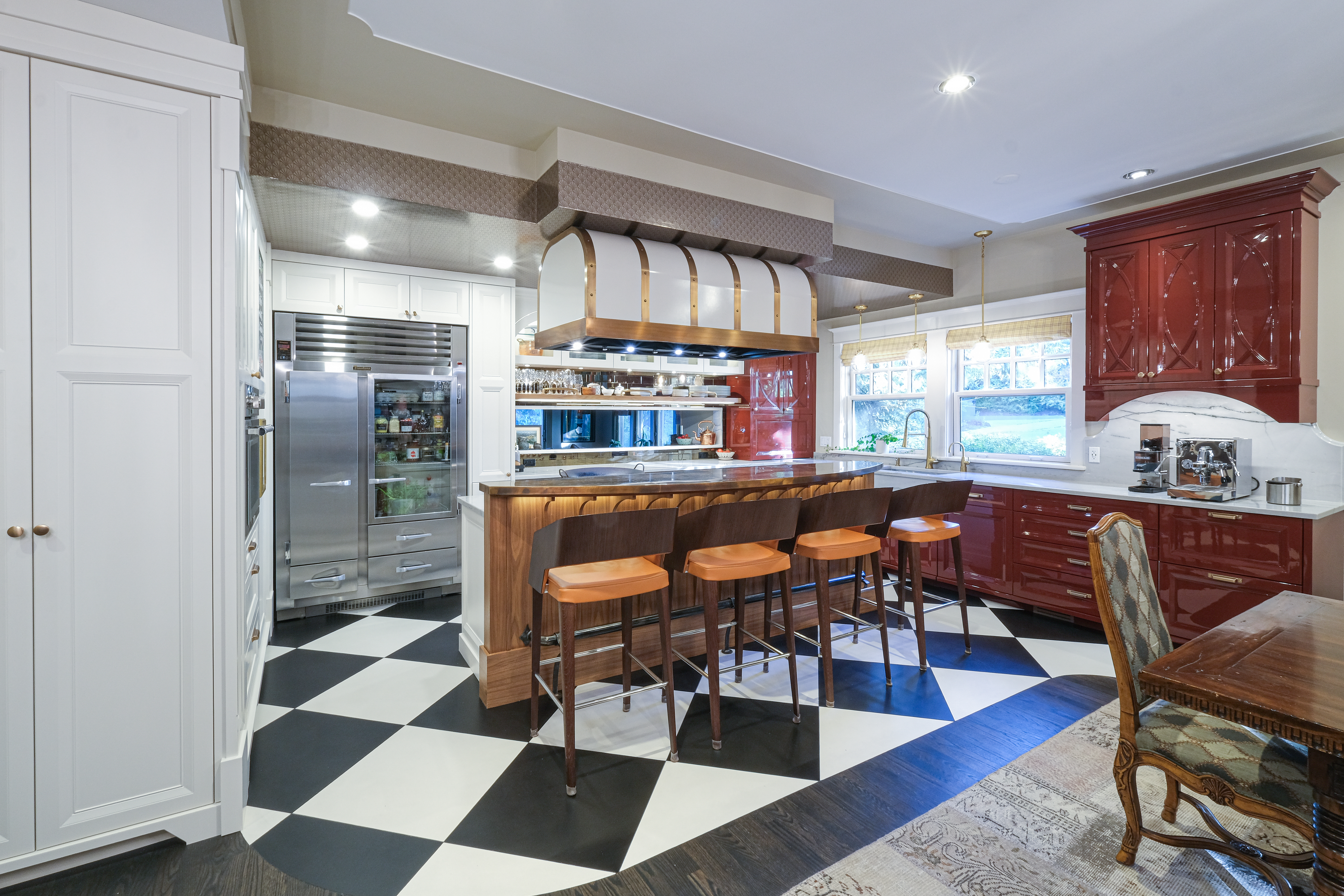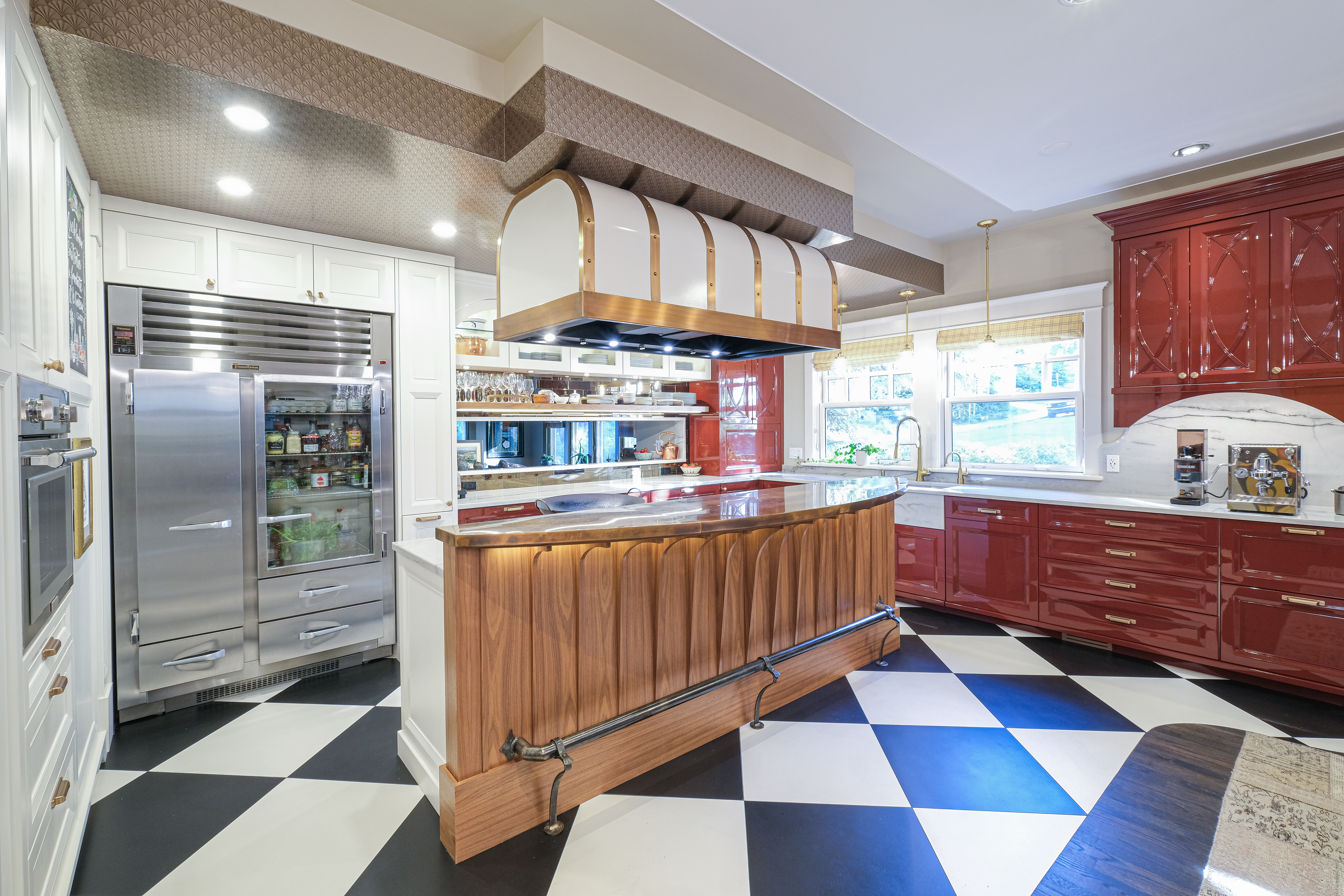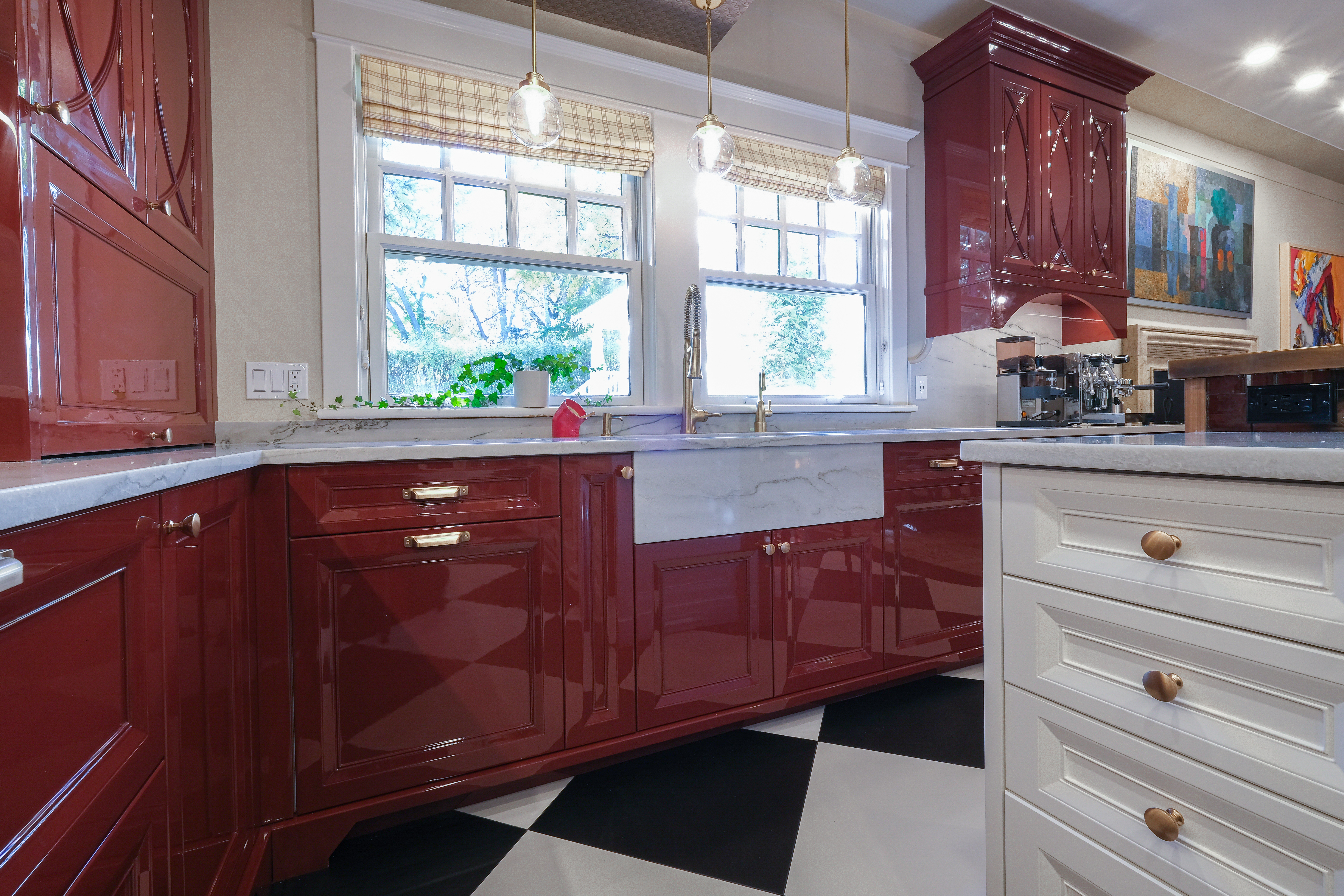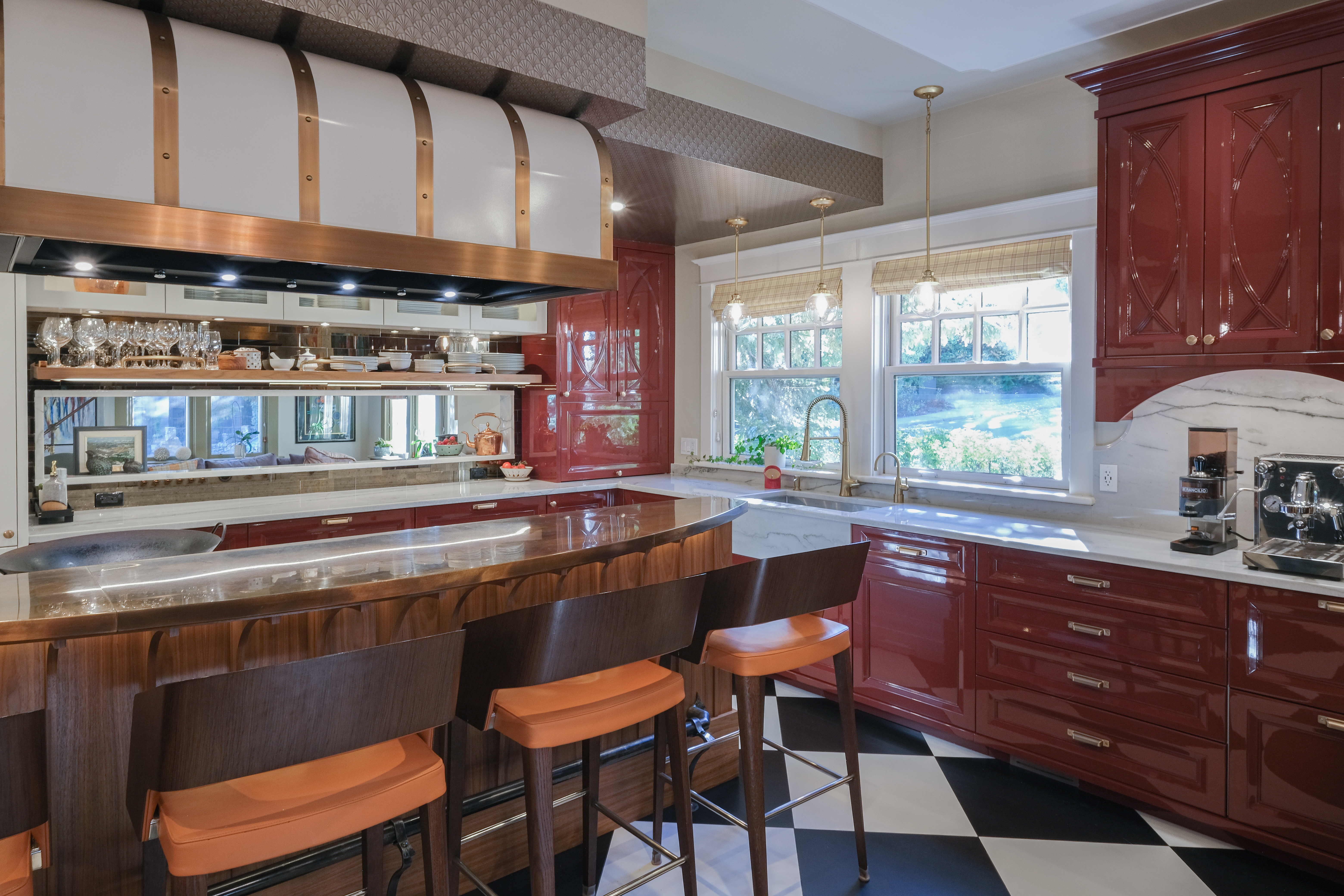 This French Bistro Kitchen blends bold personality with timeless European charm, bringing together high-gloss red cabinetry, sculptural custom details, and playful Parisian elements. Designed inside a 100-year-old home, the space balances dramatic colour, soft curves, and refined craftsmanship. From lacquered cabinets and a custom barrel hood to oversized checkered flooring and metallic ceiling wallpaper, every detail adds character while honouring the home’s rich history.