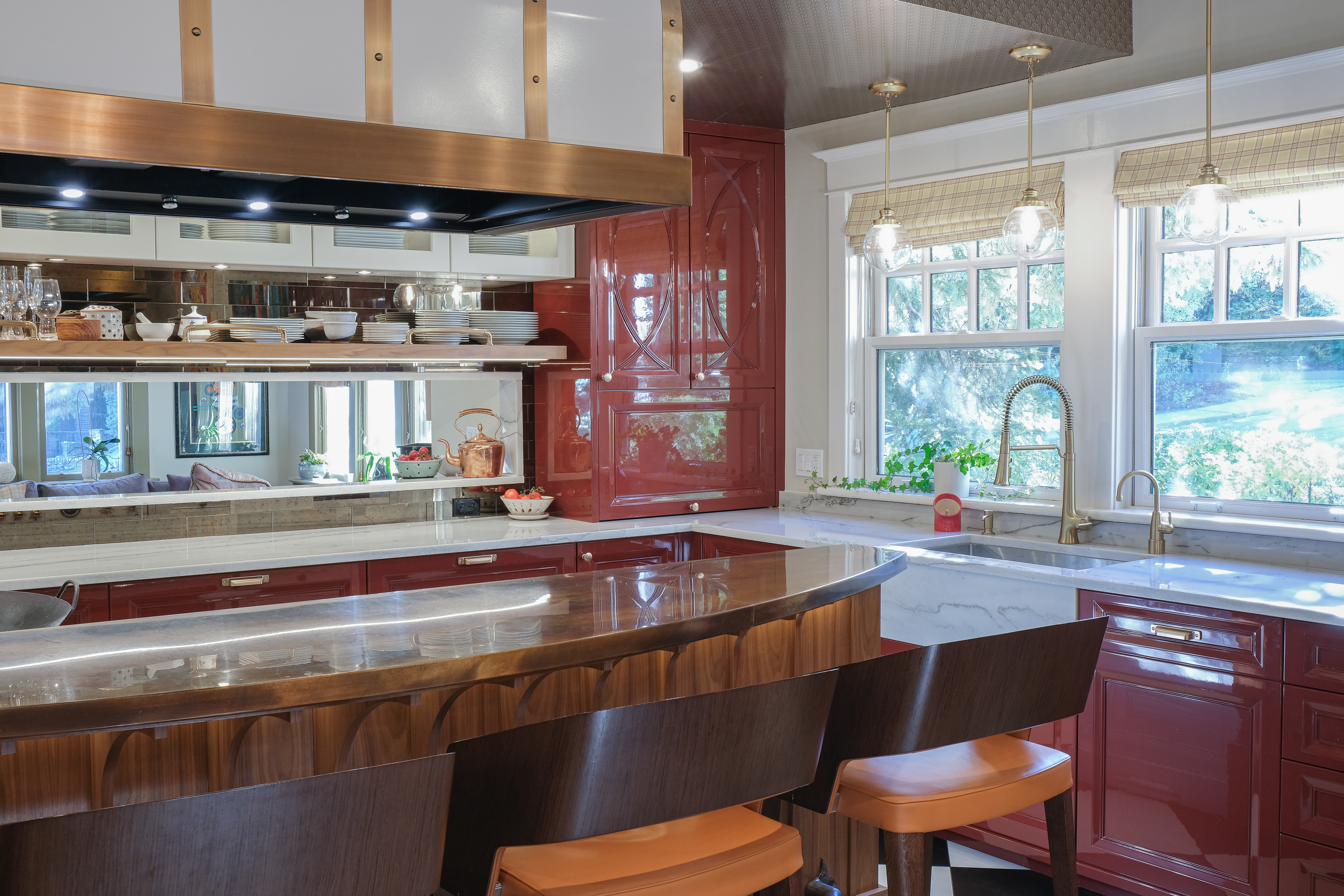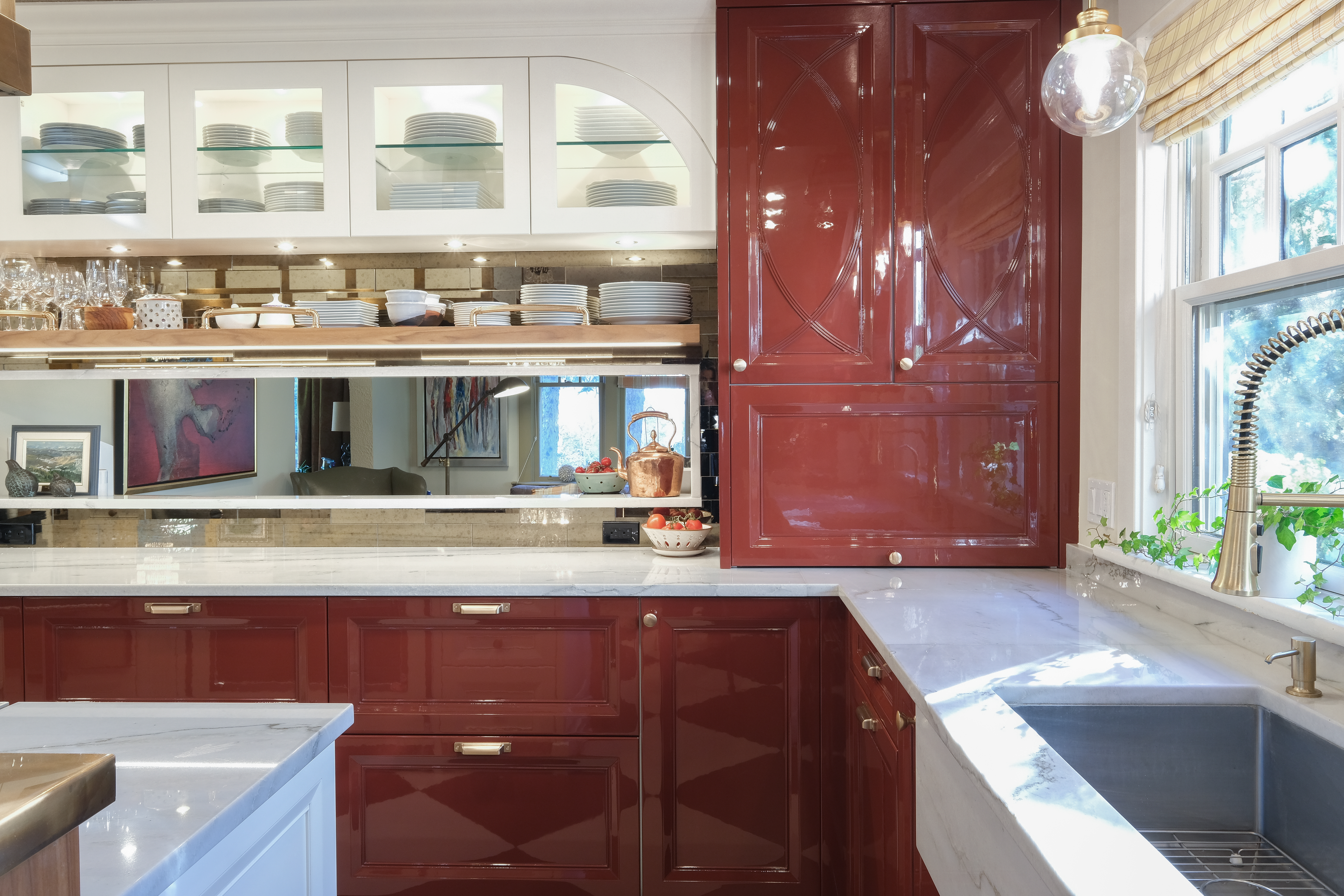 Dramatic red cabinetry pairs with soft lacquered cabinets colour-matched to the Bertazzoni range.
