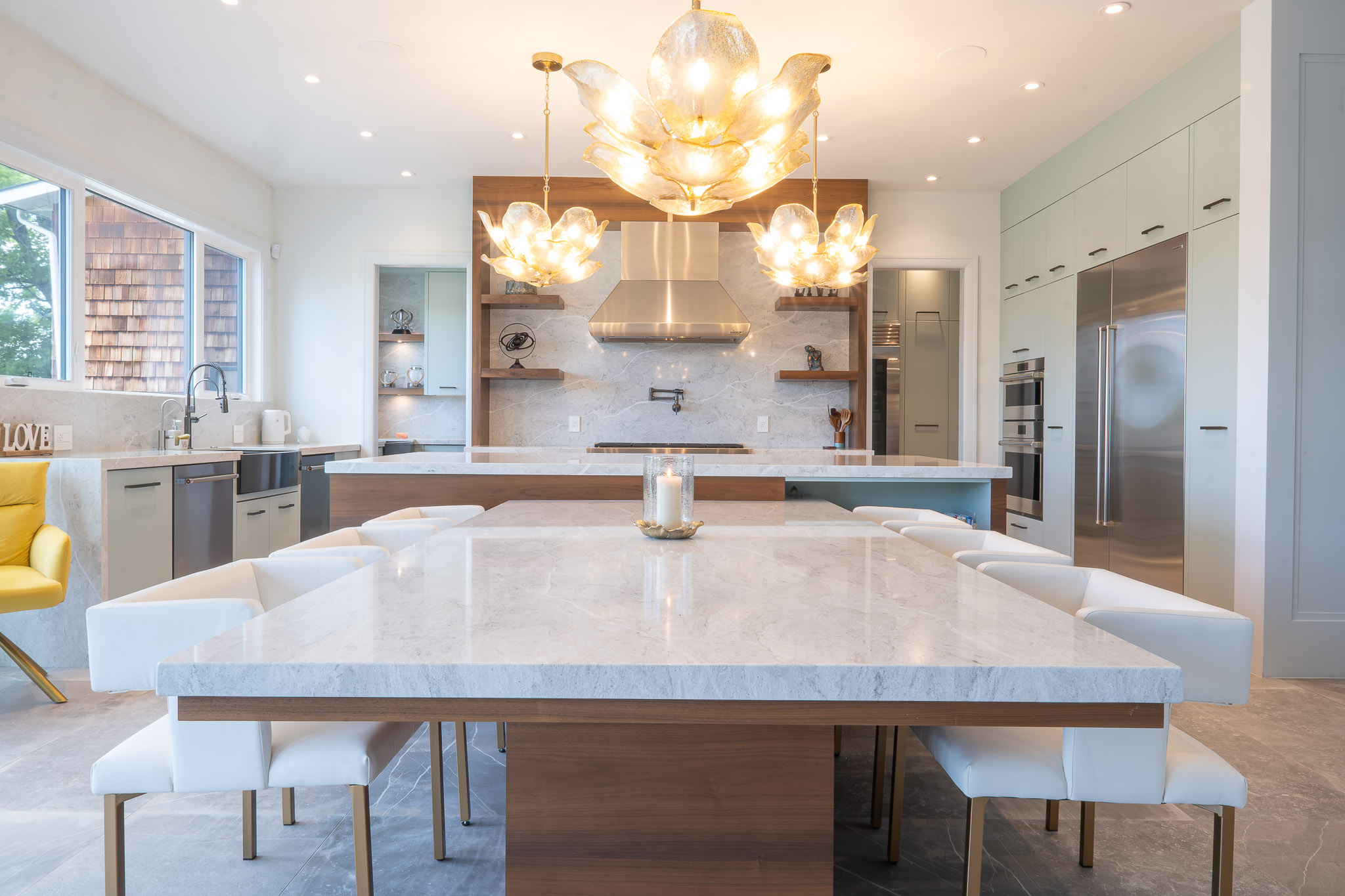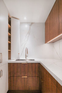Panel-ready refrigerators and dishwashers blend into the cabinetry, while built-in coffee stations and appliance garages keep everyday essentials close but out of sight. Walk-through prep pantries and hidden storage walls add function without adding visual noise.