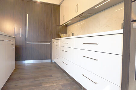 Door styles and profiles set the tone first. Flat slab fronts create a seamless, architectural feel, while integrated pulls or clean-lined hardware keep the look crisp and uncluttered. Balanced proportions across drawers, uppers, and tall storage help the room feel larger, quieter, and more refined.