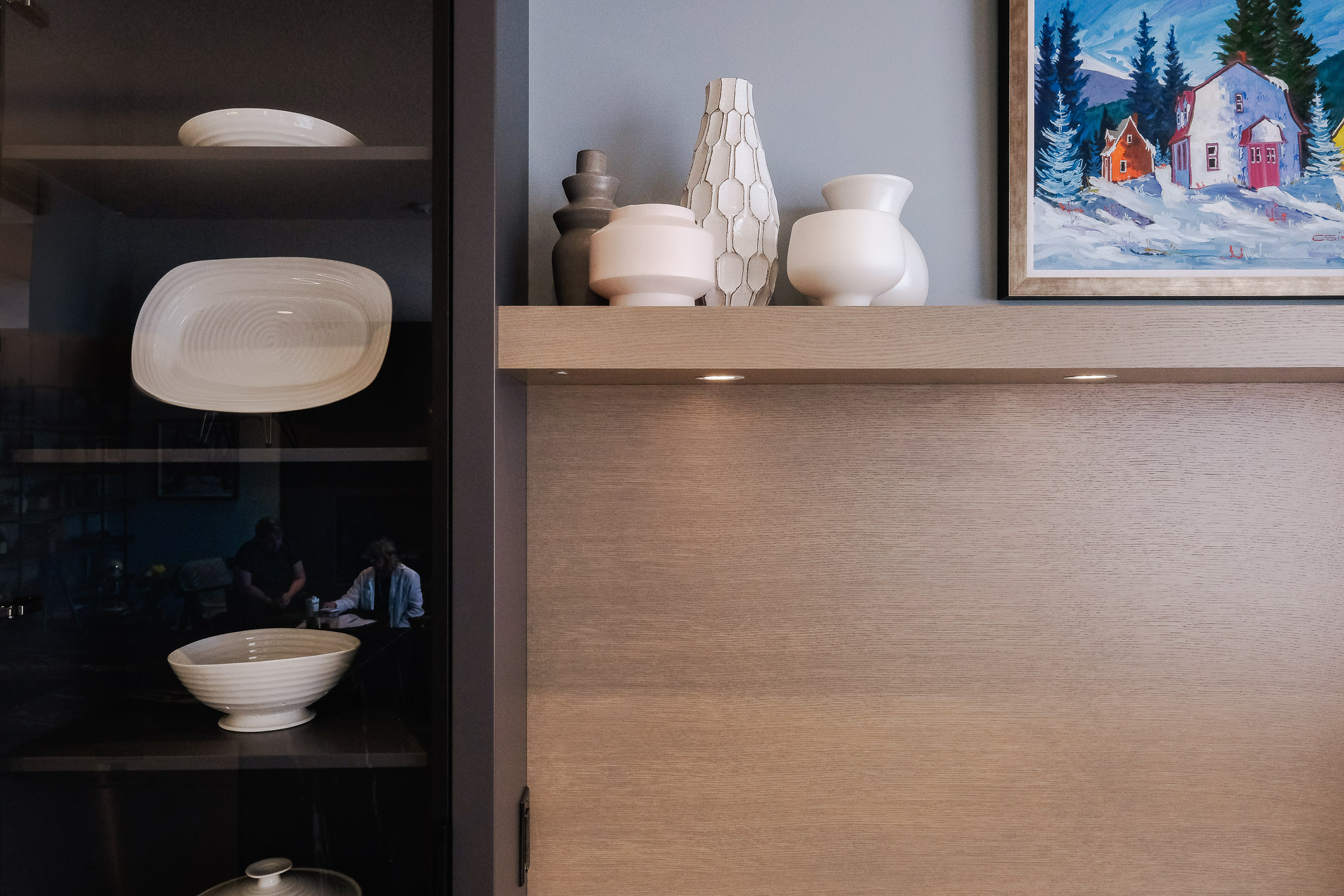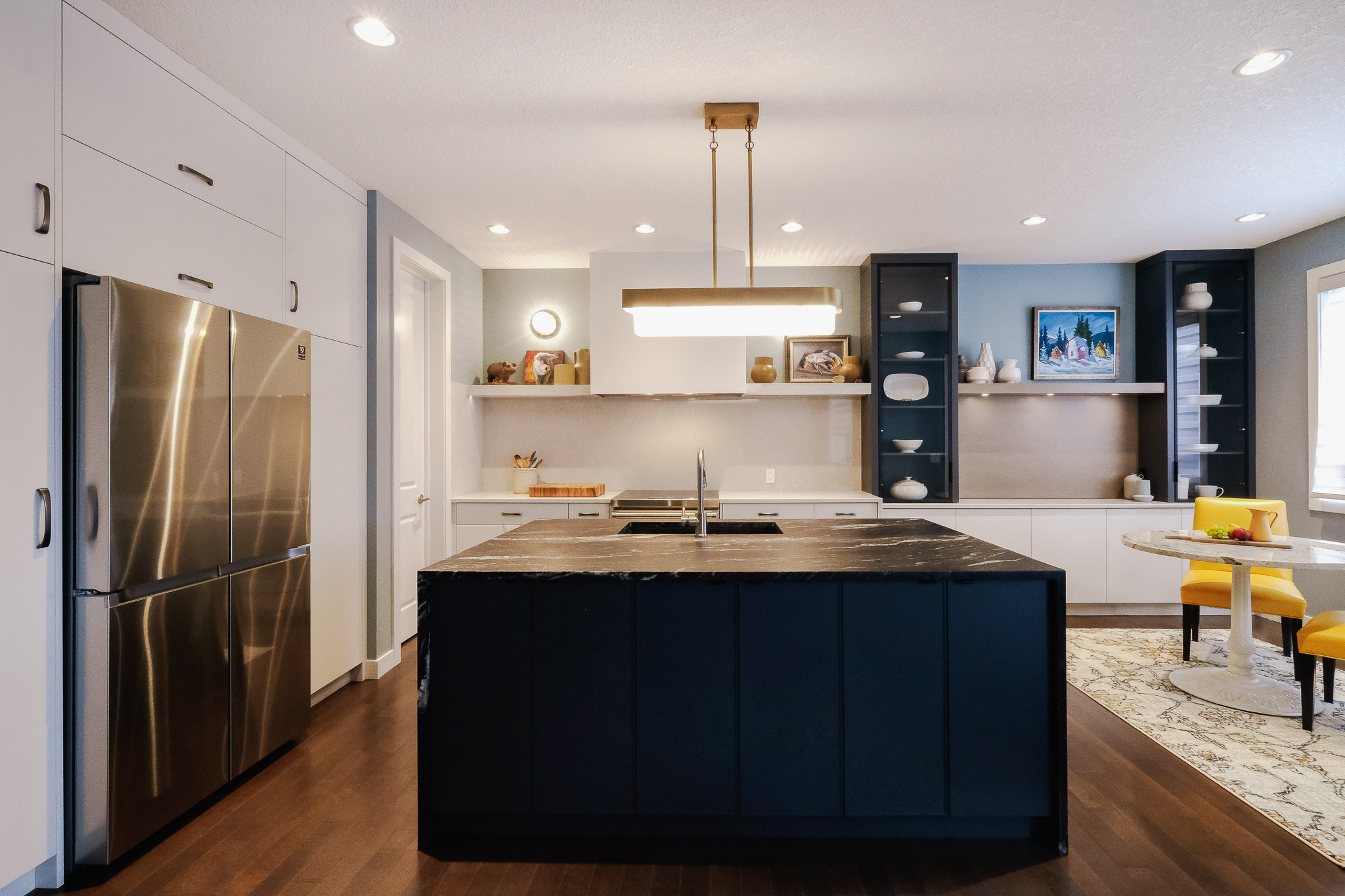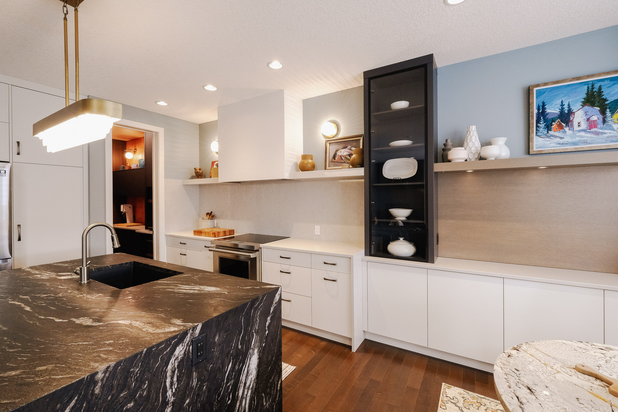 We designed and installed full-height kitchen cabinetry that wraps integrated appliances in a seamless, functional layout. The walk-through pantry adds surprising character and smart utility—with a hidden spice rack, coffee station, copper-toned backsplash, and a bookshelf for cookbooks and classics alike. Dining room cabinetry adds storage and style beneath a curated display wall that brings balance to the space.