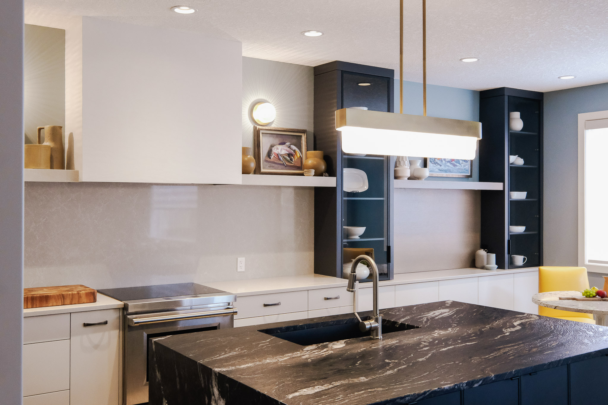 From full-height cabinetry that seamlessly wraps integrated appliances to a walk-through prep pantry designed for real life, every feature in this home serves a purpose. The pantry includes a built-in coffee station, a custom bookshelf for cookbooks and keepsakes, and a hidden spice rack that keeps the space both beautiful and efficient. In the dining area, low-profile cabinetry blends storage with style, maintaining a clean, minimalist aesthetic that aligns with the home’s mid-century modern influence. Thoughtful, functional, and quietly refined—this project is all about design that supports the everyday.