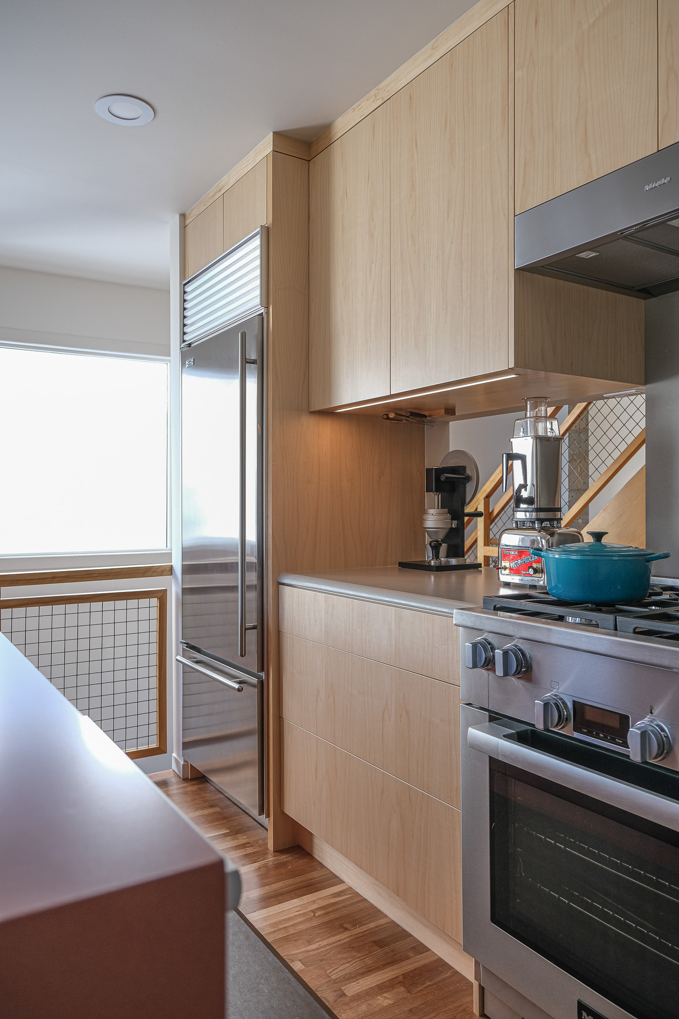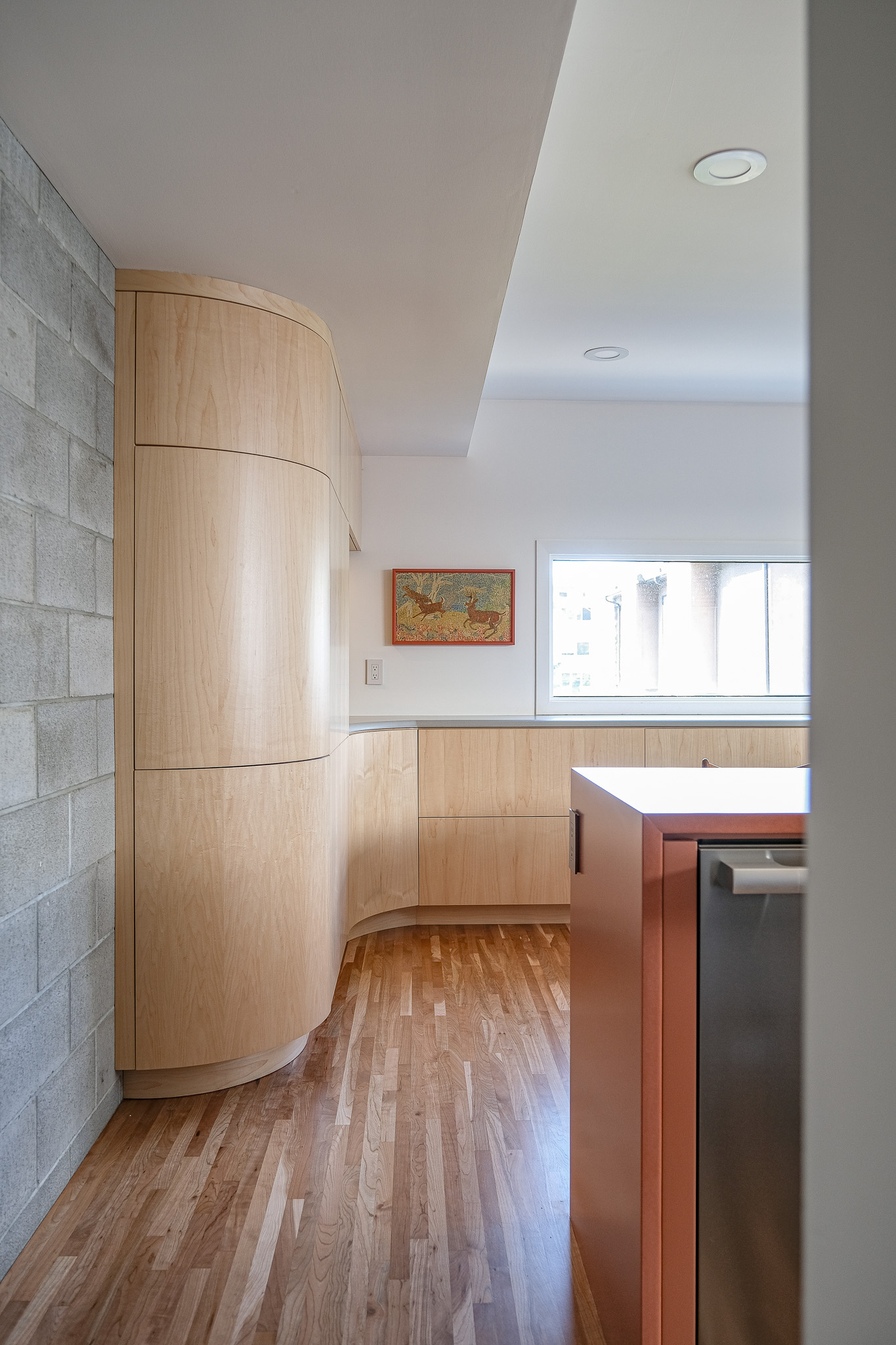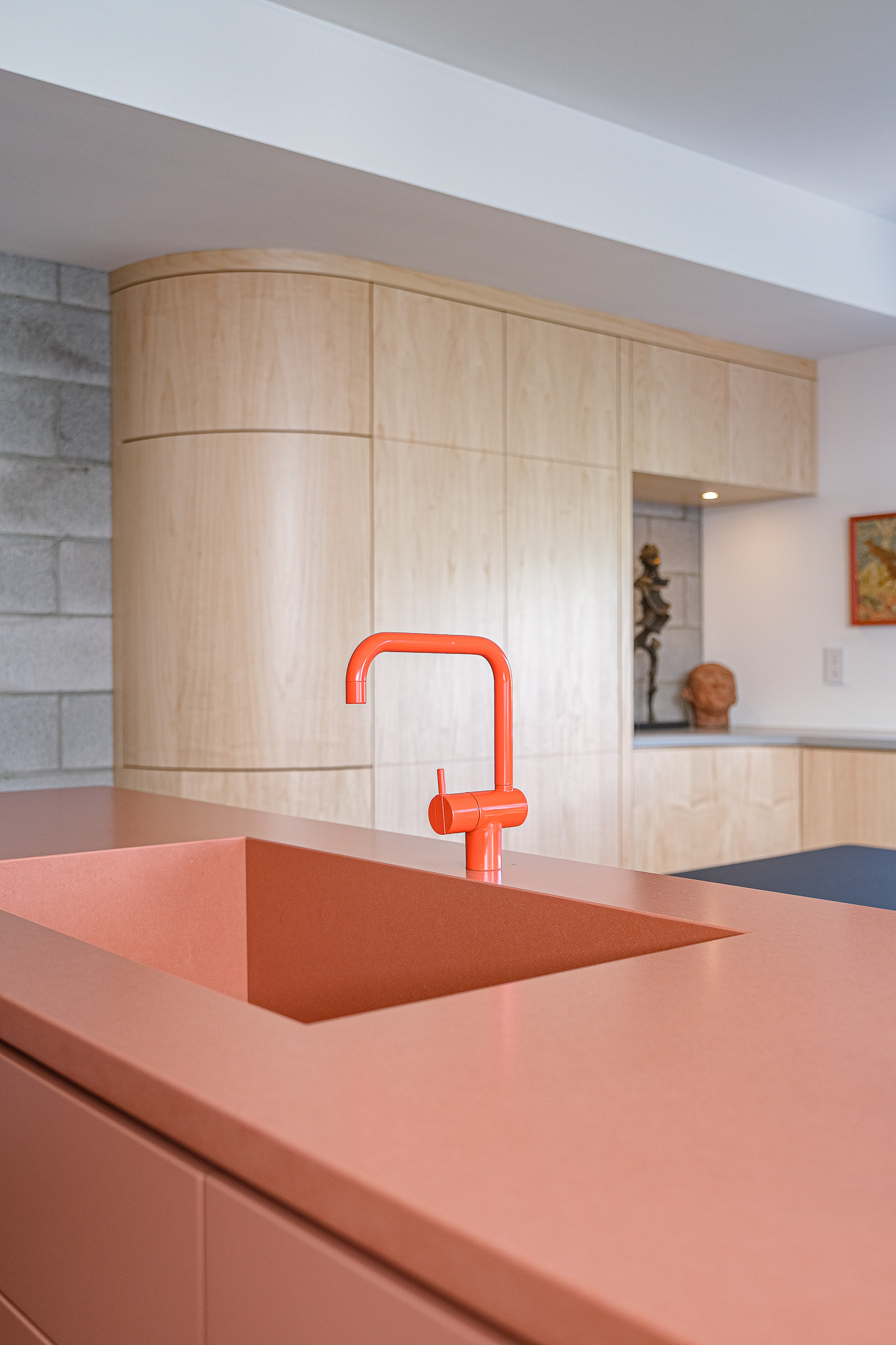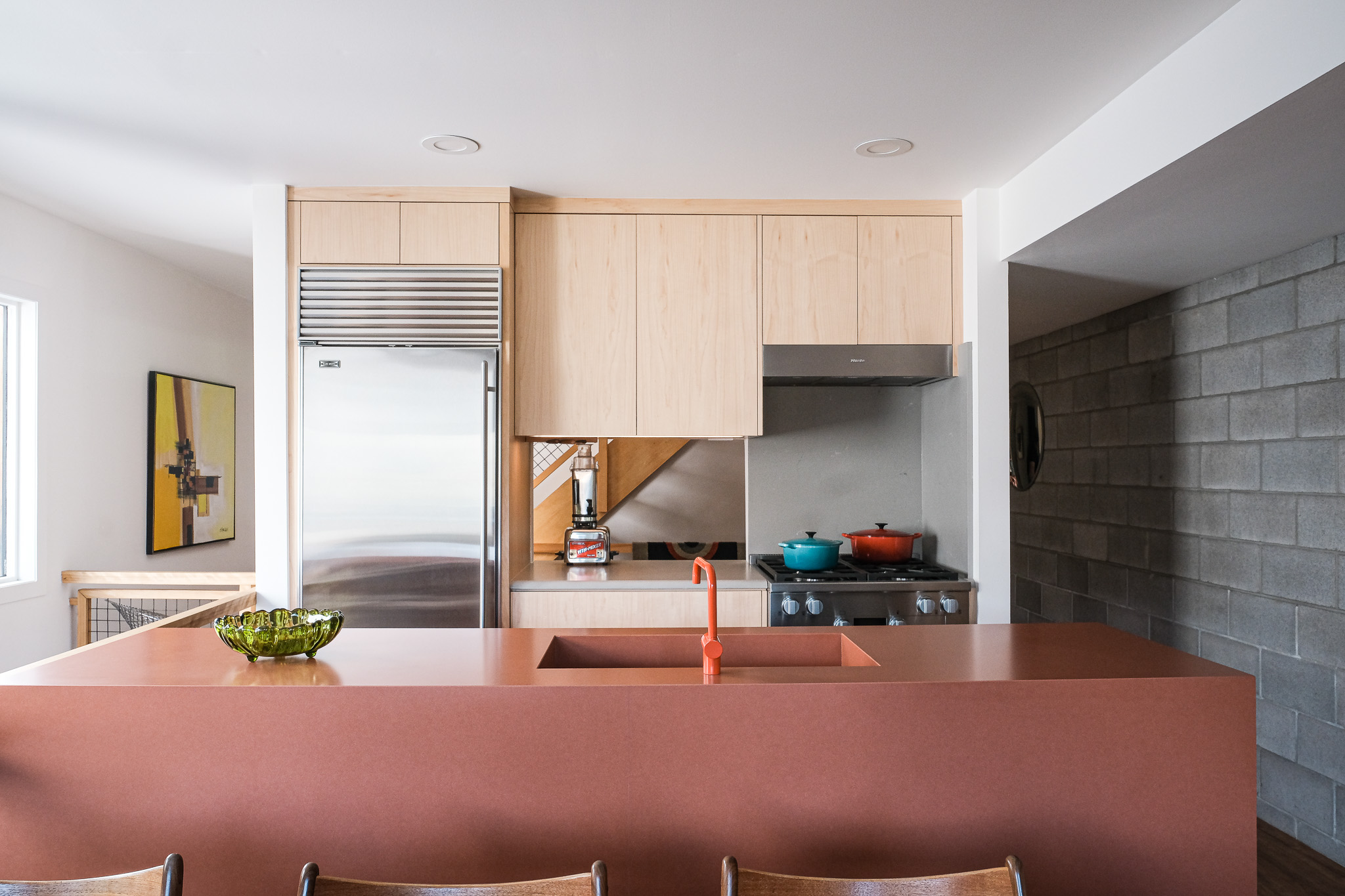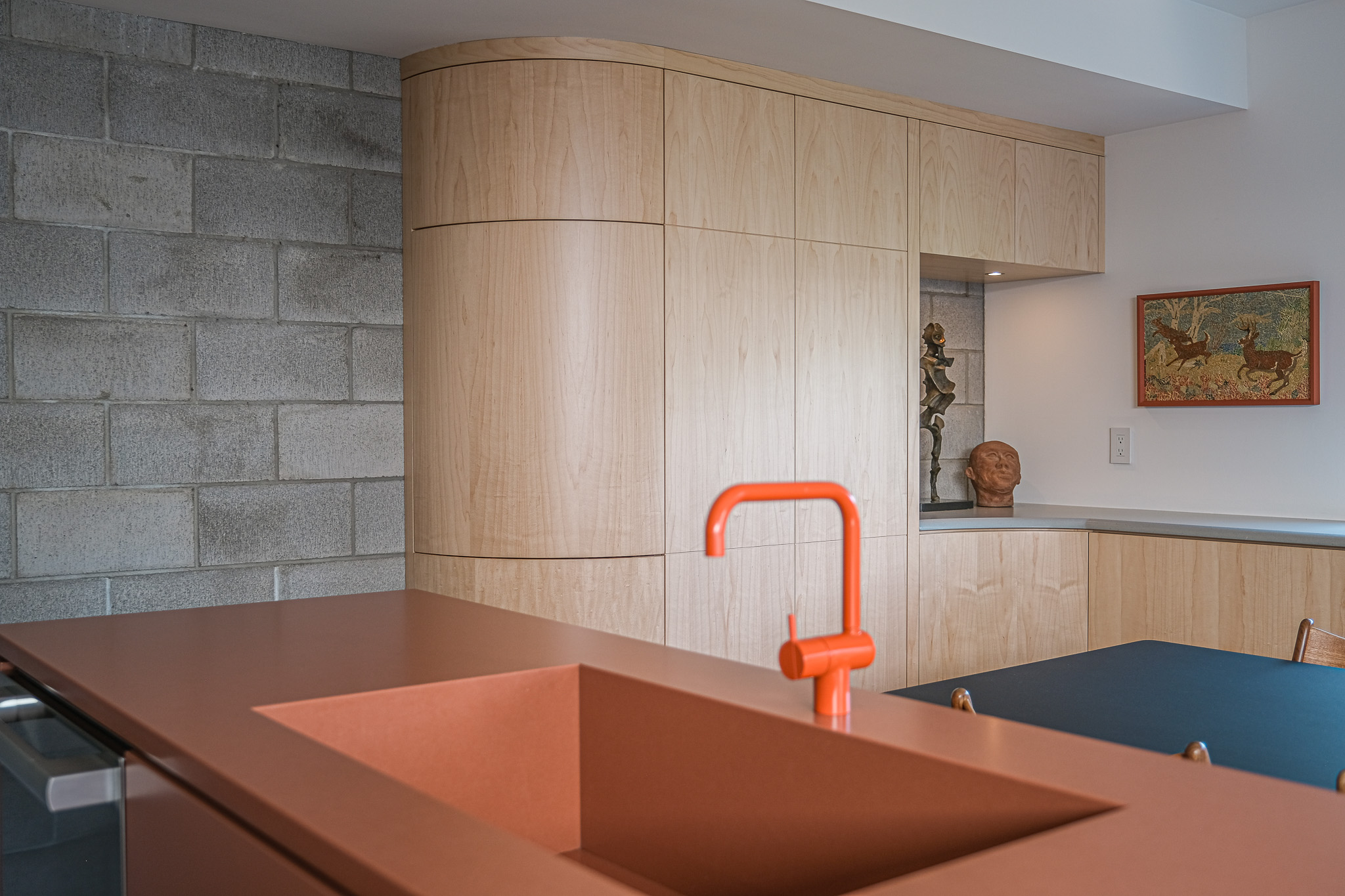 This unique space embraces mid-century modern style by doing away with handles and introducing beautifully curved custom cabinetry. The touch latch offers a sleek, streamlined design, free from distractions (or snags), combining minimalist functionality with modern flair. We’re absolutely in love with the result.