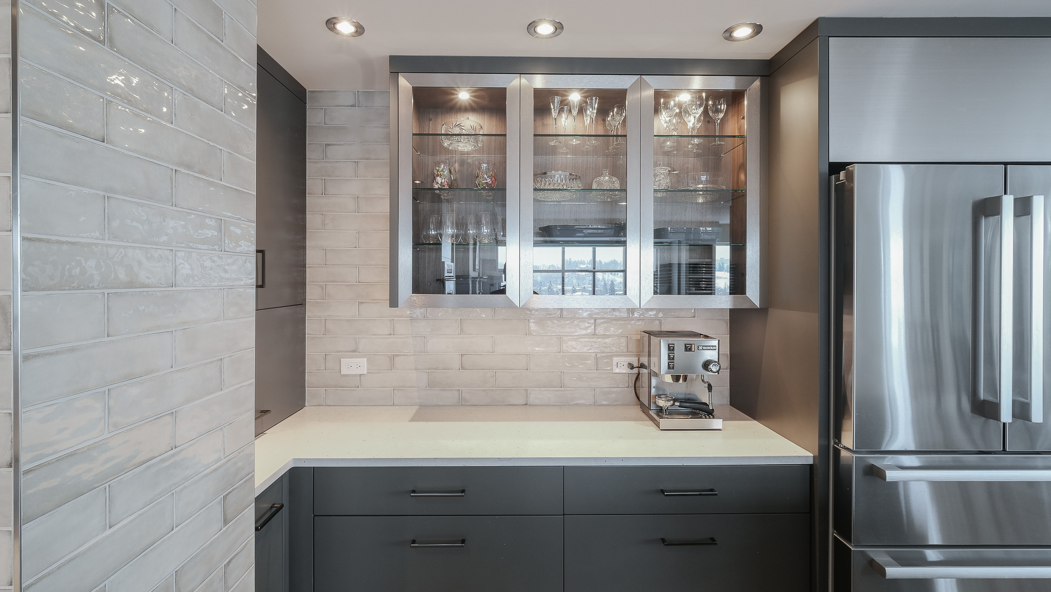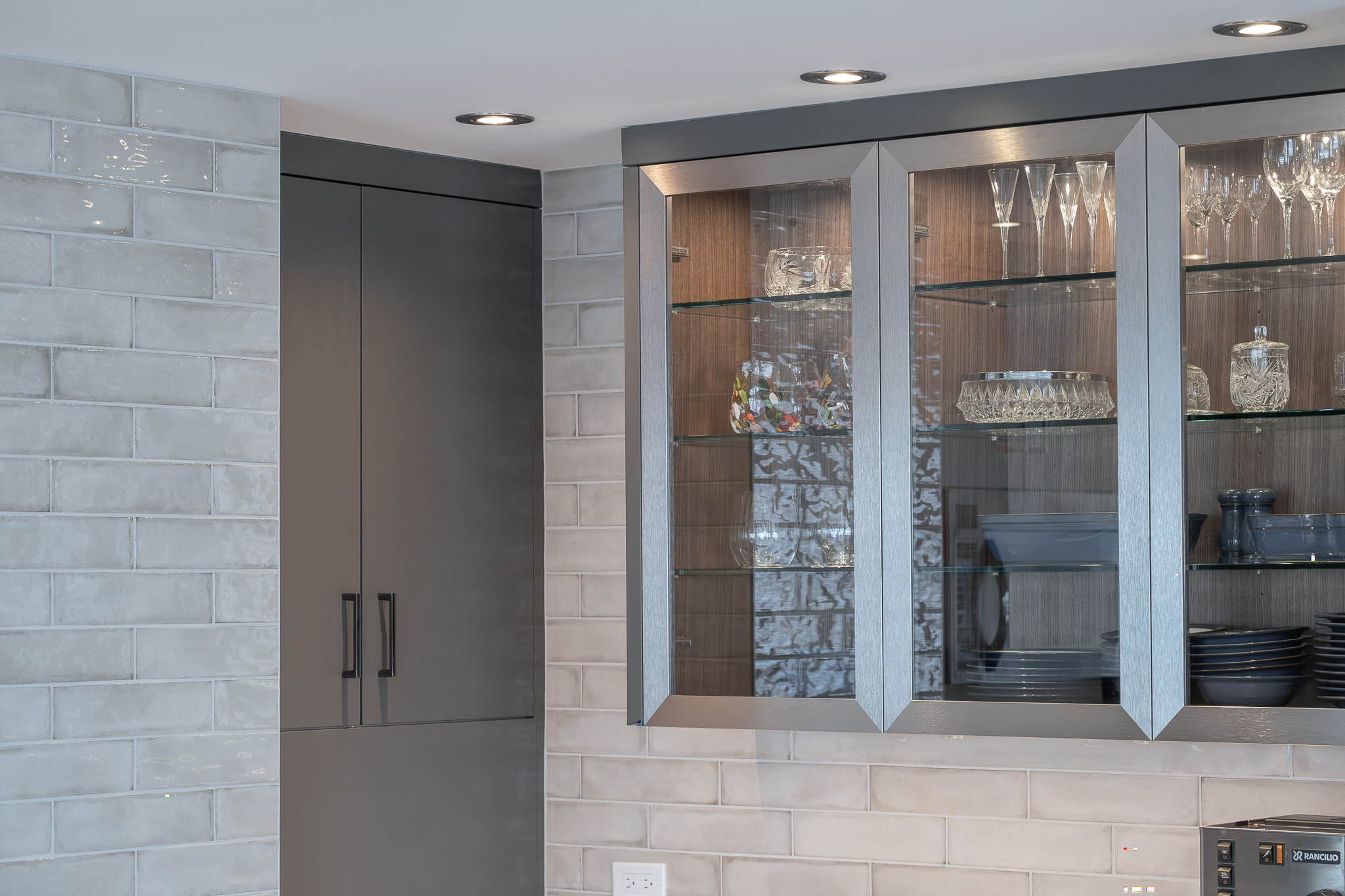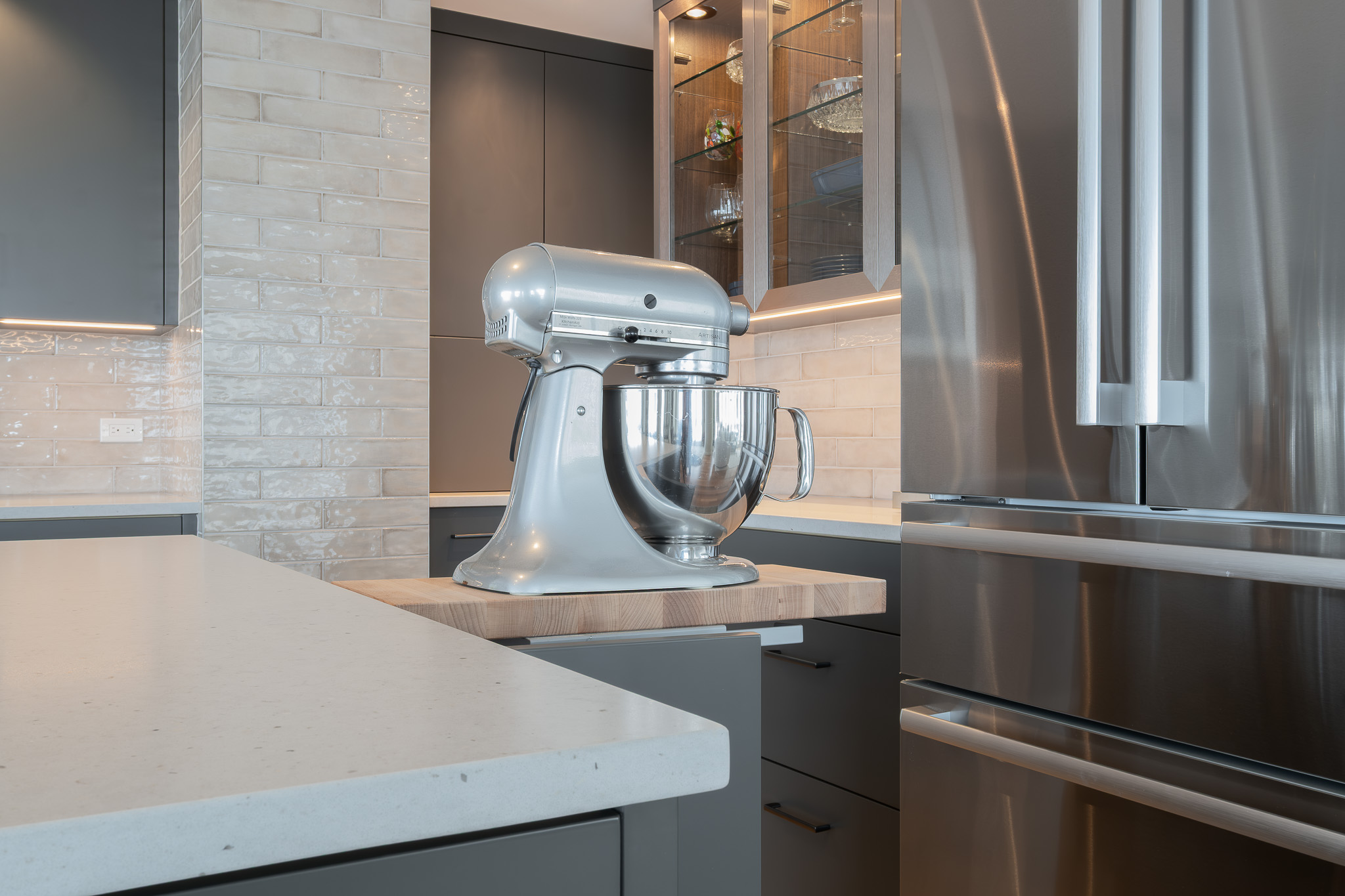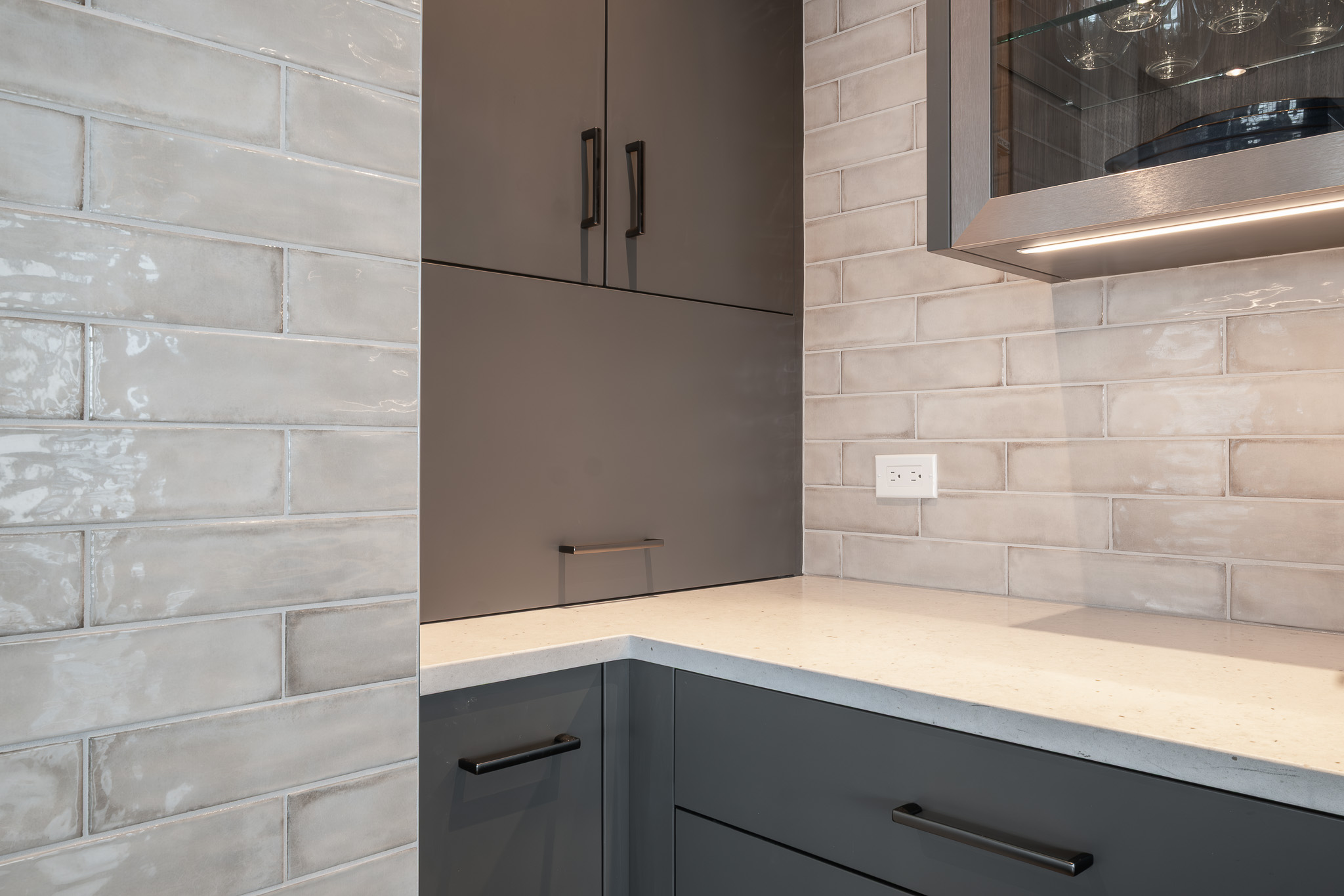 Stainless steel details carry the modern story through the design, tying in with the appliances and adding a subtle industrial edge. A backlit glass display cabinet creates a refined focal point, layering warmth and depth with its wood interior and integrated lighting. Under-cabinet LEDs wash the textured tile backsplash for a soft glow, while full-height storage keeps everything organized and out of sight. The result is polished, functional, and quietly confident.