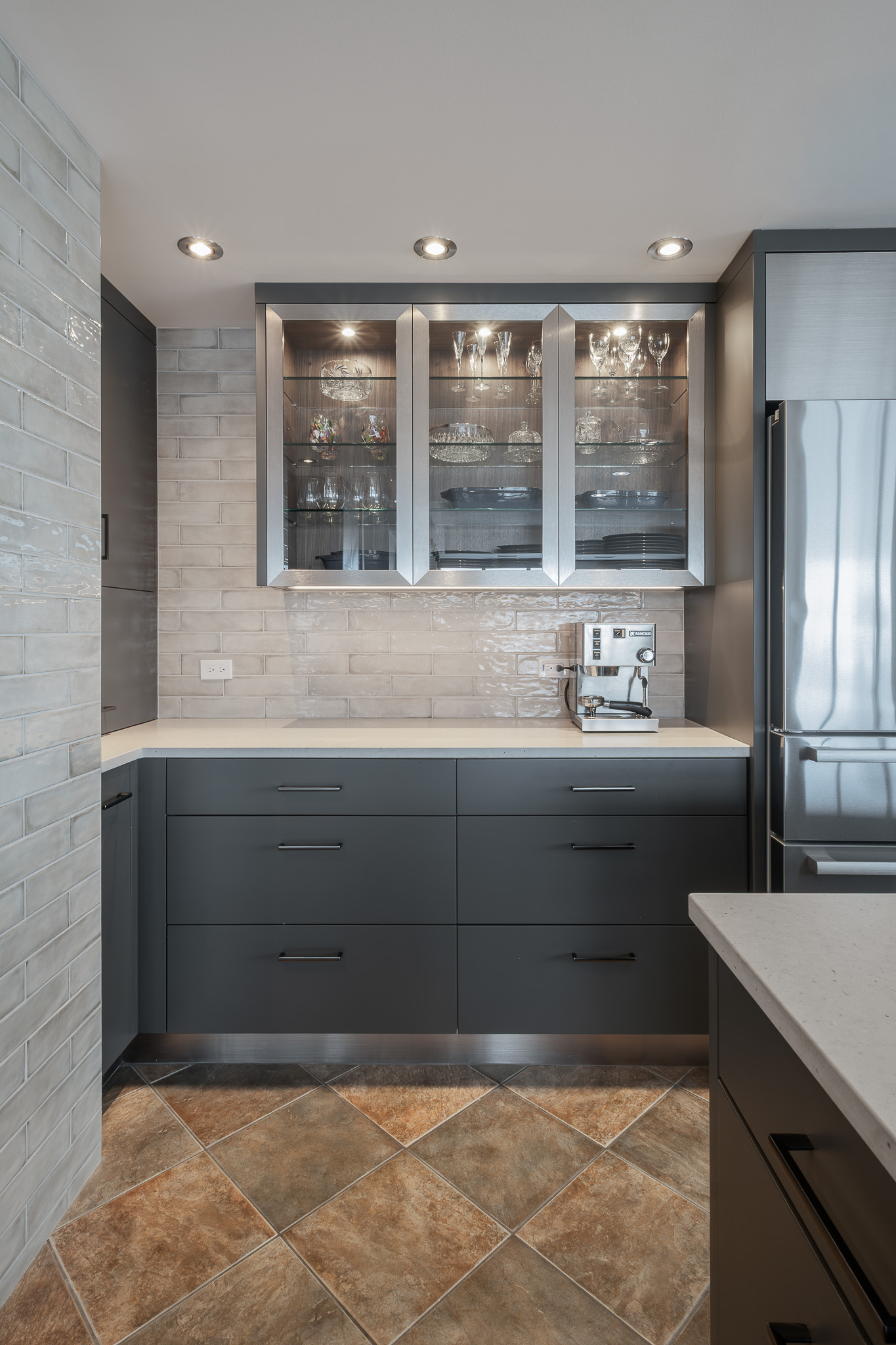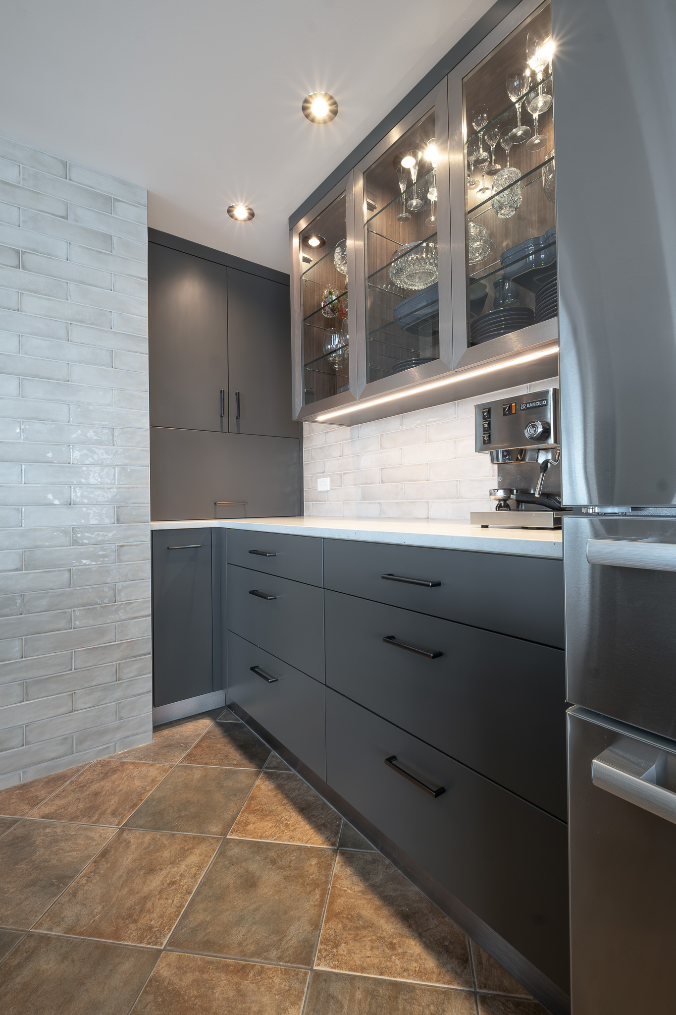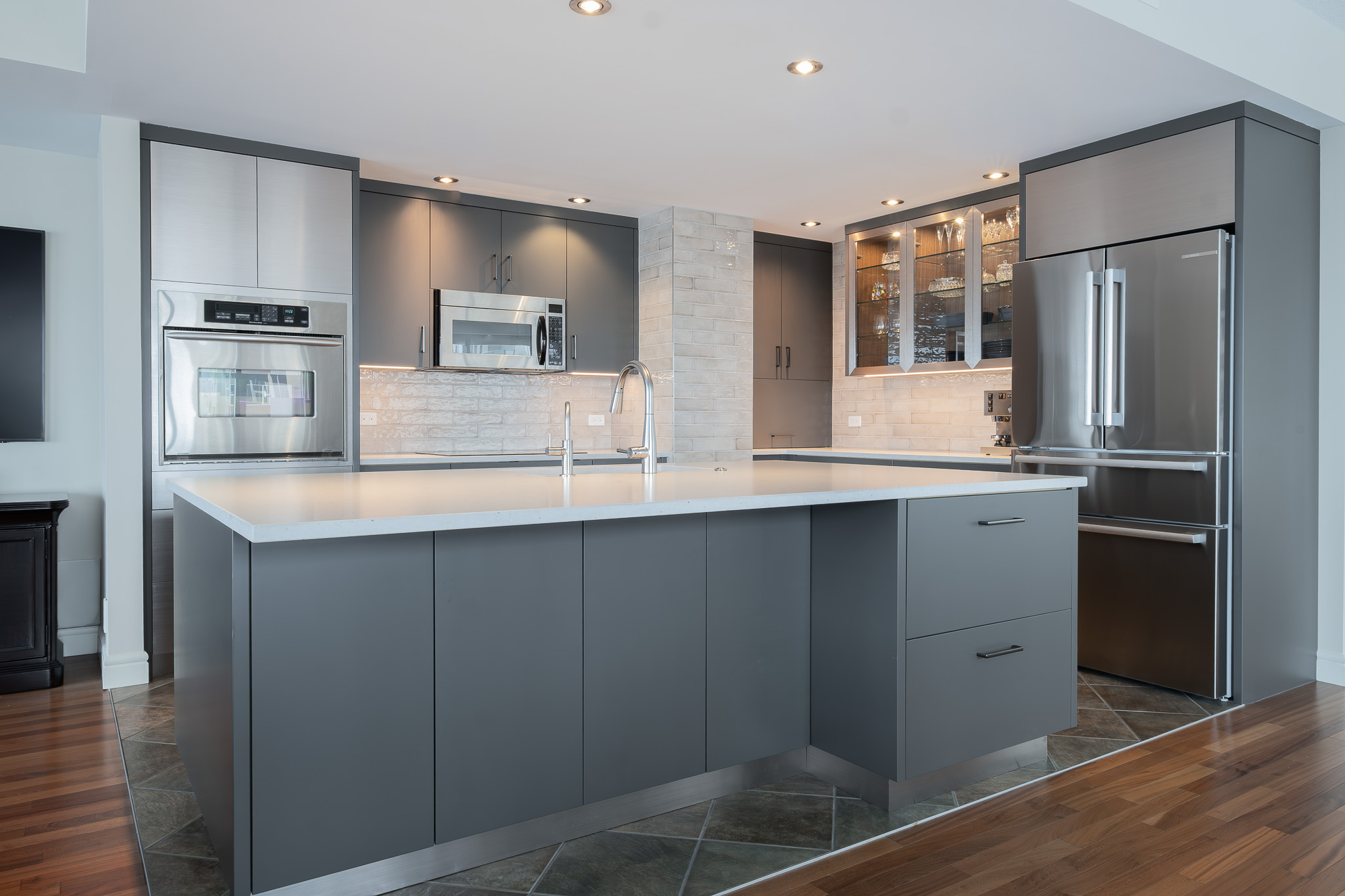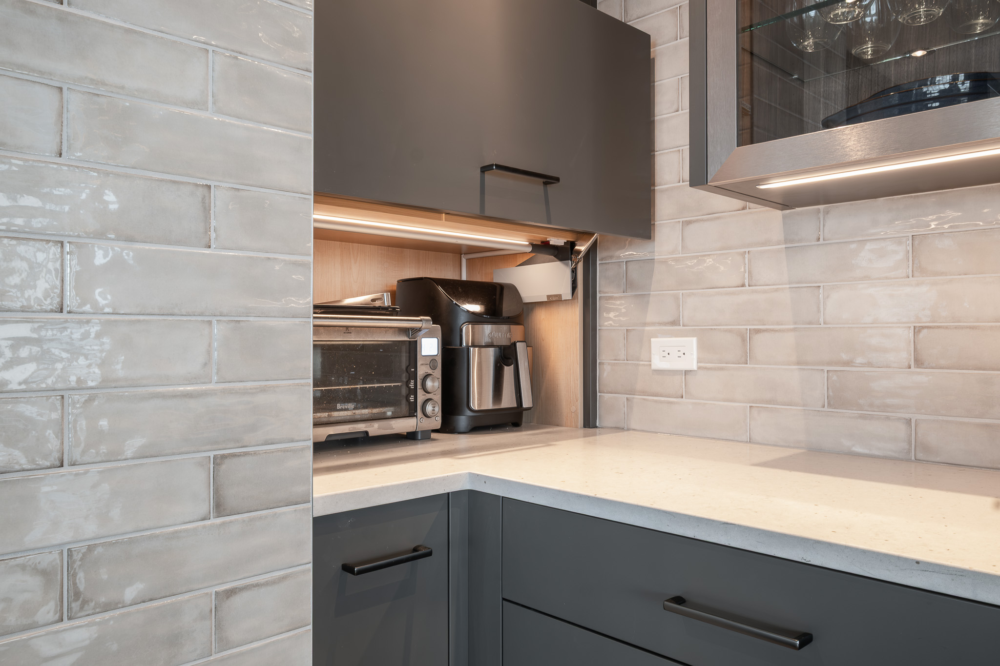 Stainless steel details carry the modern story through the design, tying in with the appliances and adding a subtle industrial edge. A backlit glass display cabinet creates a refined focal point, layering warmth and depth with its wood interior and integrated lighting. Under-cabinet LEDs wash the textured tile backsplash for a soft glow, while full-height storage keeps everything organized and out of sight. The result is polished, functional, and quietly confident.