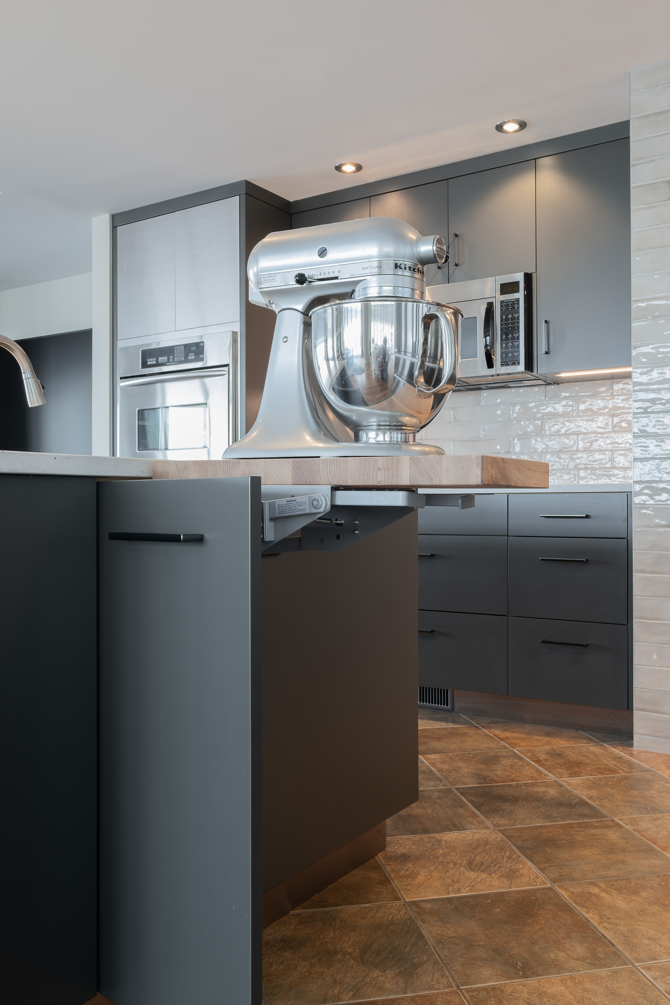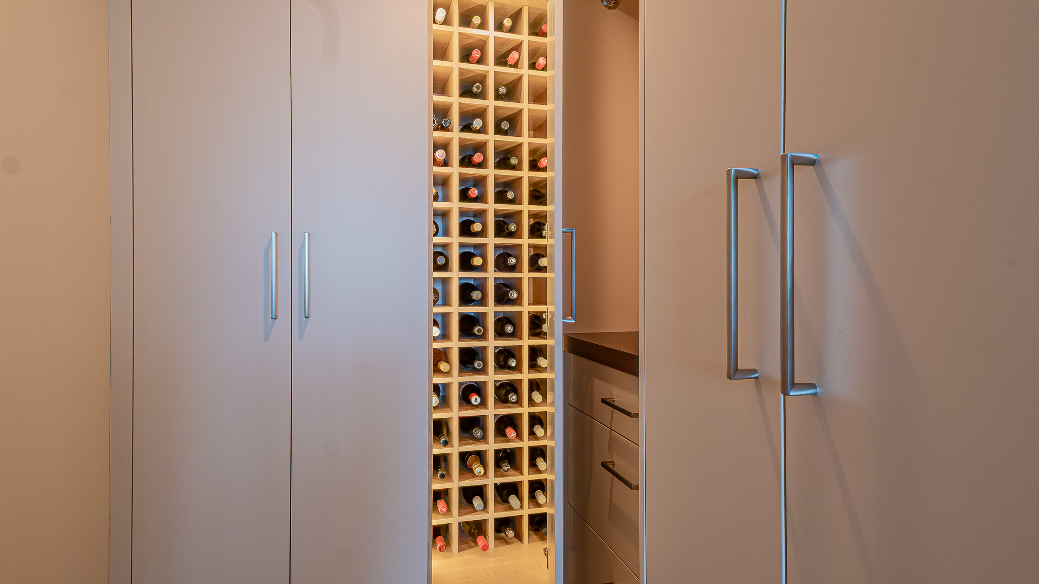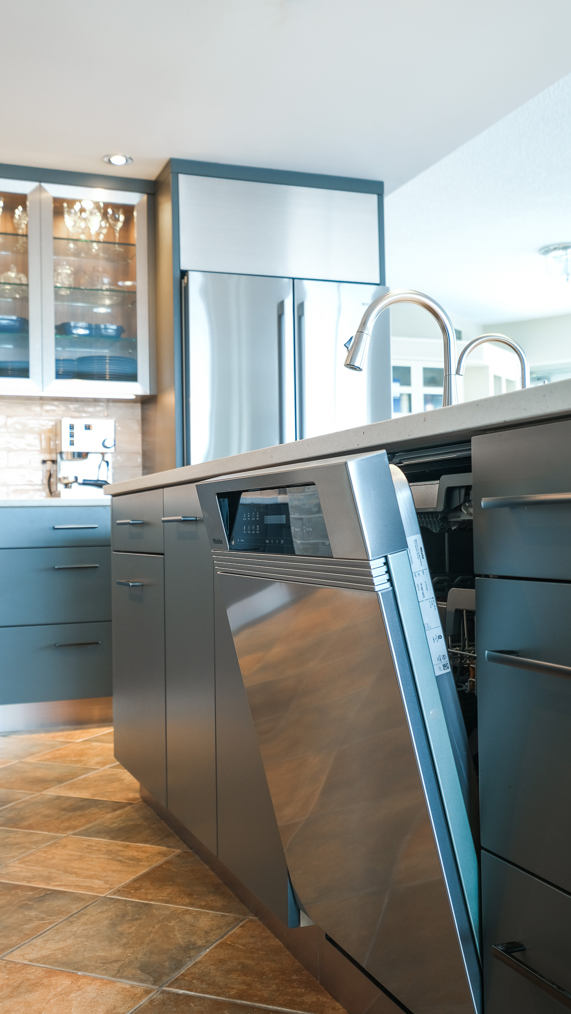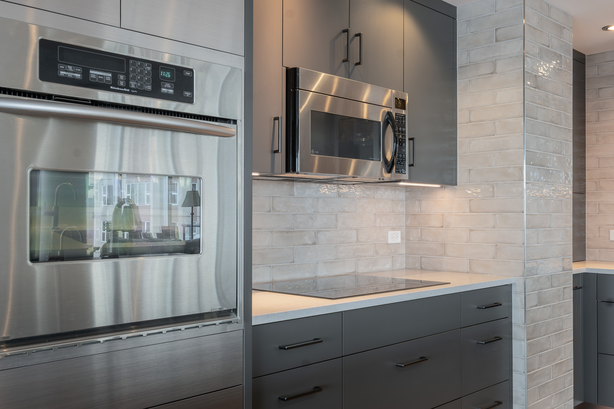Stainless steel details carry the modern story through the design, tying in with the appliances and adding a subtle industrial edge. A backlit glass display cabinet creates a refined focal point, layering warmth and depth with its wood interior and integrated lighting. Under-cabinet LEDs wash the textured tile backsplash for a soft glow, while full-height storage keeps everything organized and out of sight. The result is polished, functional, and quietly confident.