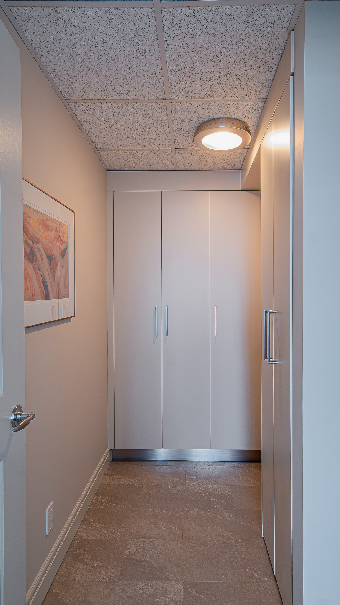Designed by Denca Cabinets, this contemporary condo kitchen is defined by clean lines, calm tones, and stainless steel accents that sharpen the whole space. Flat-panel cabinetry keeps the architecture crisp, while the oversized island anchors the room with a generous prep surface, integrated sink, and a streamlined silhouette that suits open-concept living.