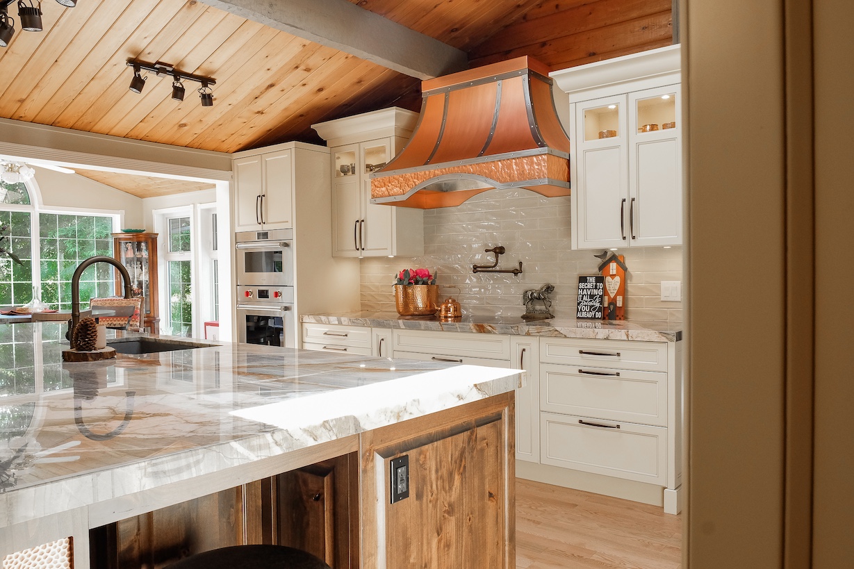 Step into the DeWinton home by Denca, where a stunning kitchen renovation leads the way in design and craftsmanship. Featuring a show-stopping Durasteel hood and hand-antiqued cabinetry, this space blends timeless elegance with modern functionality. Enhanced by Sub-Zero and Wolf appliances from Bradlee Distributors, this kitchen—and the beautifully renovated entryway, pantry, guest and main baths, and ensuite—showcases Denca’s dedication to exceptional design.