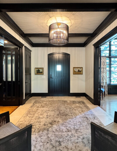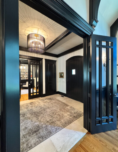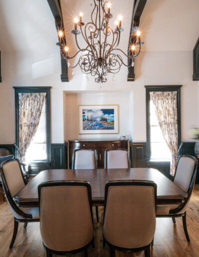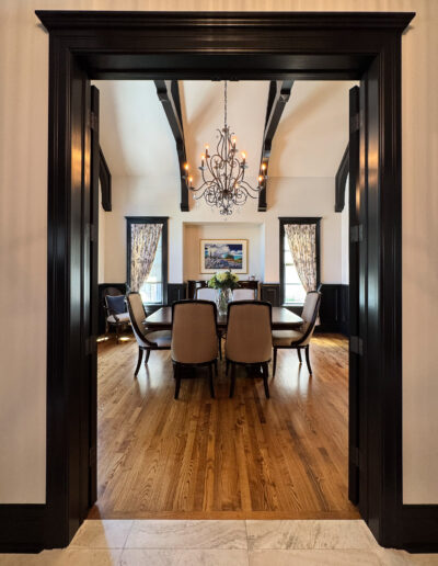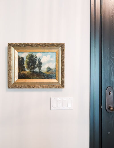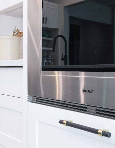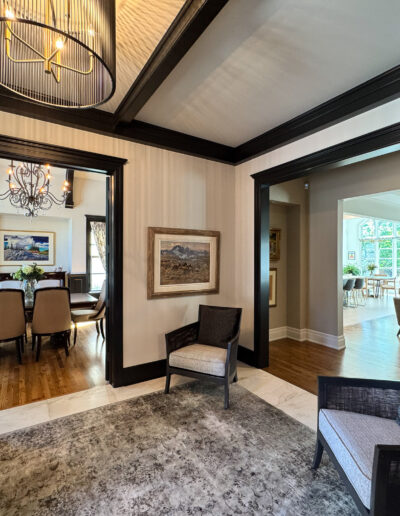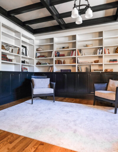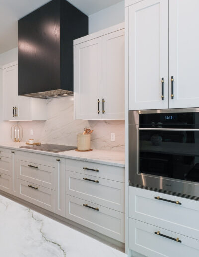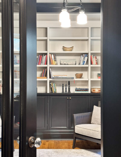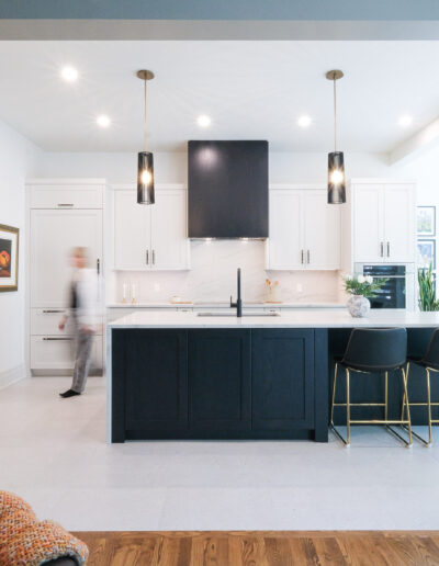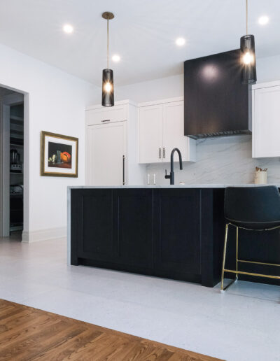 This kitchen renovation in Calgary’s historic Elbow River district features custom cabinetry designed to improve layout, light, and functionality. We removed two peninsulas and added a spacious island to maximize flow and purpose. New kitchen cabinets surround integrated appliances and are finished with stunning quartzite—selected through Denca—with a waterfall edge and full-height backsplash. A custom canopy hood replaced the original over-the-range unit, creating a focal point that fits the caliber of the home. A glass-front butler’s pantry connects the kitchen and dining areas with style and practicality. We also refinished original millwork throughout the dining room, entryway, and library. The result is a refined, character-rich home with custom cabinetry and thoughtful design.