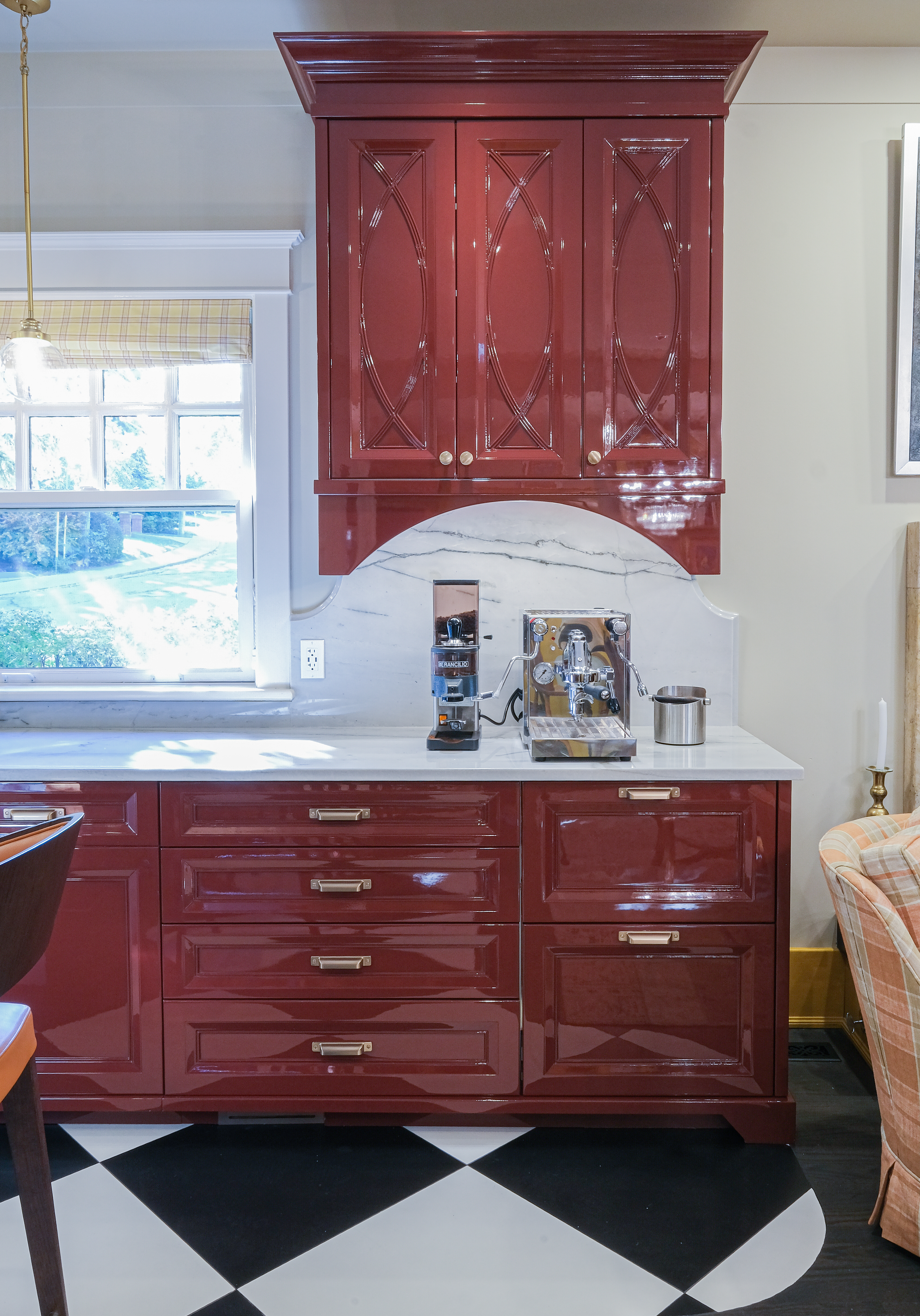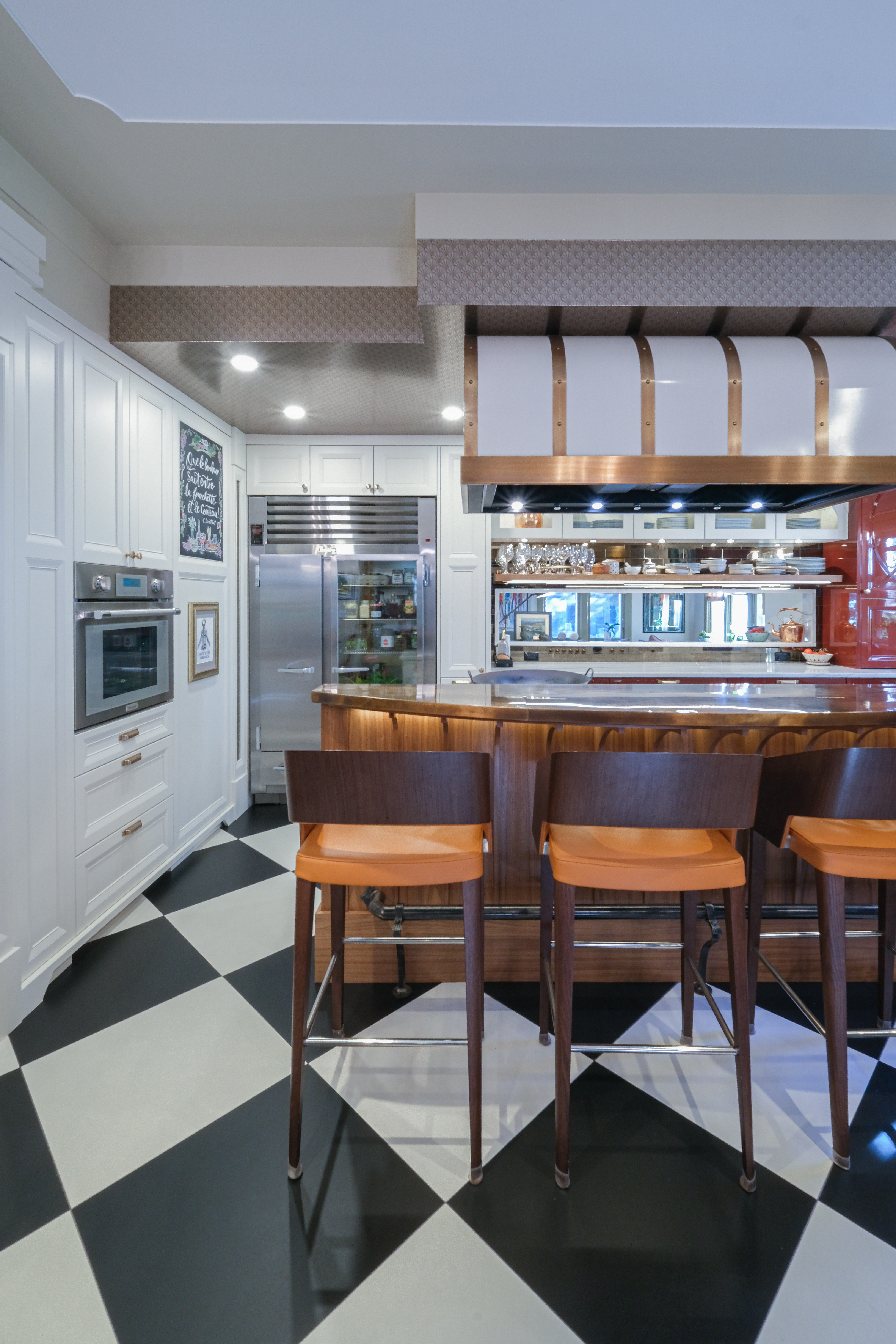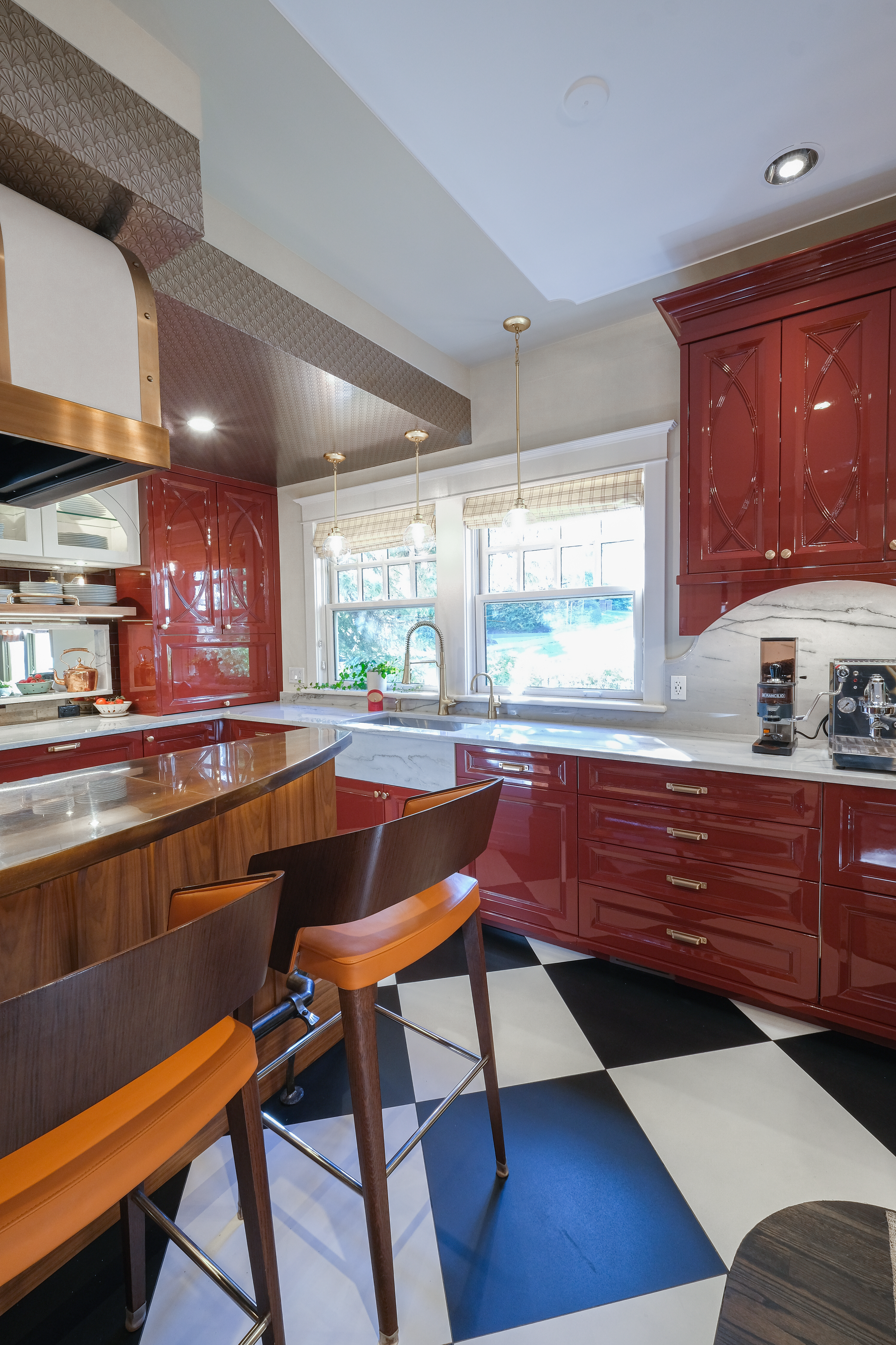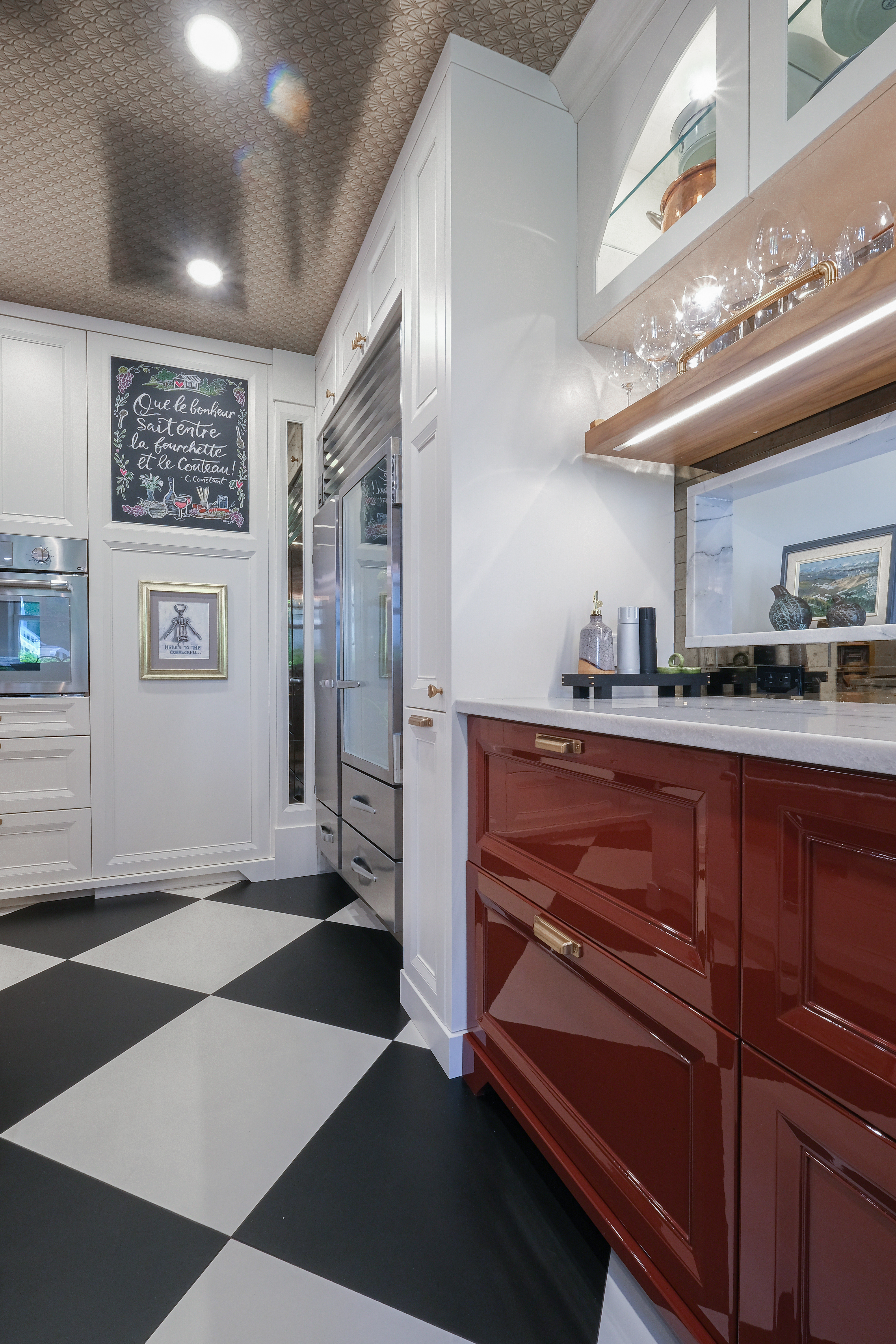 This French Bistro Kitchen is a charming blend of bold personality and timeless elegance, with high-gloss red cabinetry that feels ready to pour you a café au lait and tell you a story. Softened by light lacquer cabinets colour-matched to the Bertazzoni Avorio Heritage range, custom curves, and a barrel hood that feels almost sculptural, the space balances drama with warmth. Set inside a 100-year-old home, it marries classic details with playful modern touches like metallic ceiling wallpaper, oversized checkered tiles, and a curated chalkboard that invites creativity.