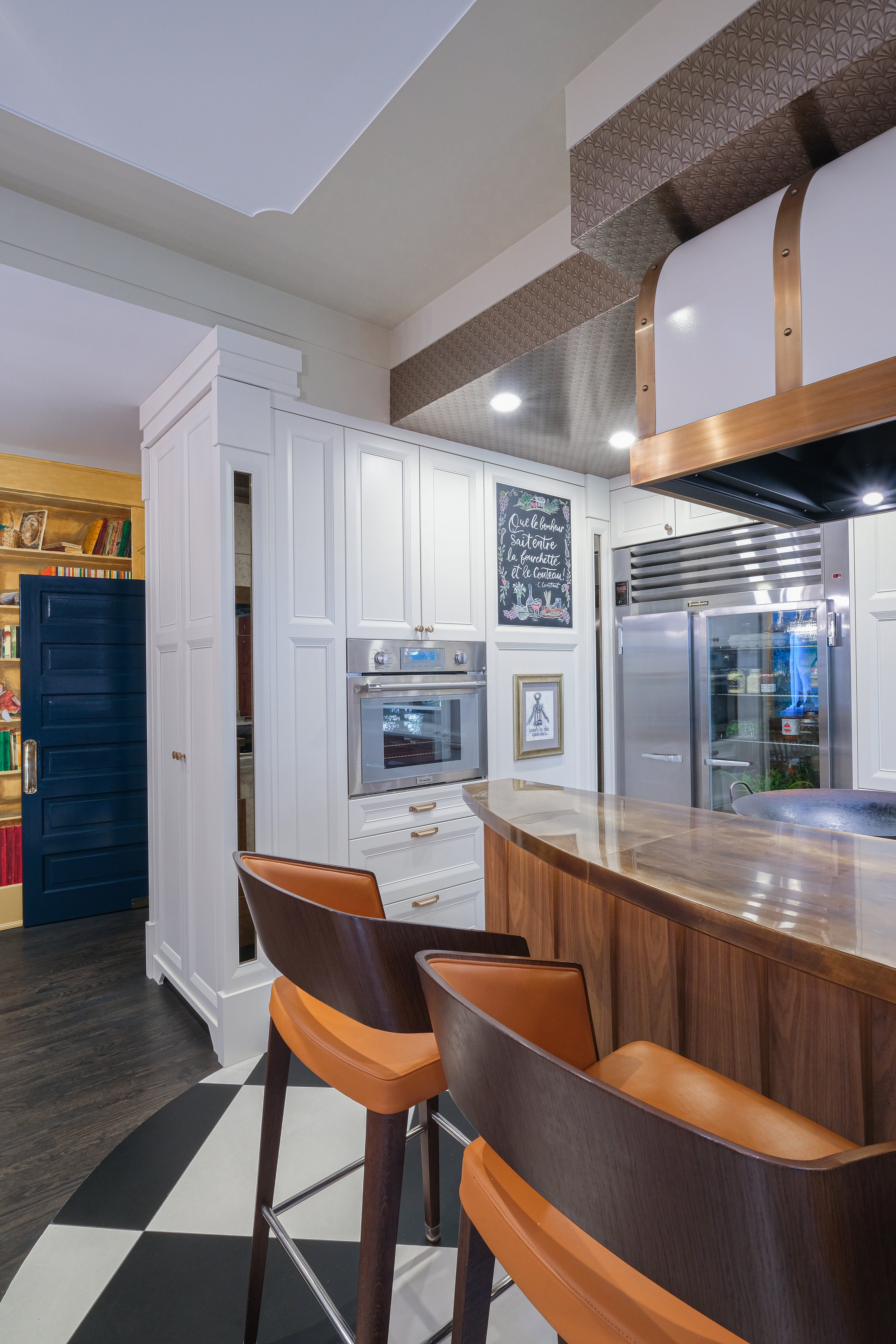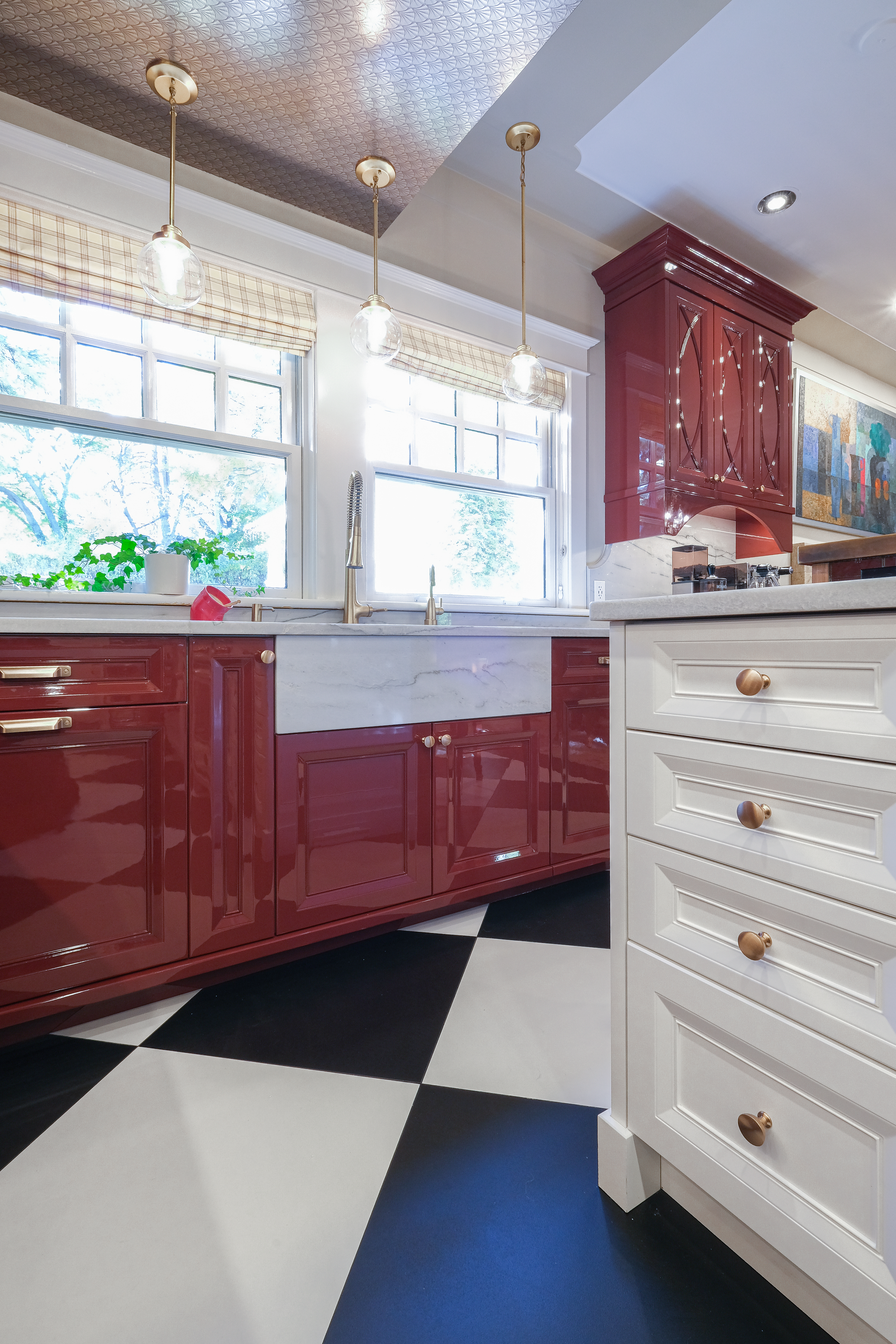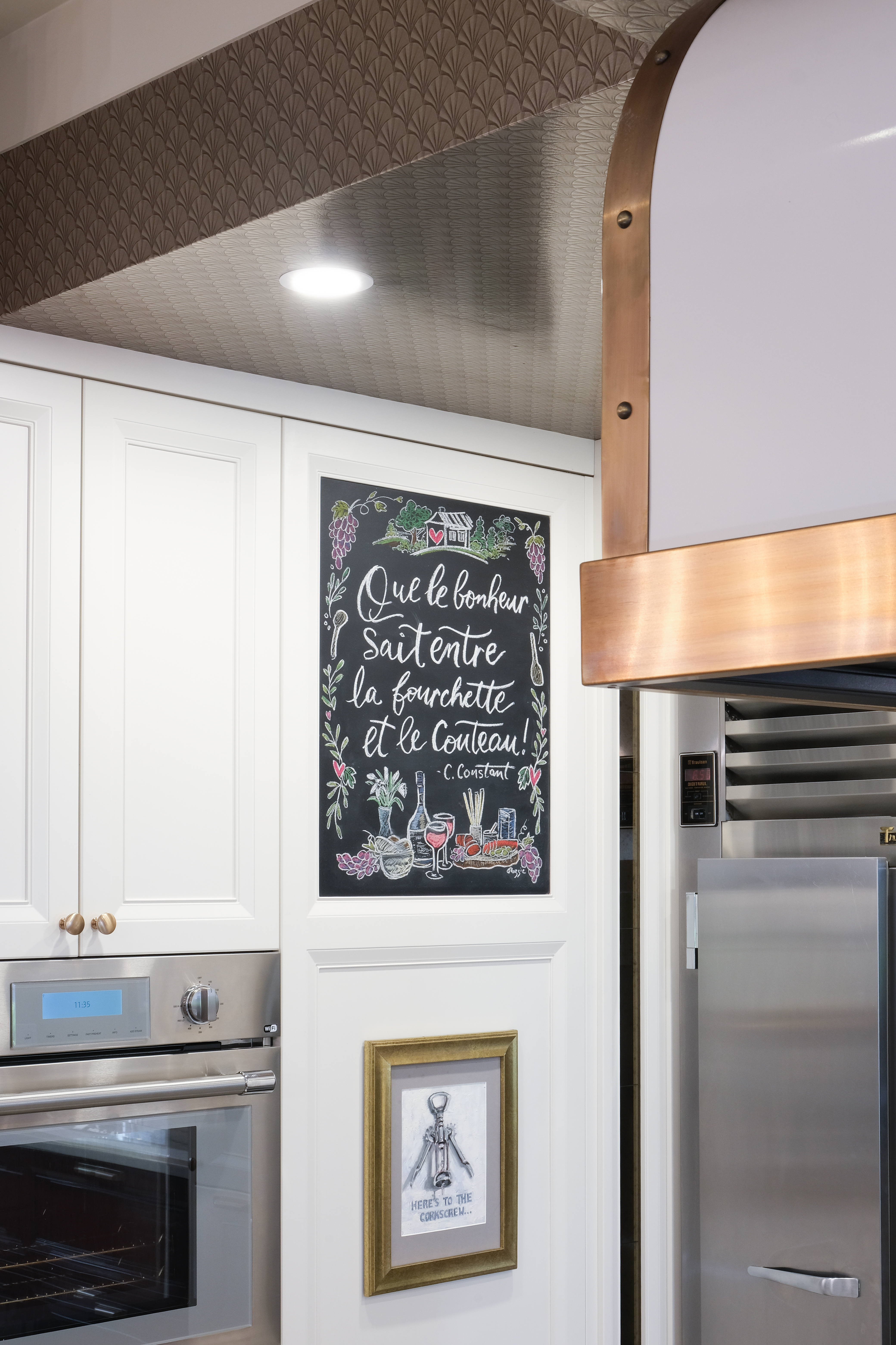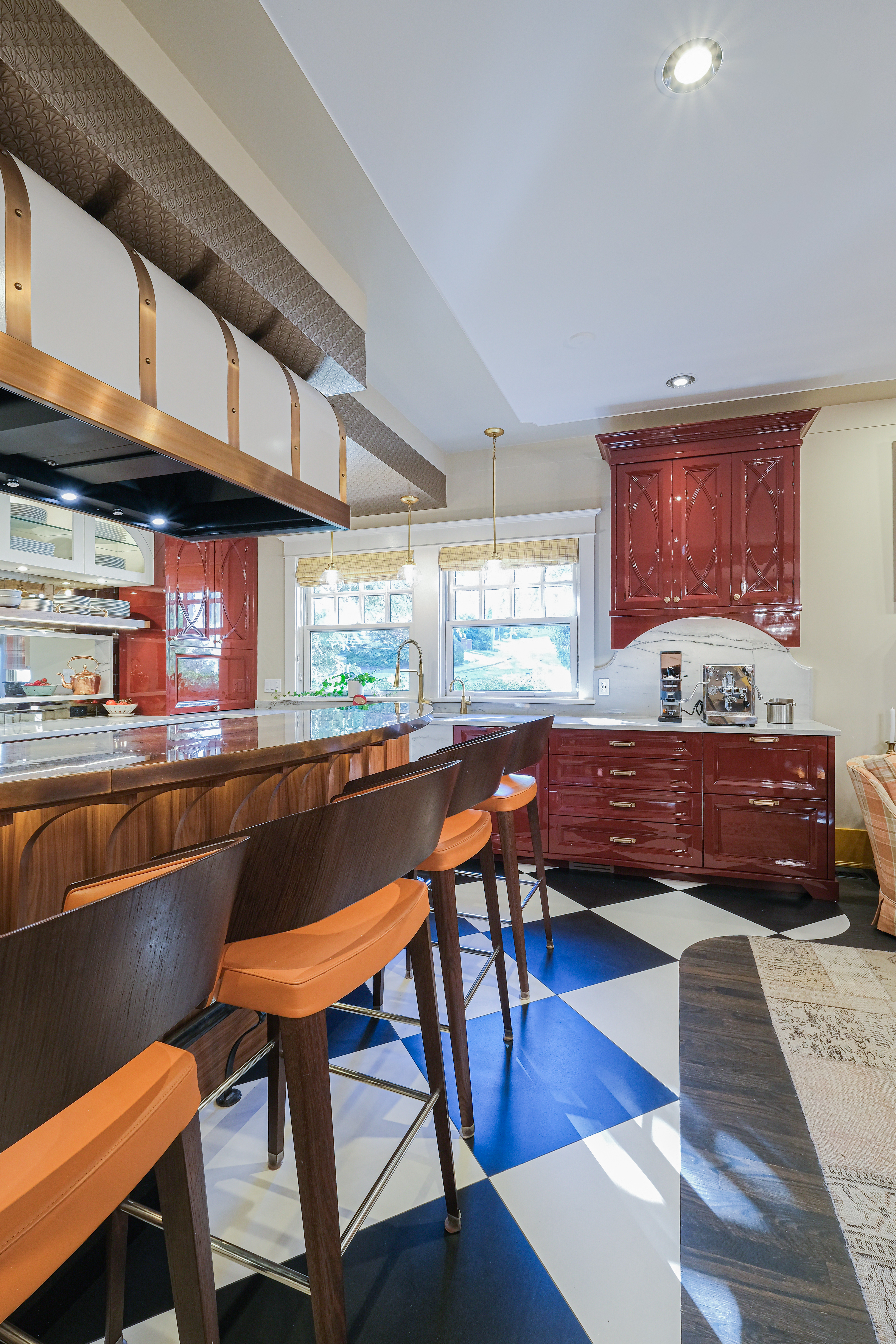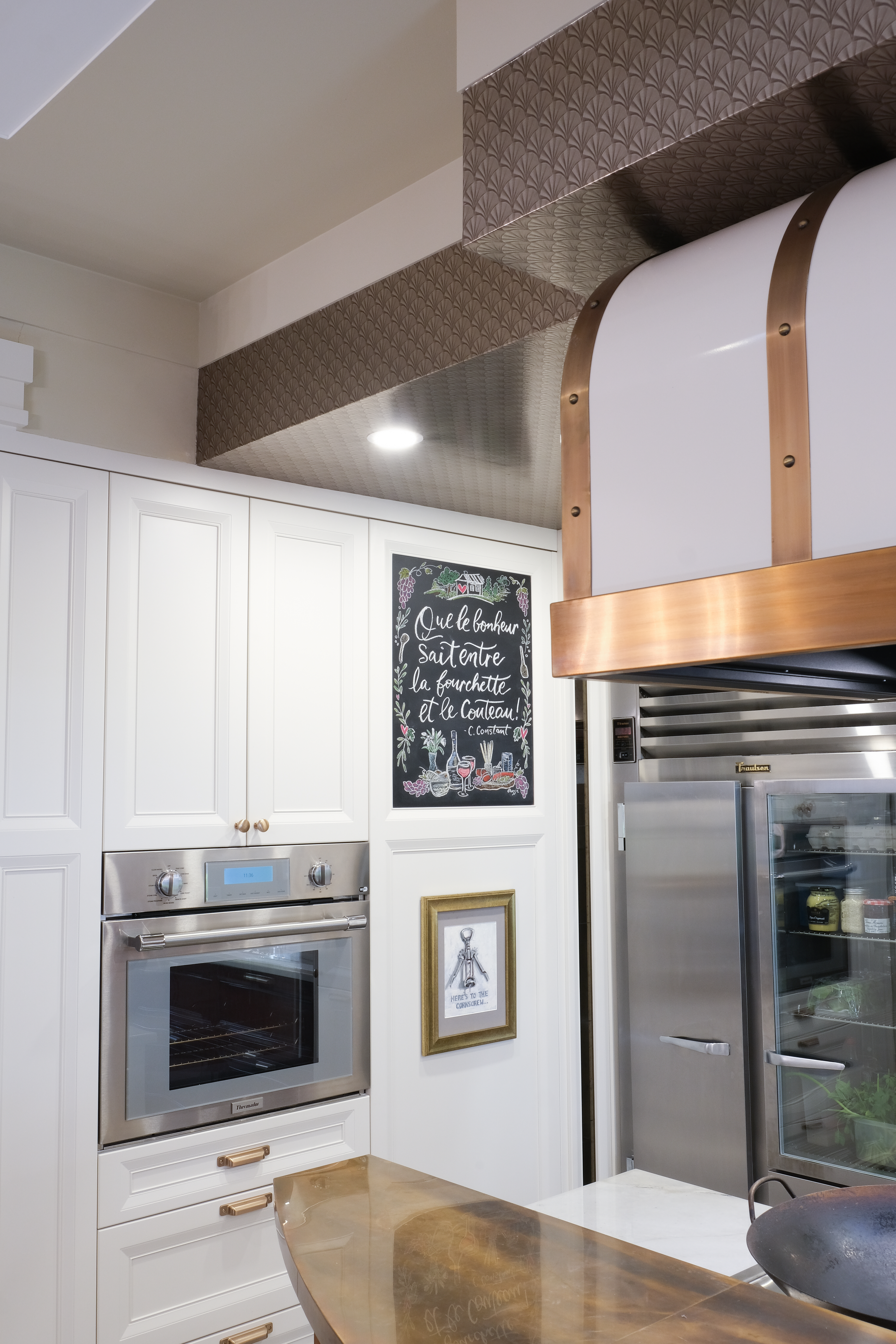This French Bistro Kitchen is a charming blend of bold personality and timeless elegance, with high-gloss red cabinetry that feels ready to pour you a café au lait and tell you a story. Softened by light lacquer cabinets colour-matched to the Bertazzoni Avorio Heritage range, custom curves, and a barrel hood that feels almost sculptural, the space balances drama with warmth. Set inside a 100-year-old home, it marries classic details with playful modern touches like metallic ceiling wallpaper, oversized checkered tiles, and a curated chalkboard that invites creativity.