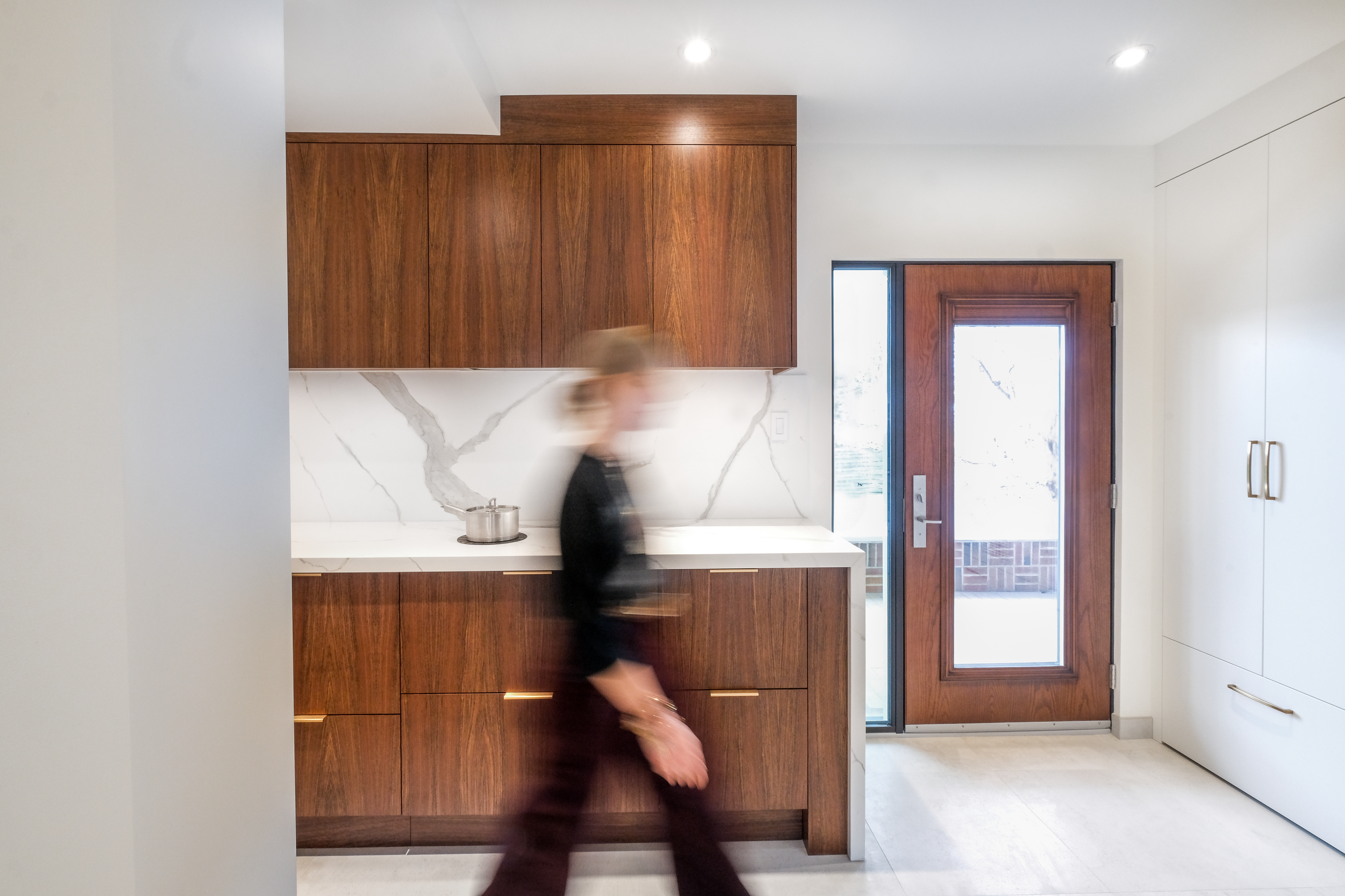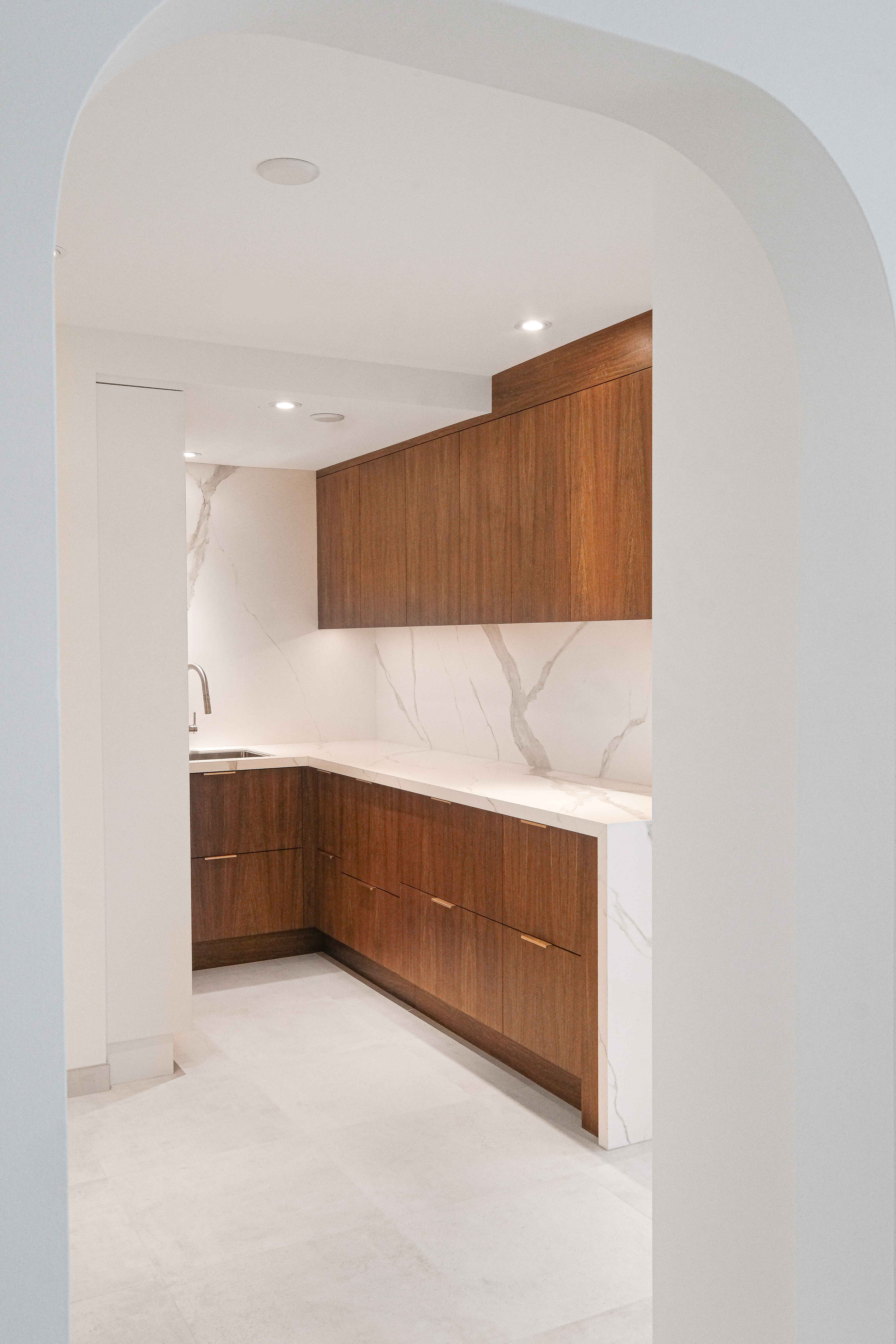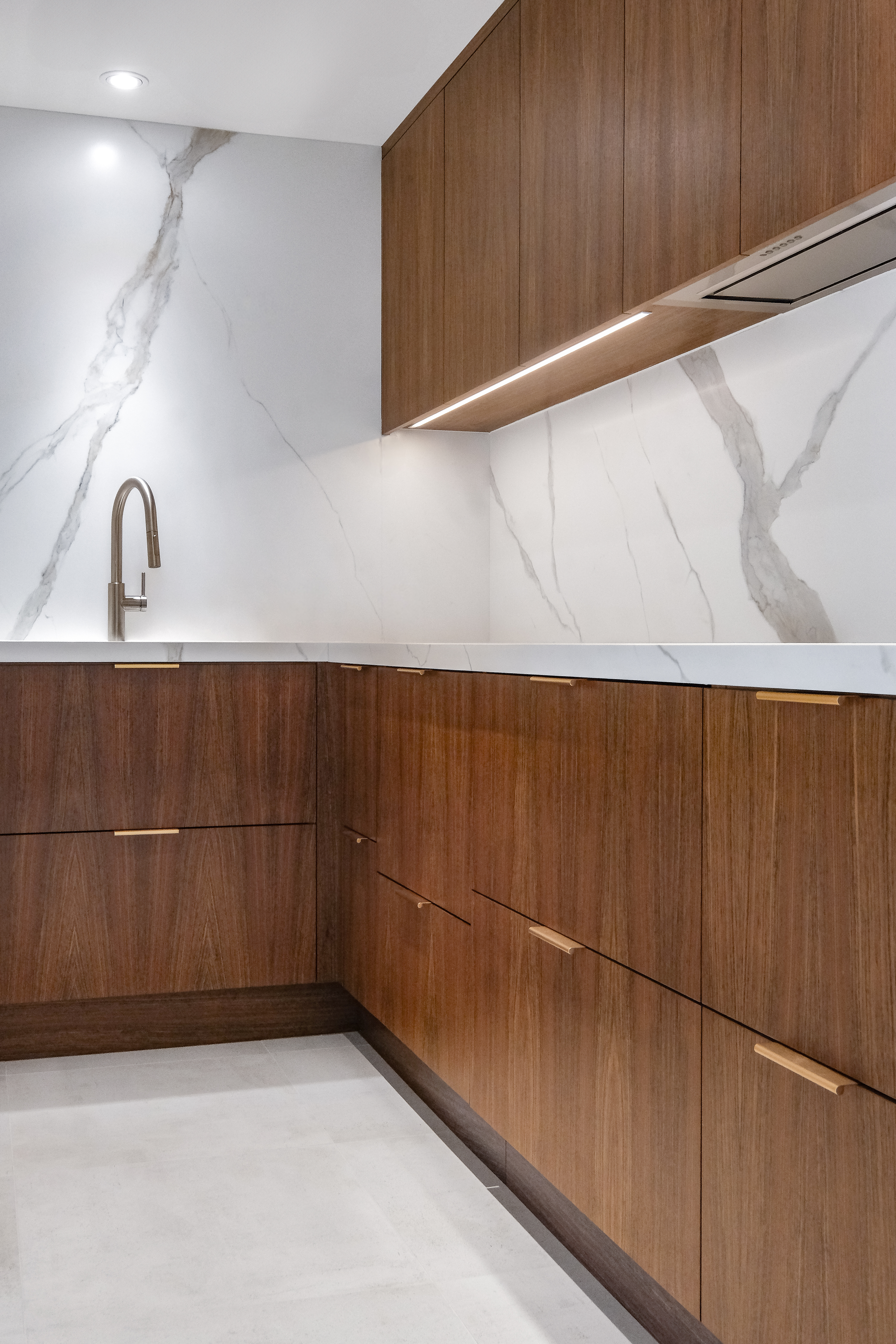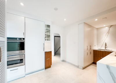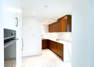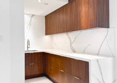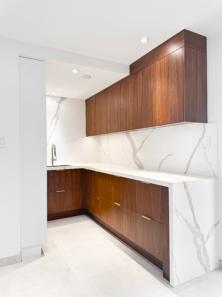 This custom kitchen renovation cleverly maximizes a small space, combining functionality with timeless style. With custom appliance panels, a hidden Invisa cooktop, and beautiful Tropical Olive veneer, the design seamlessly integrates modern elements with classic craftsmanship. Pop-up outlets, a full-height pantry, and a hidden broom closet elevate the storage and usability, while the custom glass cabinet and mitered countertop add sophisticated details. Designed for taller clients, this kitchen provides comfort and style in every inch.