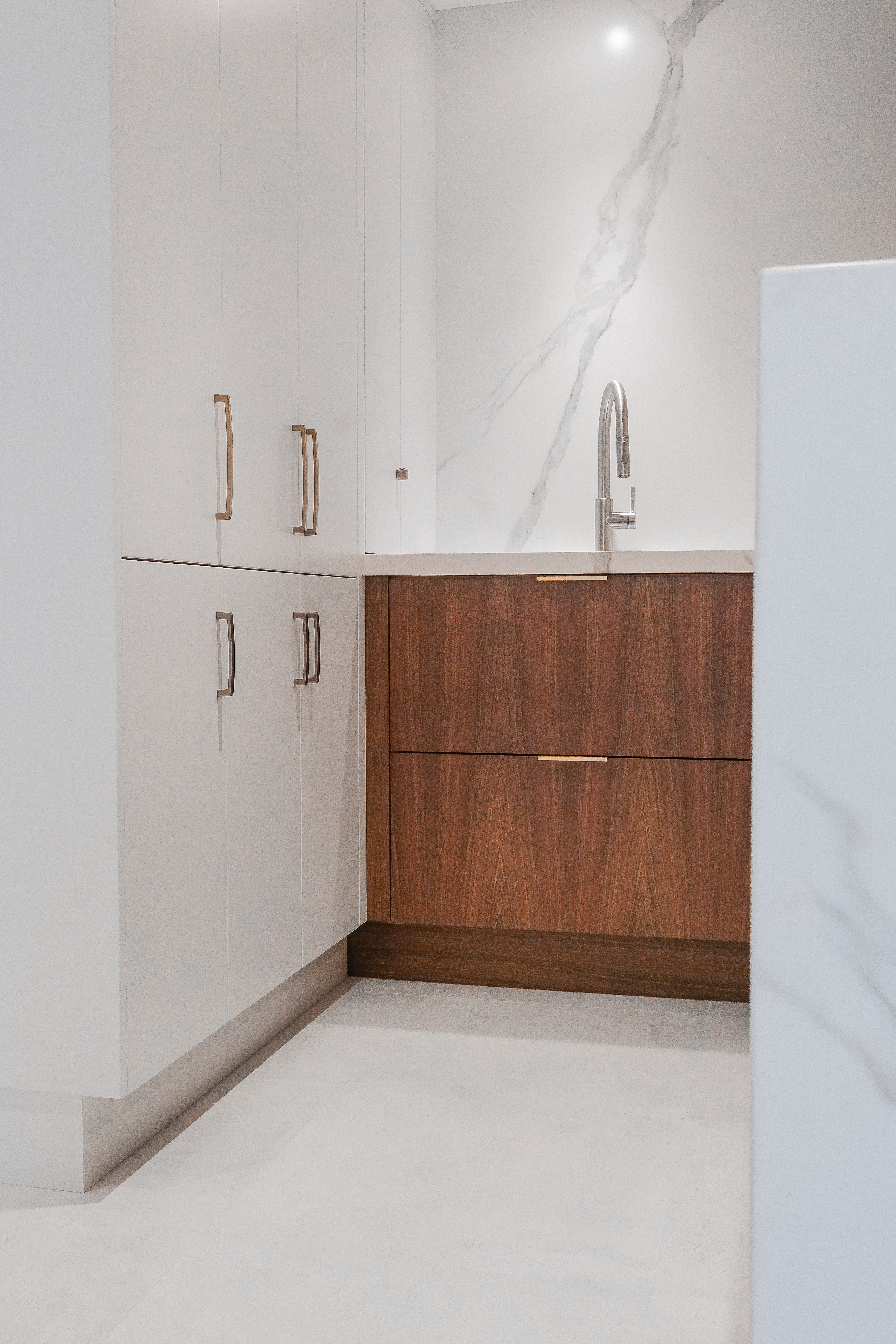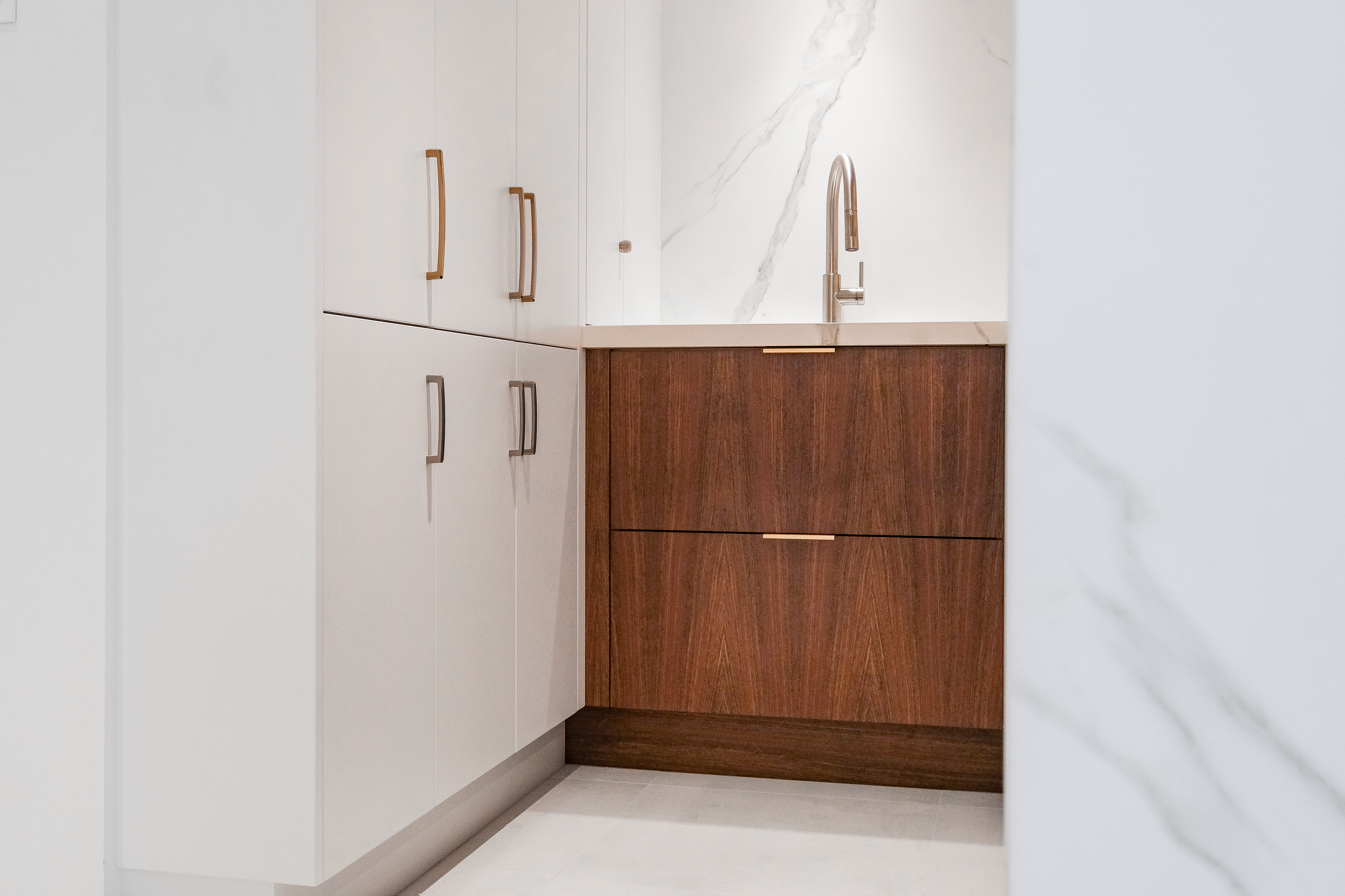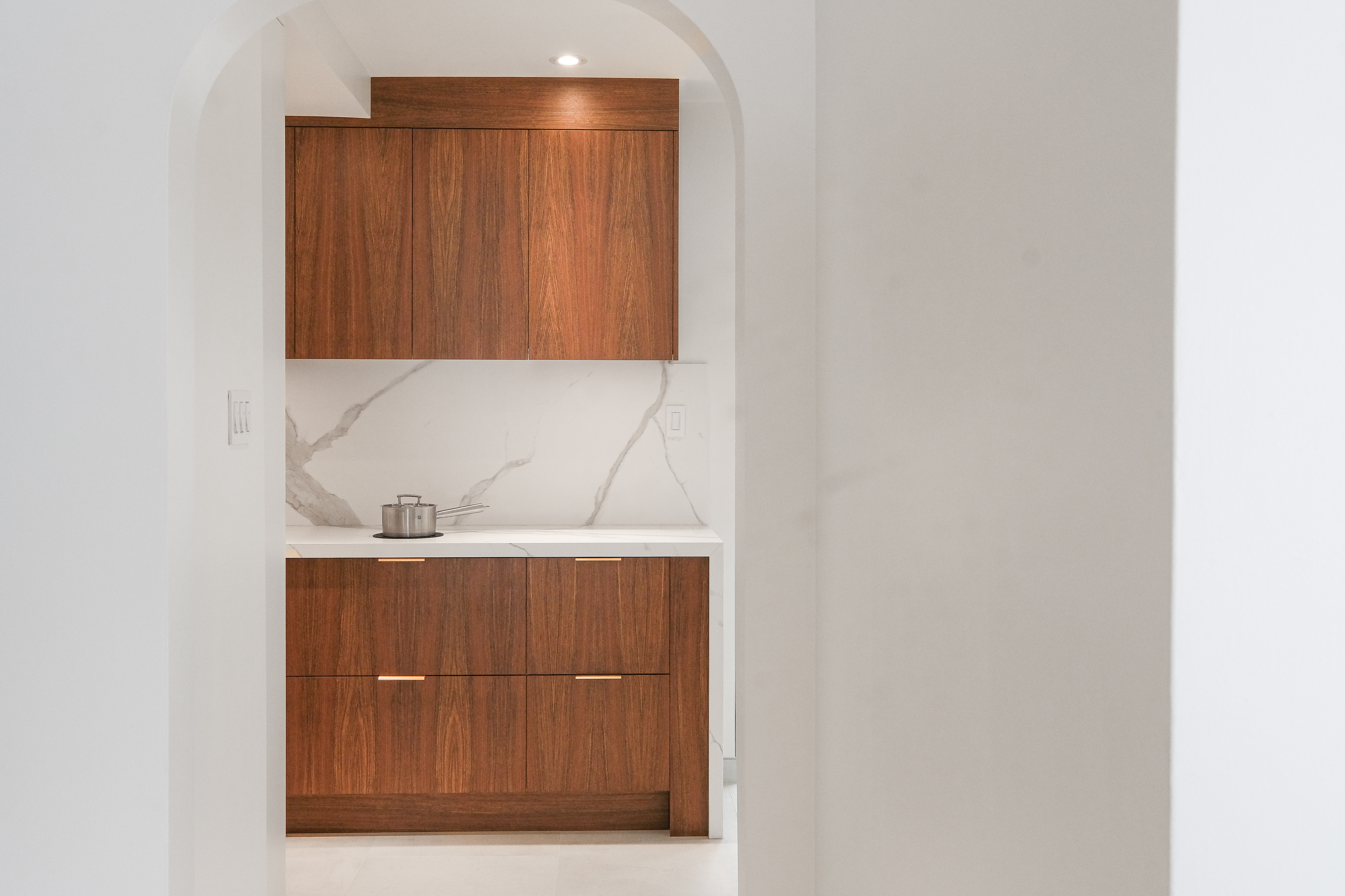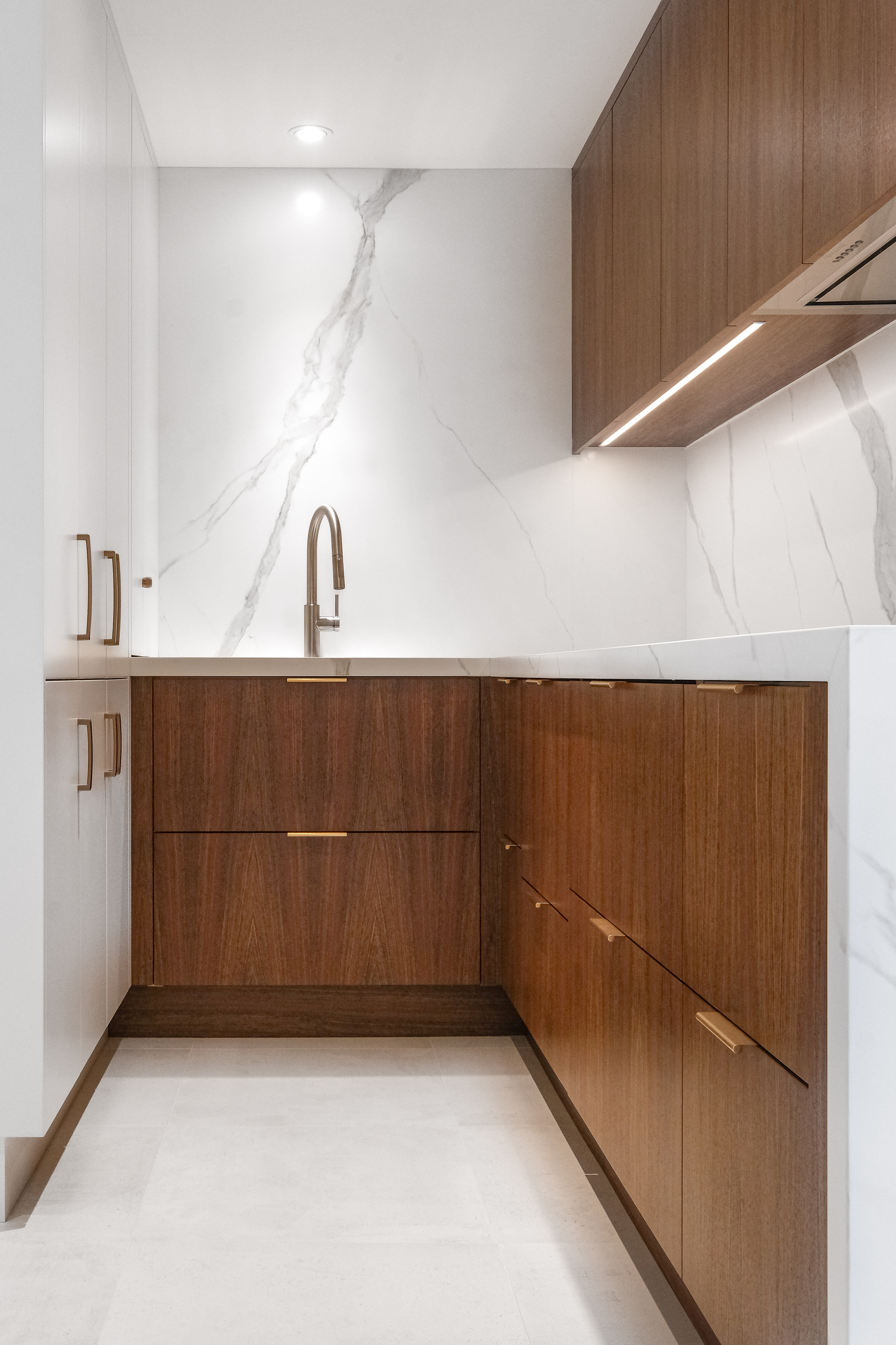 This custom kitchen renovation cleverly maximizes a small space, combining functionality with timeless style. With custom appliance panels, a hidden Invisa cooktop, and beautiful Tropical Olive veneer, the design seamlessly integrates modern elements with classic craftsmanship. Pop-up outlets, a full-height pantry, and a hidden broom closet elevate the storage and usability, while the custom glass cabinet and mitered countertop add sophisticated details. Designed for taller clients, this kitchen provides comfort and style in every inch.