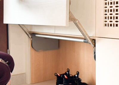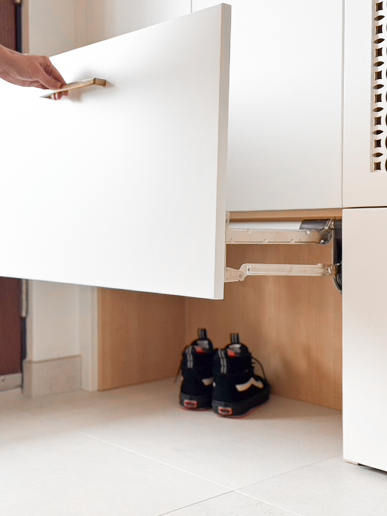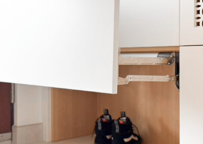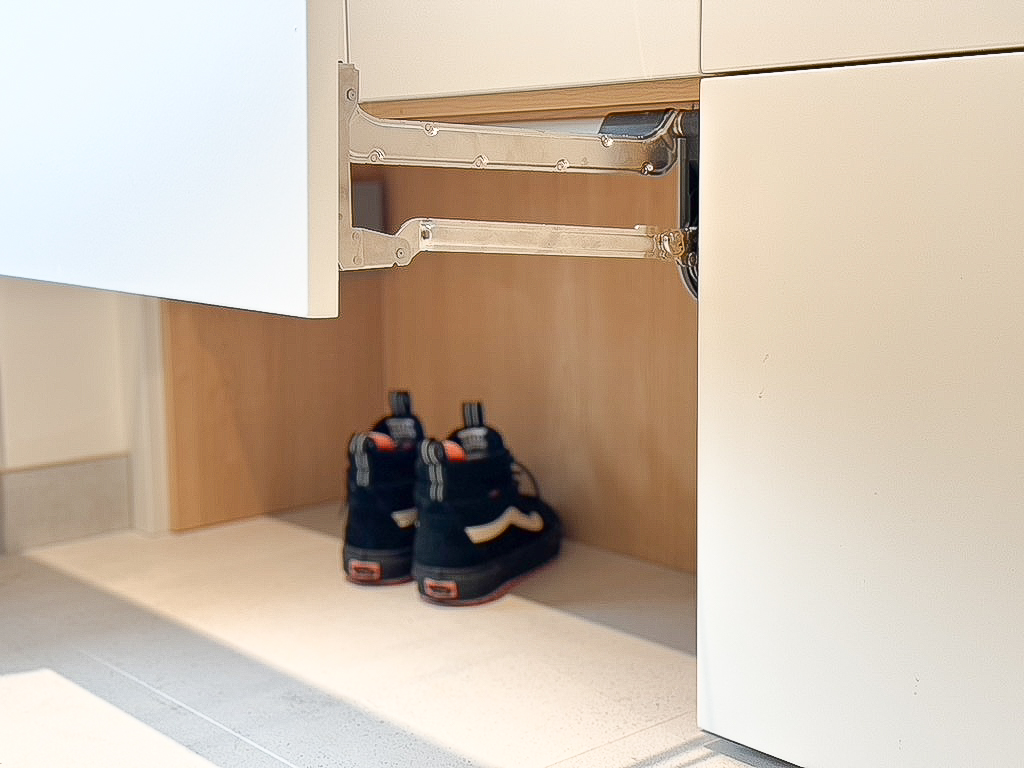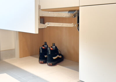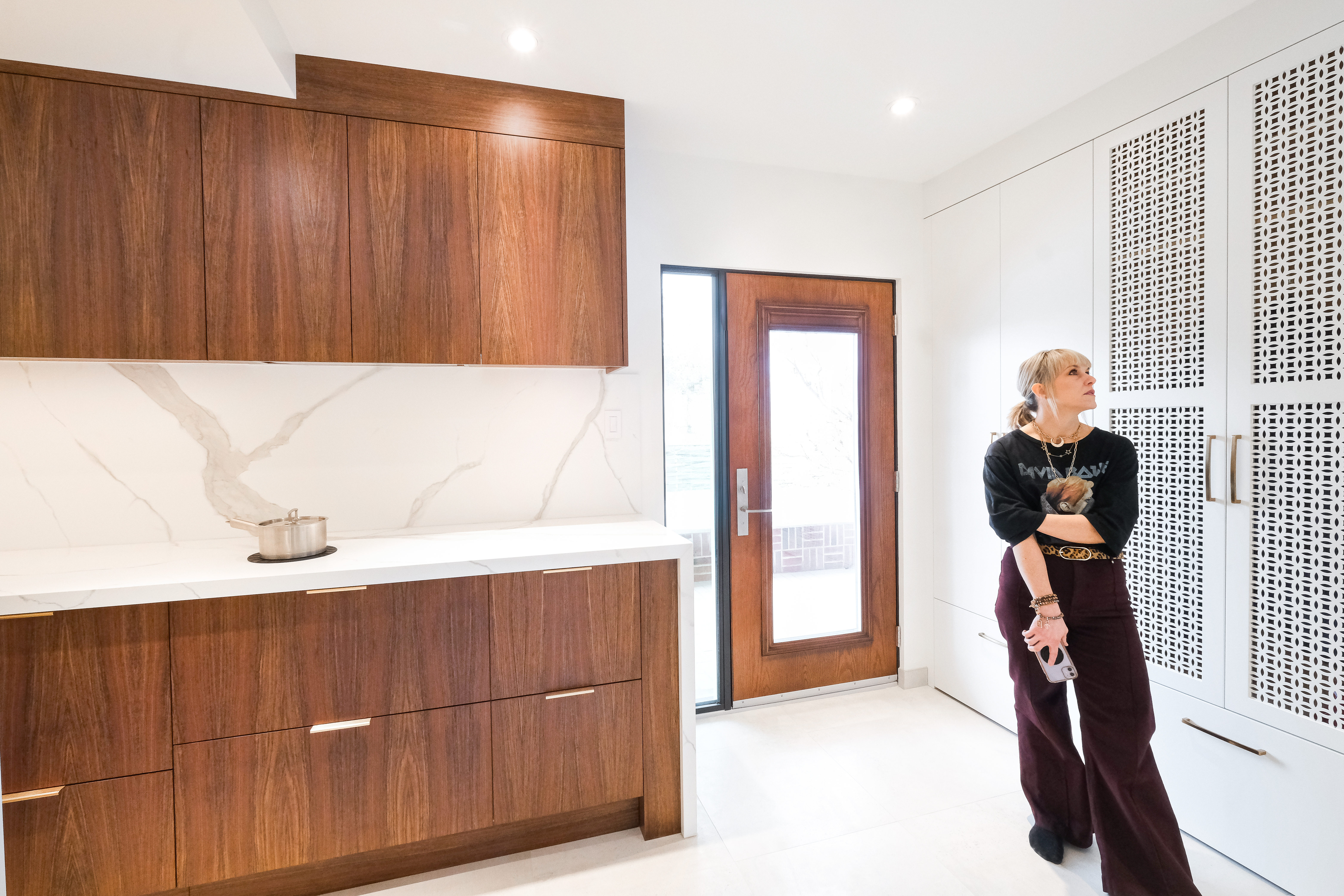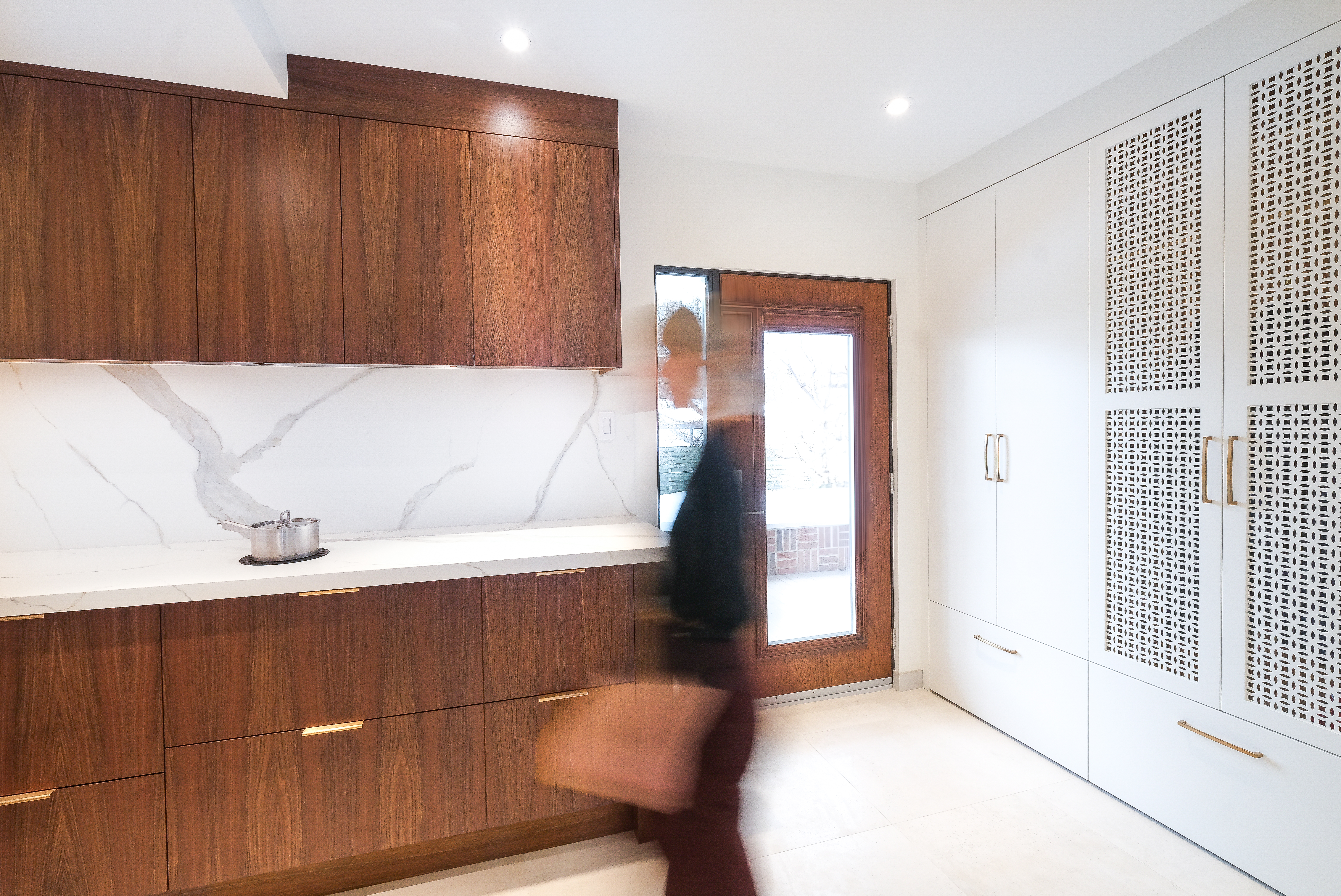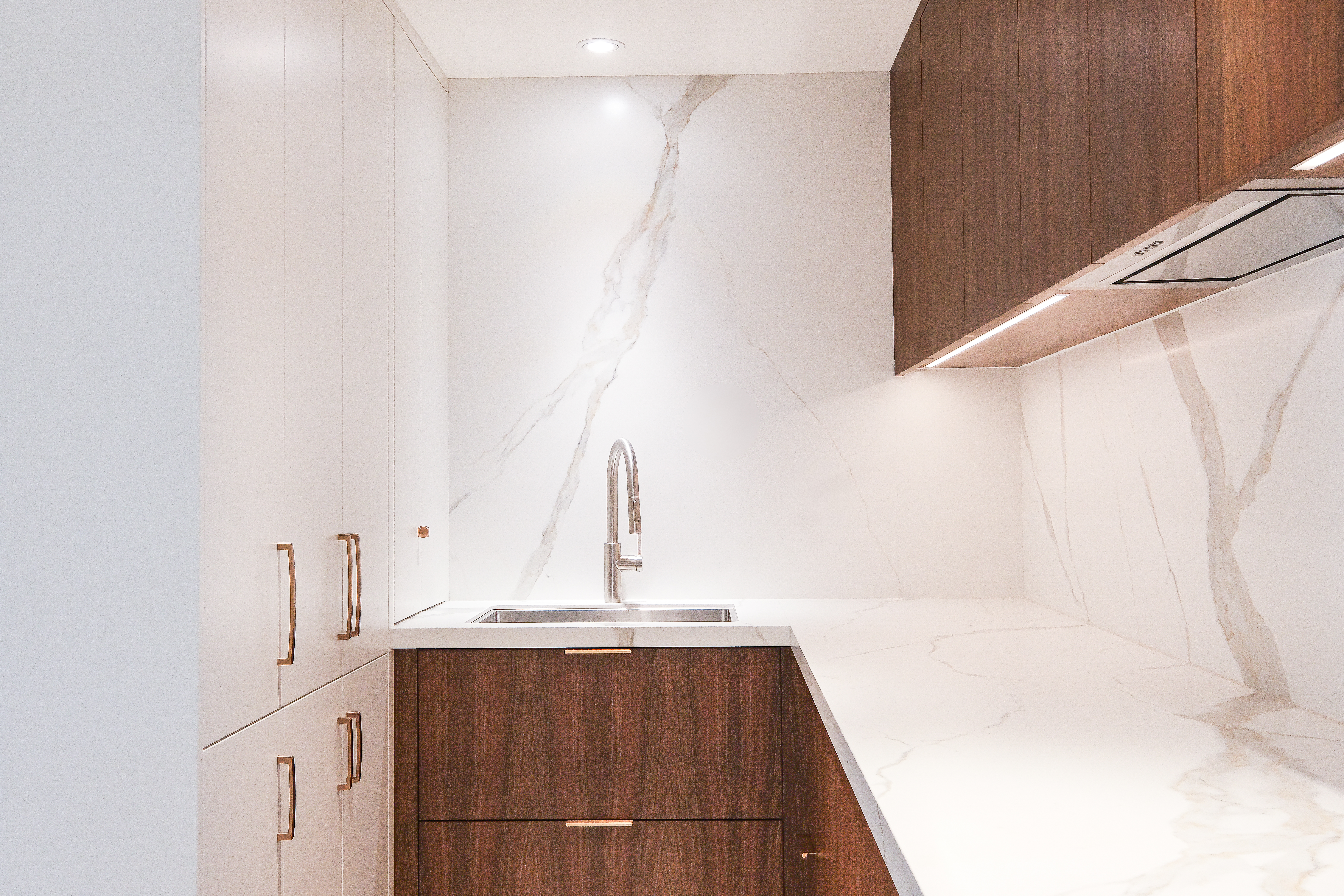 This custom kitchen renovation cleverly maximizes a small space, combining functionality with timeless style. With custom appliance panels, a hidden Invisa cooktop, and beautiful Tropical Olive veneer, the design seamlessly integrates modern elements with classic craftsmanship. Pop-up outlets, a full-height pantry, and a hidden broom closet elevate the storage and usability, while the custom glass cabinet and mitered countertop add sophisticated details. Designed for taller clients, this kitchen provides comfort and style in every inch.