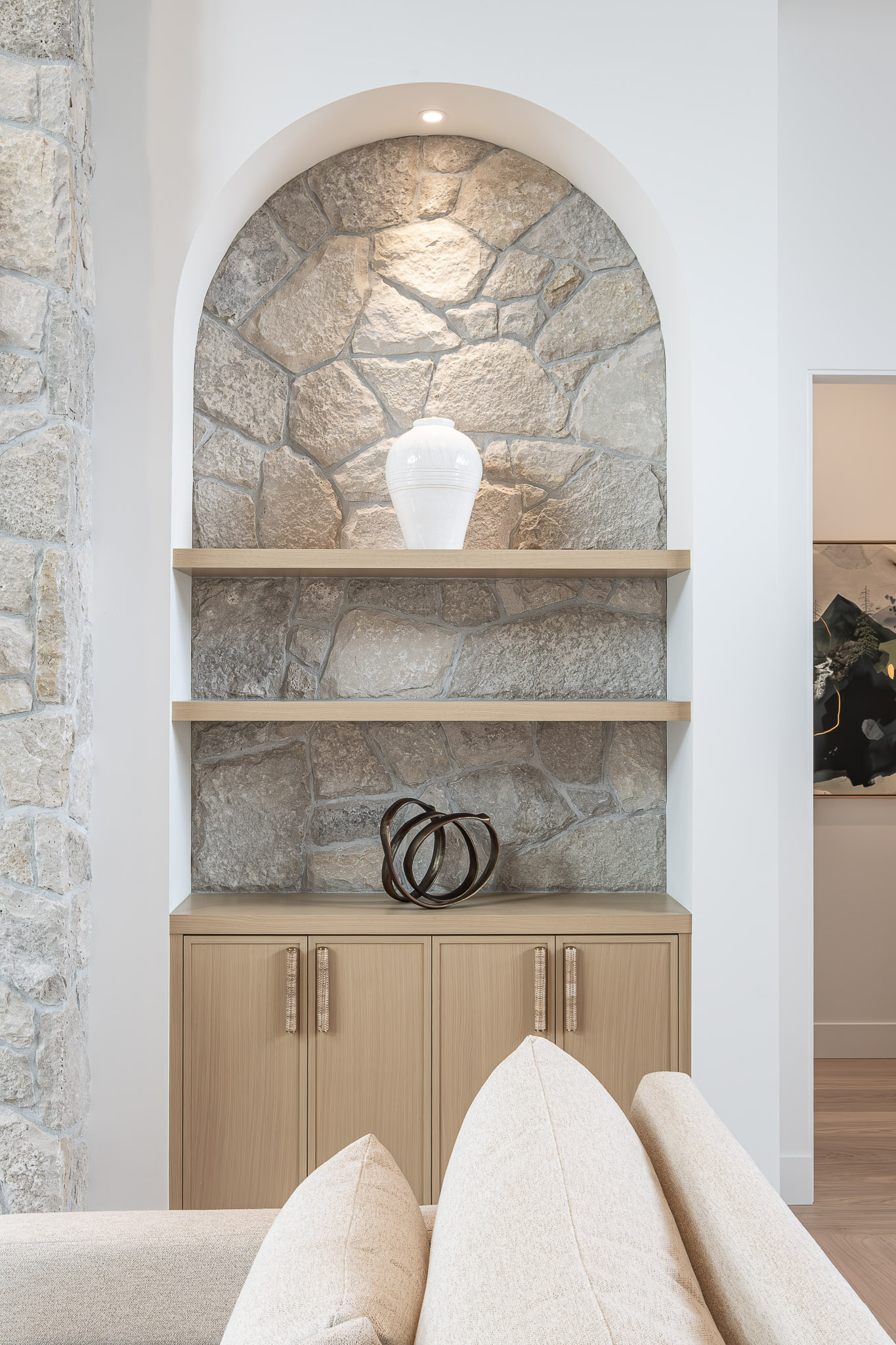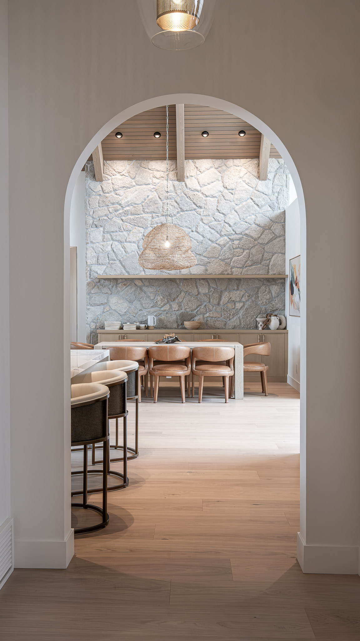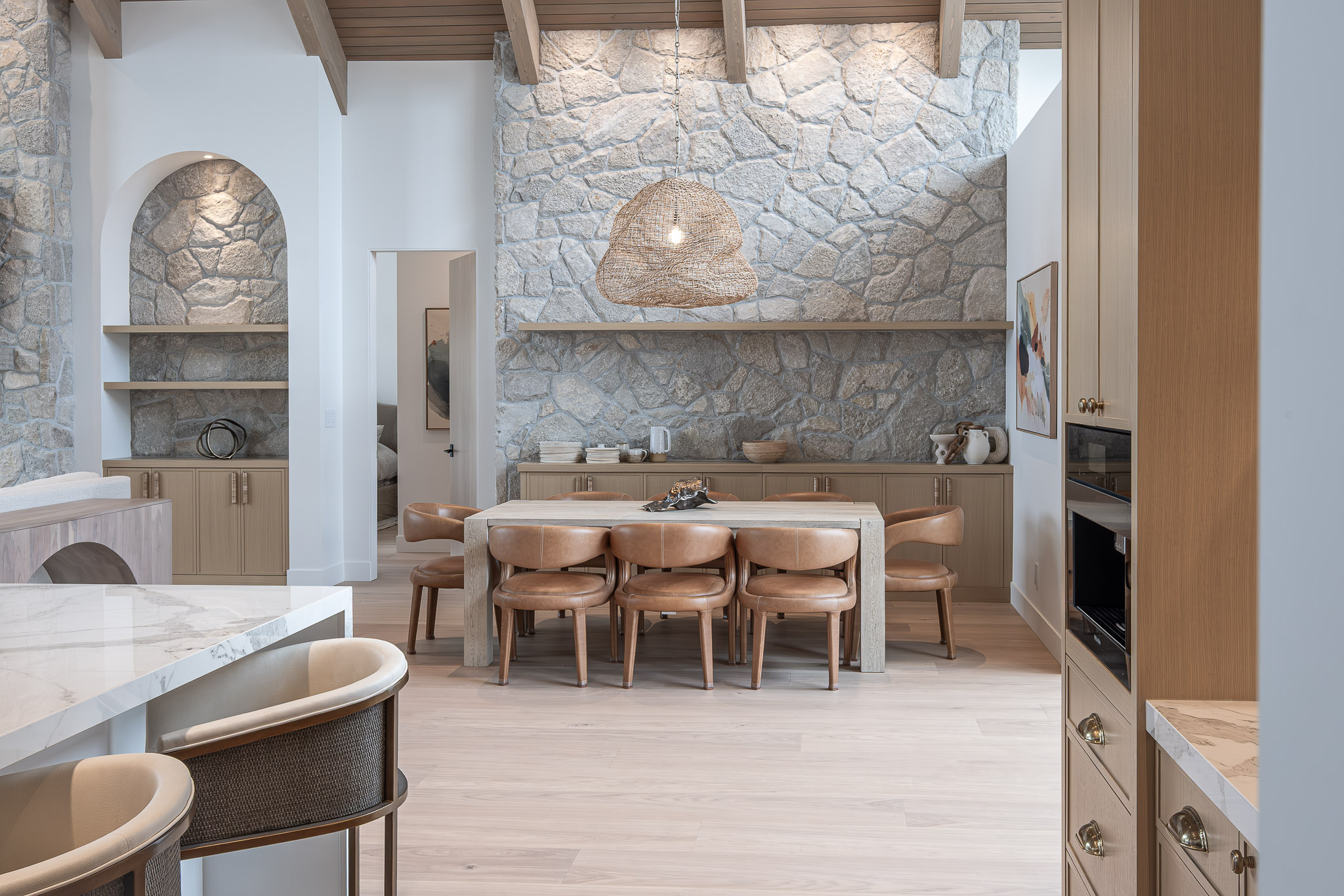 Repeating archways, a softly textured plaster hood, and built-in cabinetry that blends seamlessly into the structure of the home—every detail supports the home’s serene, grounded feel.