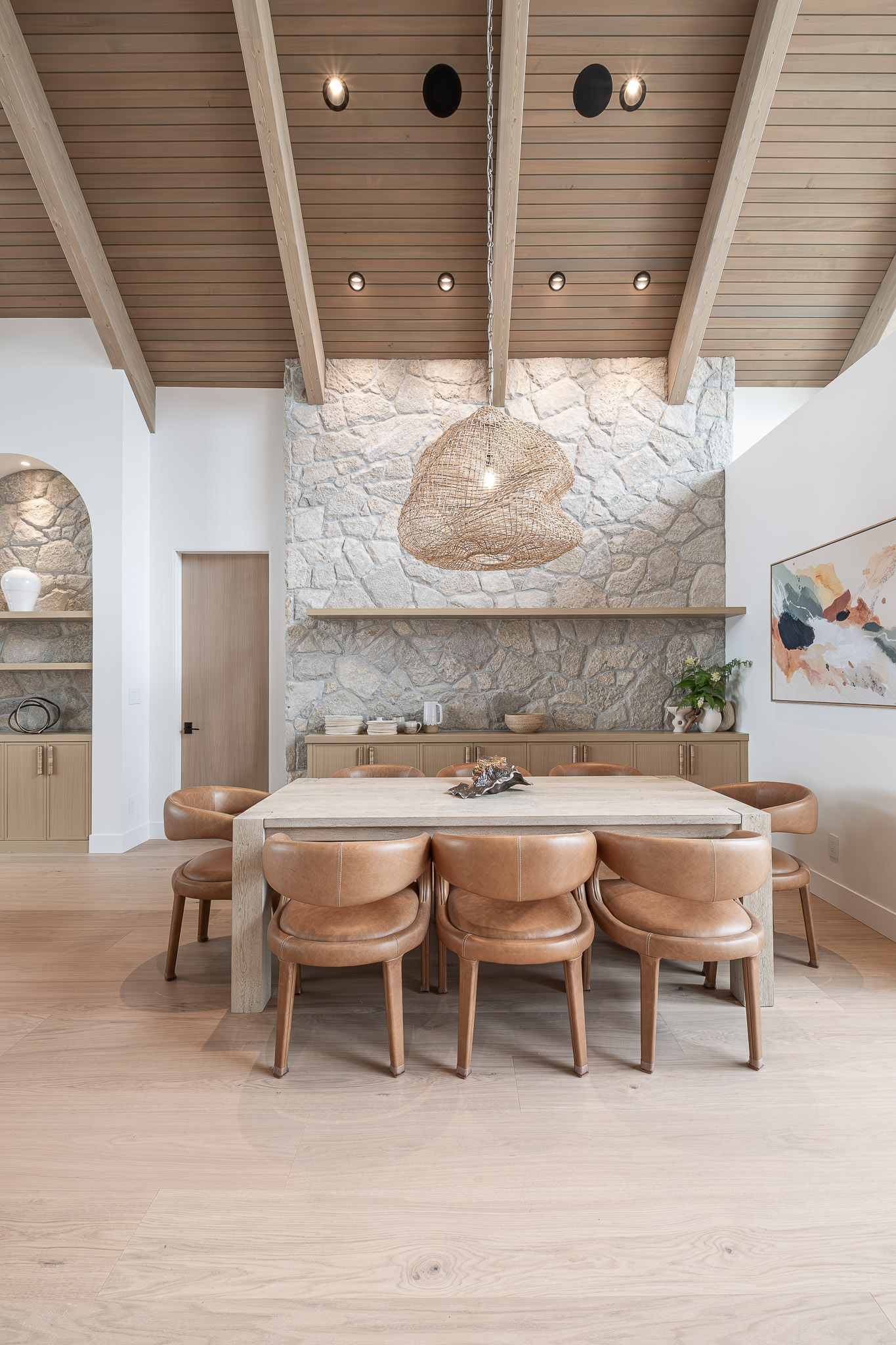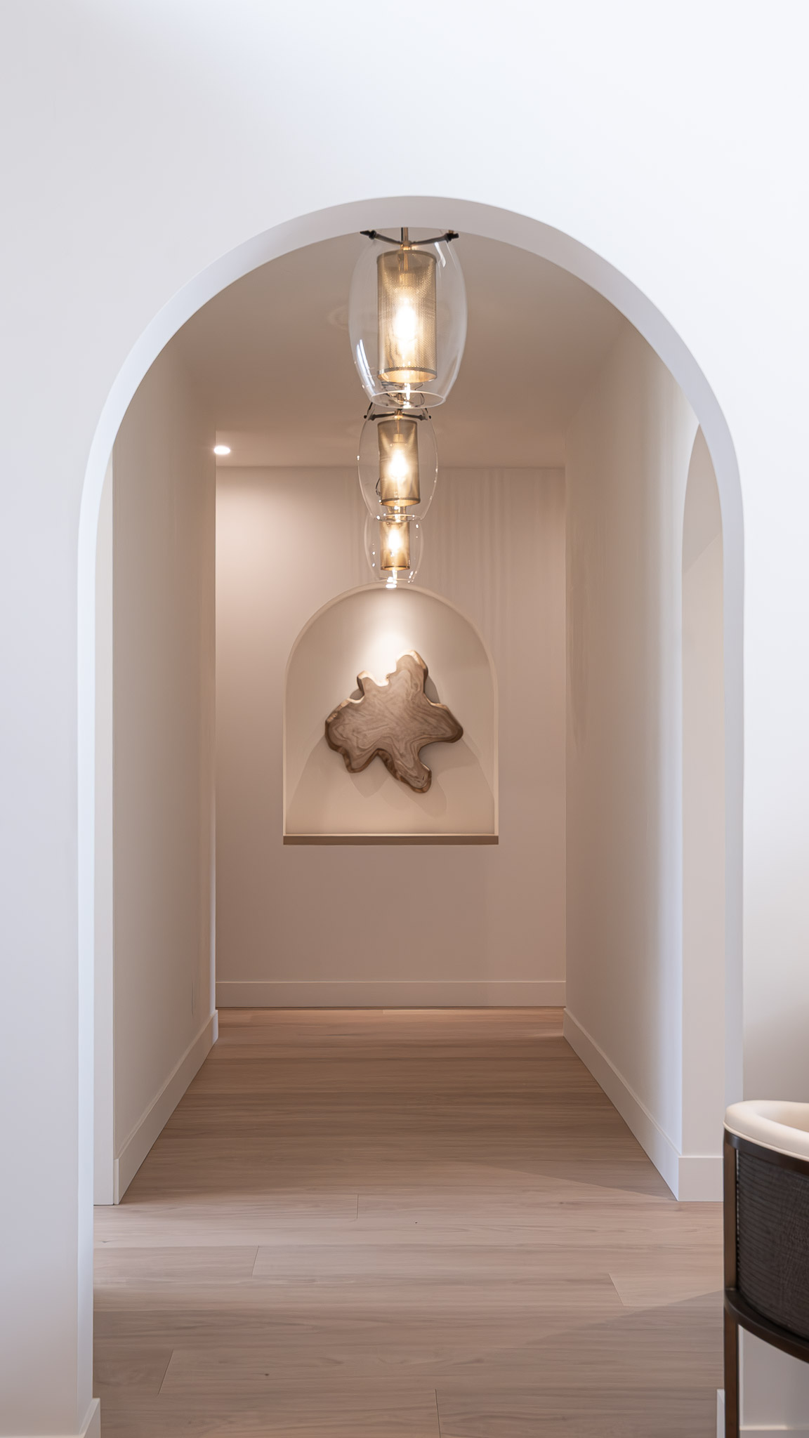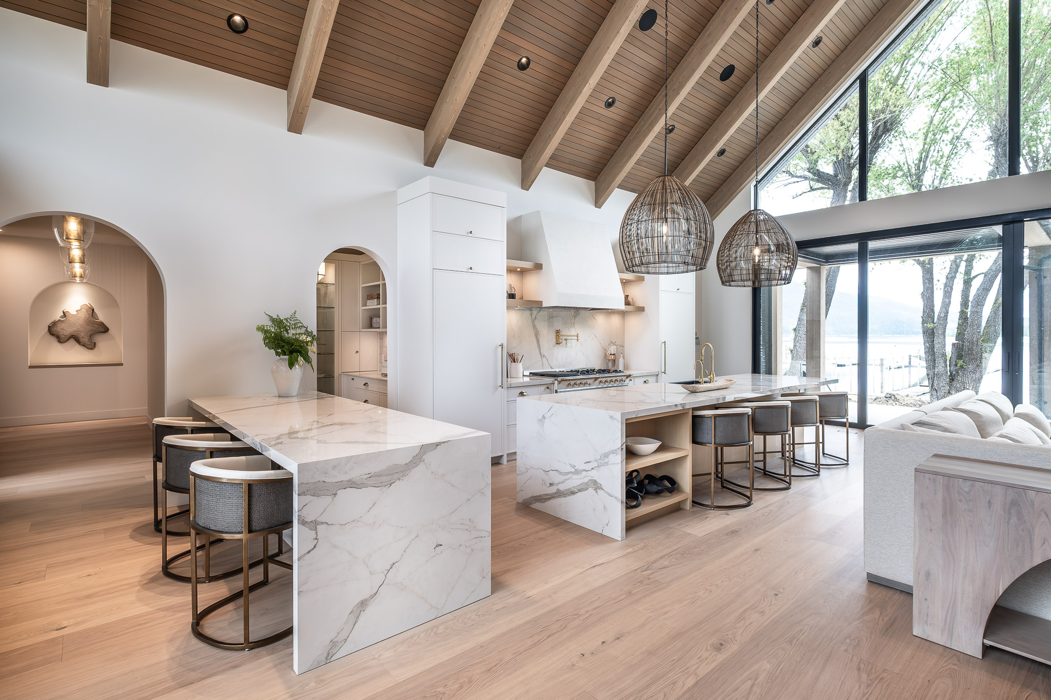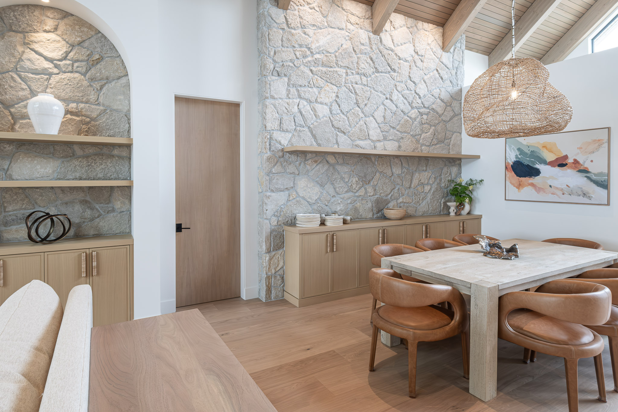 Repeating archways, a softly textured plaster hood, and built-in cabinetry that blends seamlessly into the structure of the home—every detail supports the home’s serene, grounded feel.