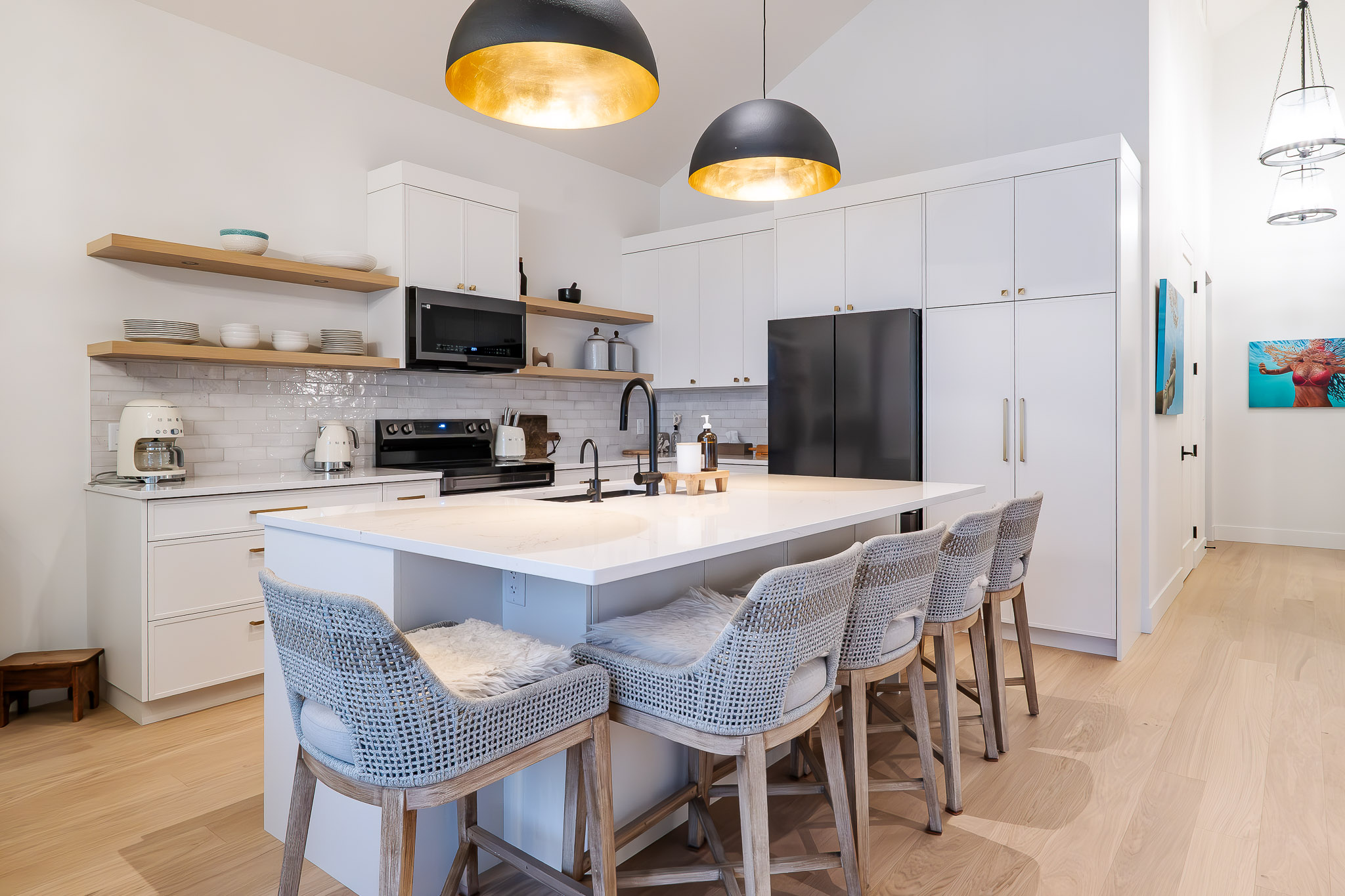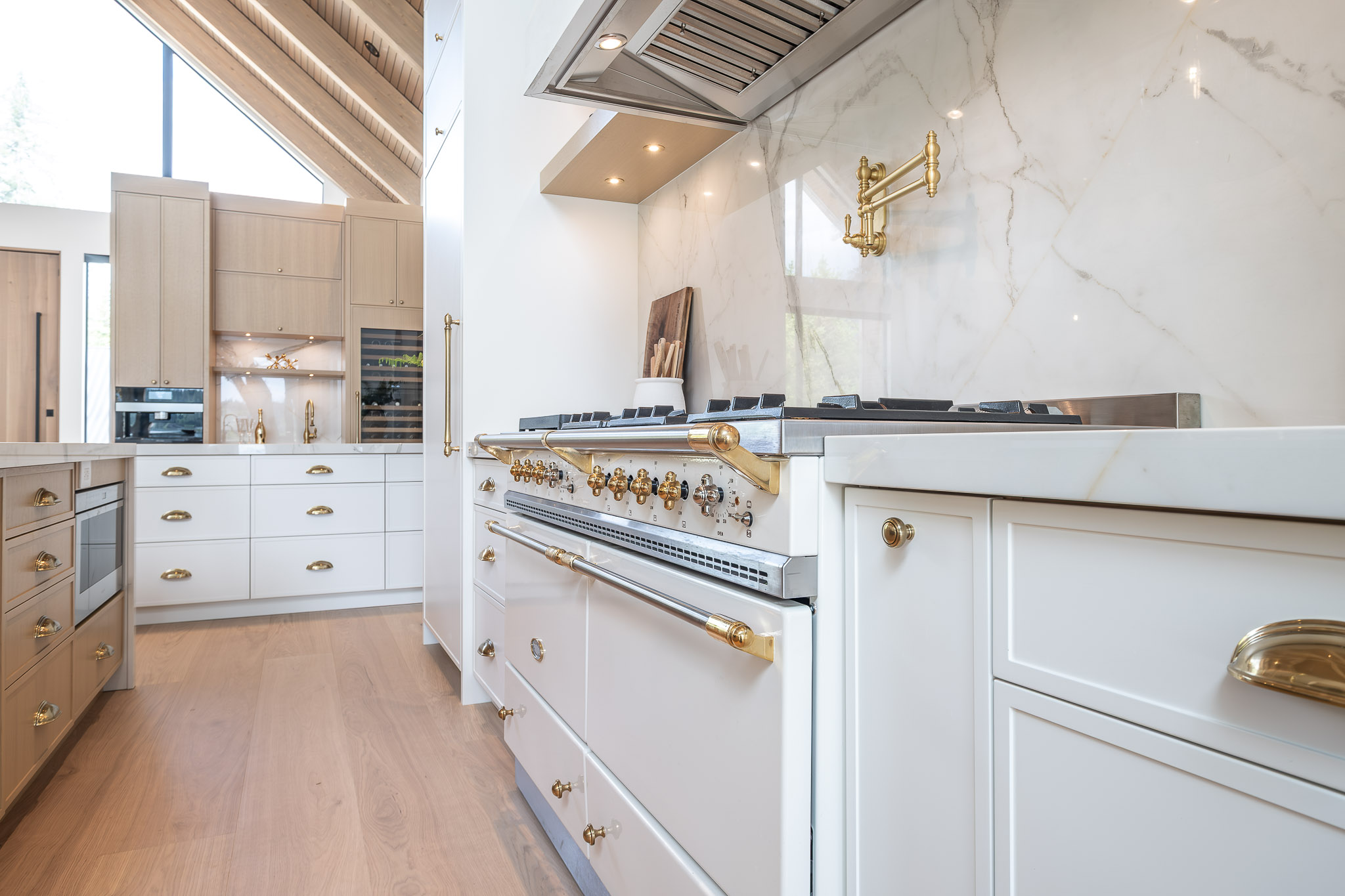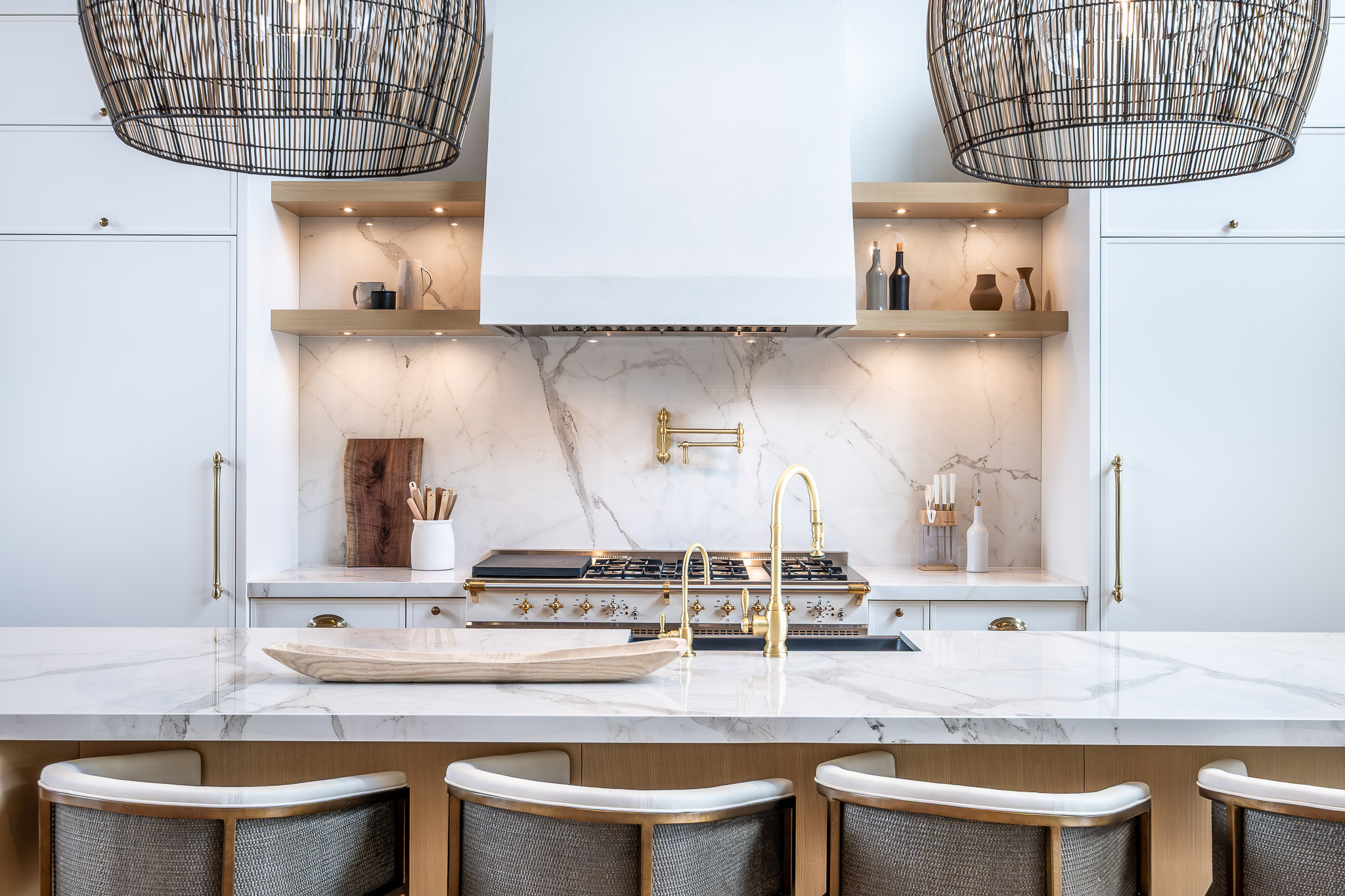 The kitchen is where beauty and function collide. It features a softly textured white plaster hood above a striking 55″ range by Sully Ranges. Thin rail-paneled fridge and freezer towers flank the range, blending into the cabinetry for a seamless finish. A Blanco Canada farmhouse sink from Blanco sits at the heart of the island, pairing beautifully with brushed brass hardware.