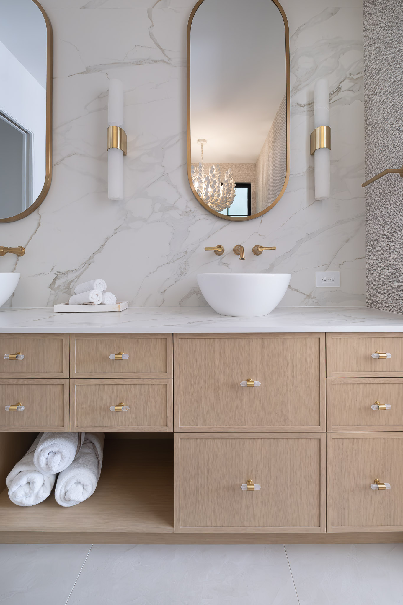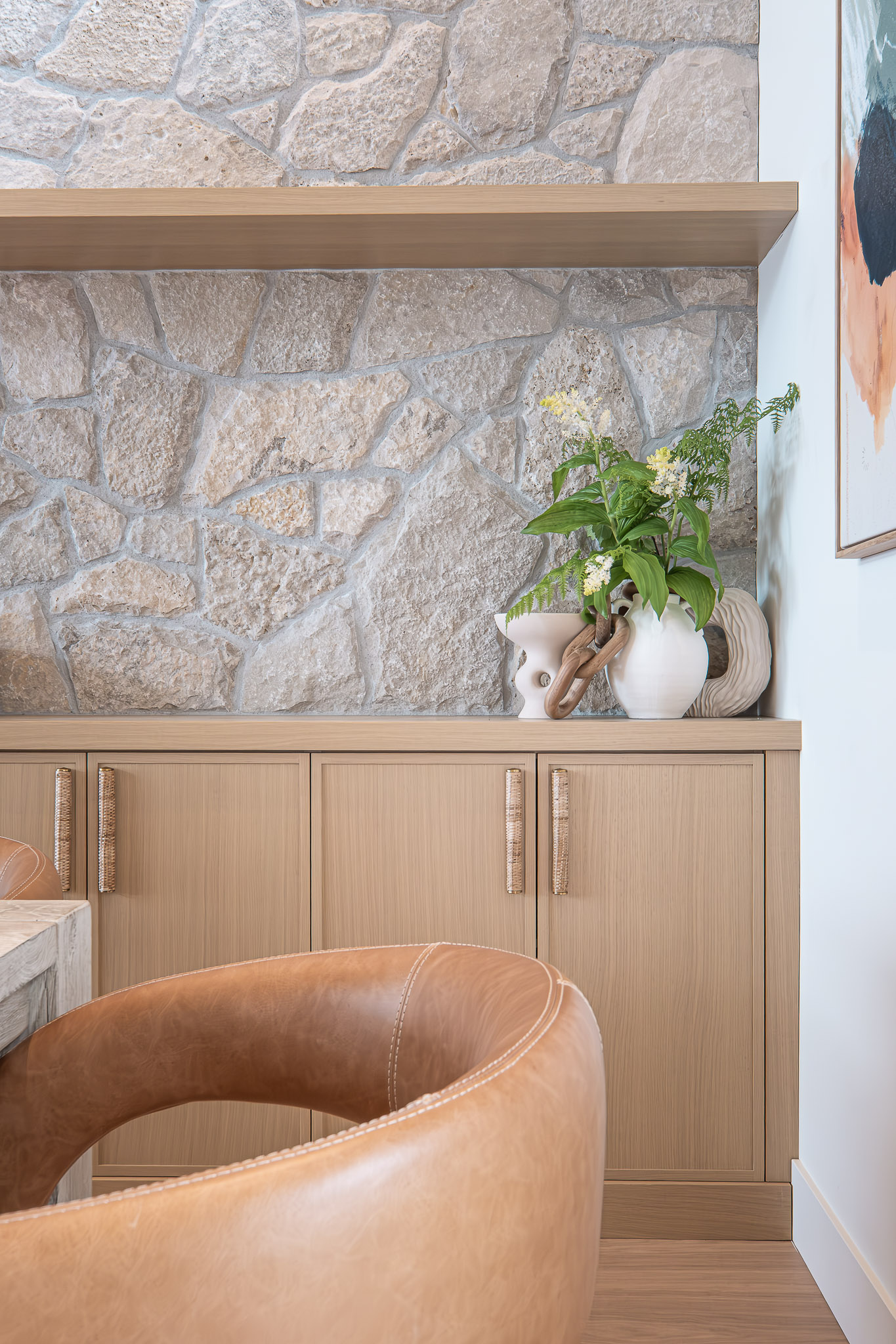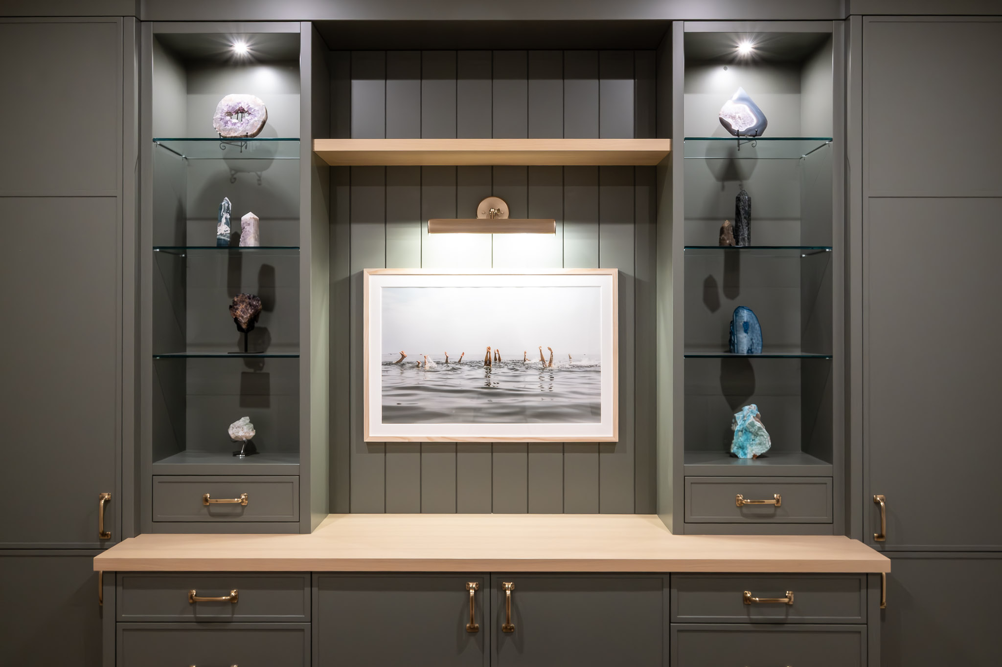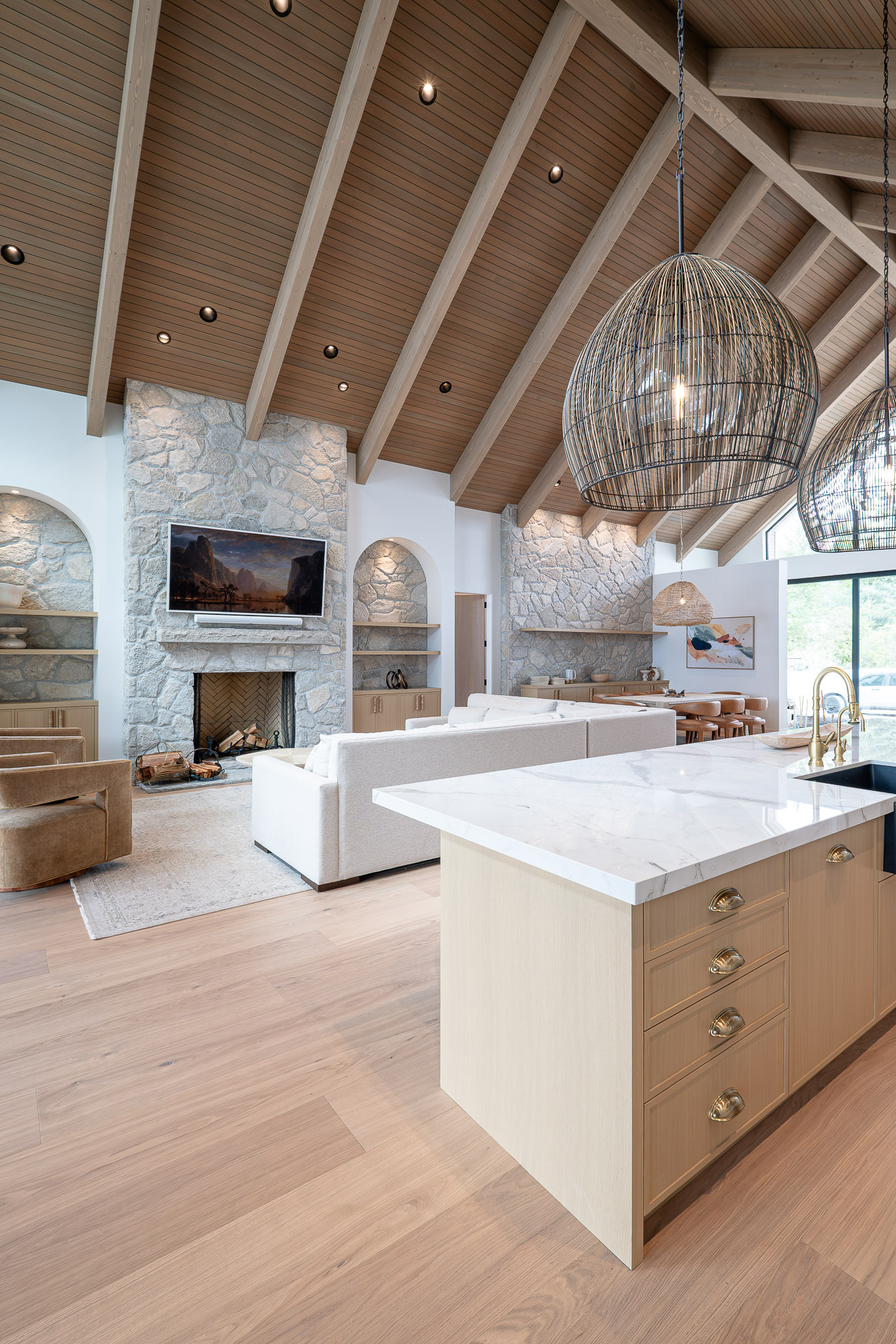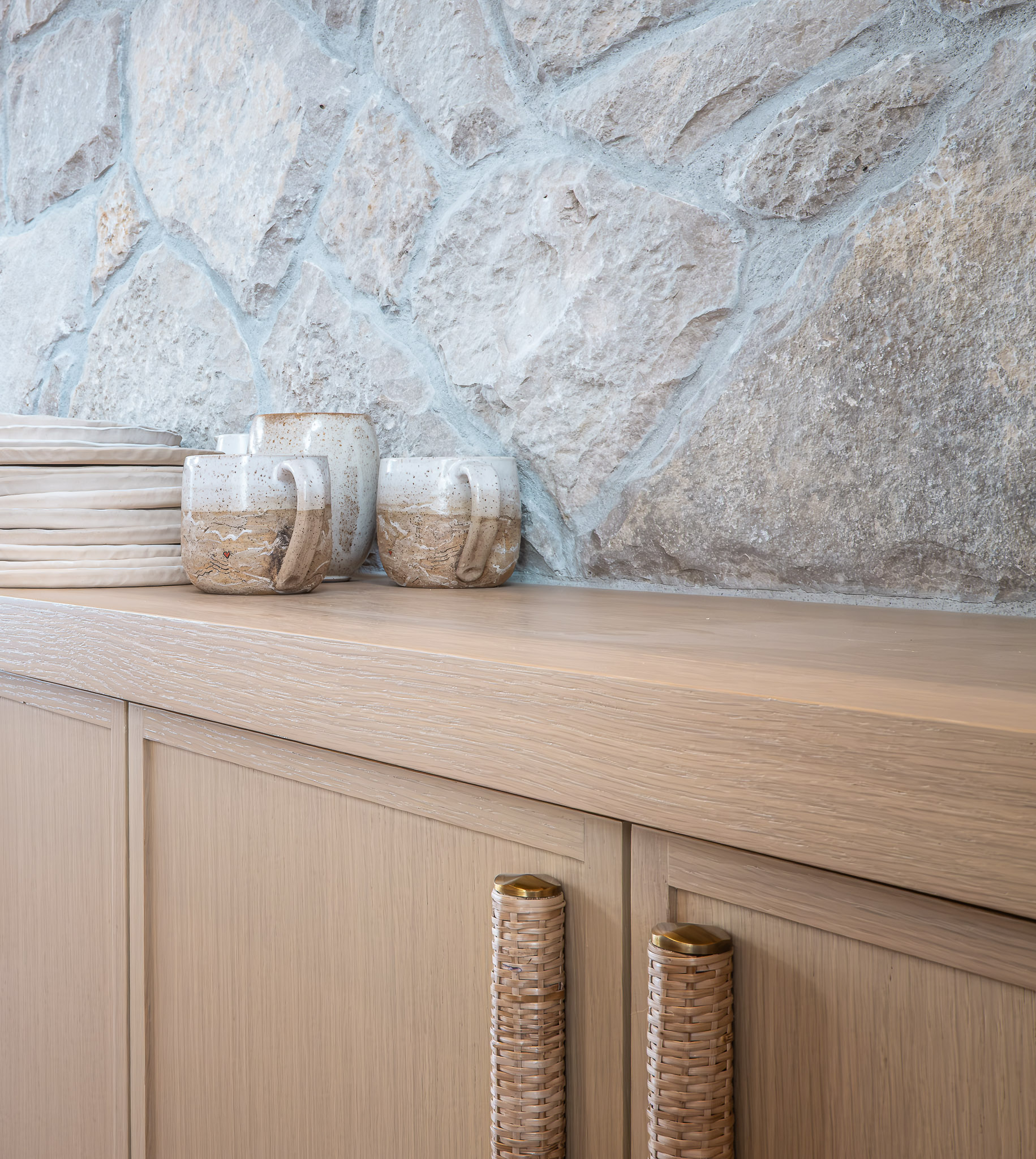 Rift-cut white oak cabinetry scribed to stone, natural quartz countertops, brushed golden brass hardware, and Benjamin Moore’s Rooftop Garden finish create warmth and textural harmony.